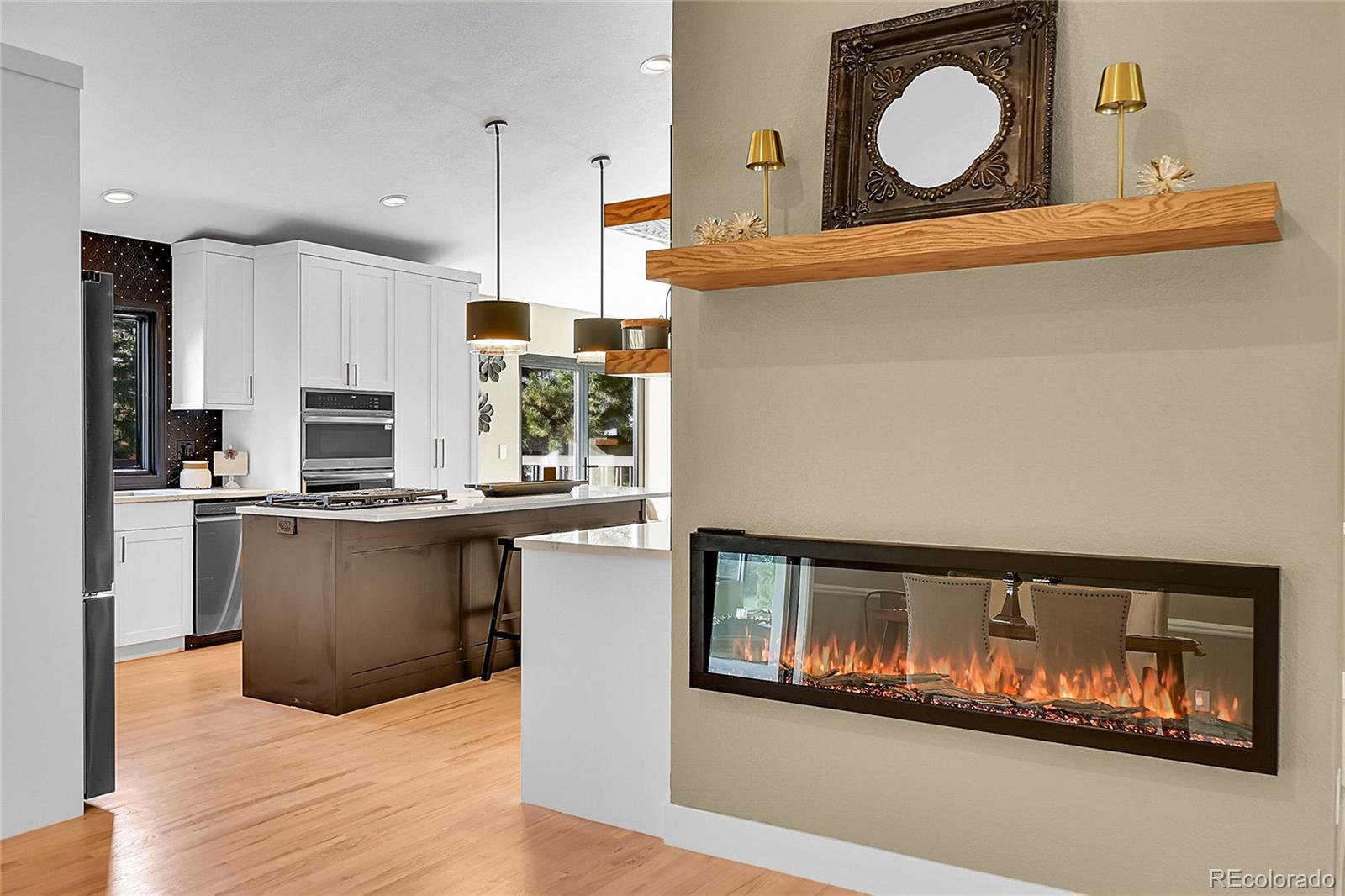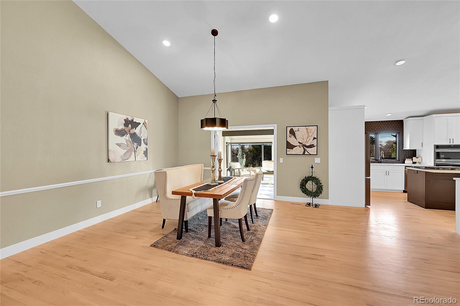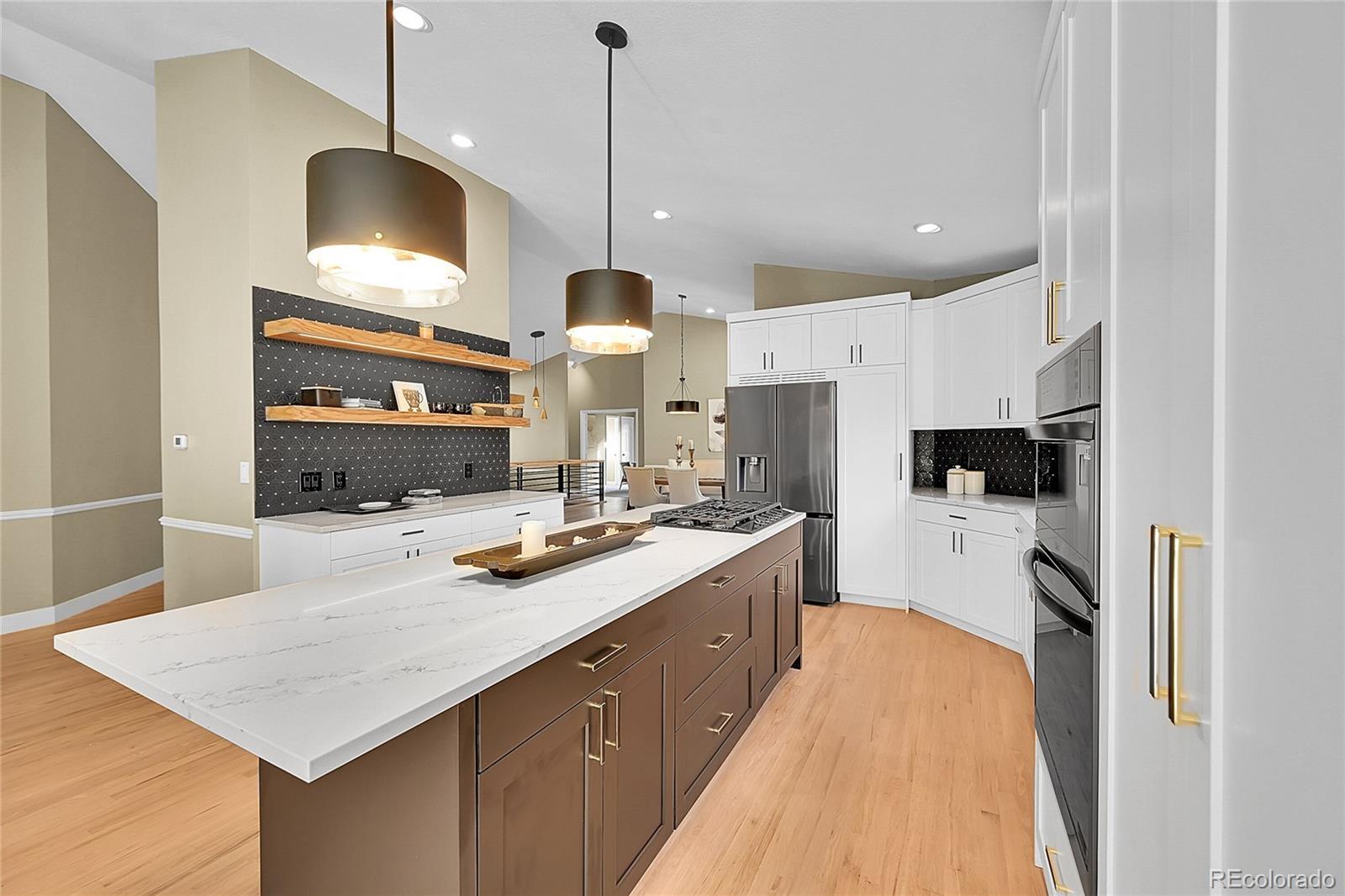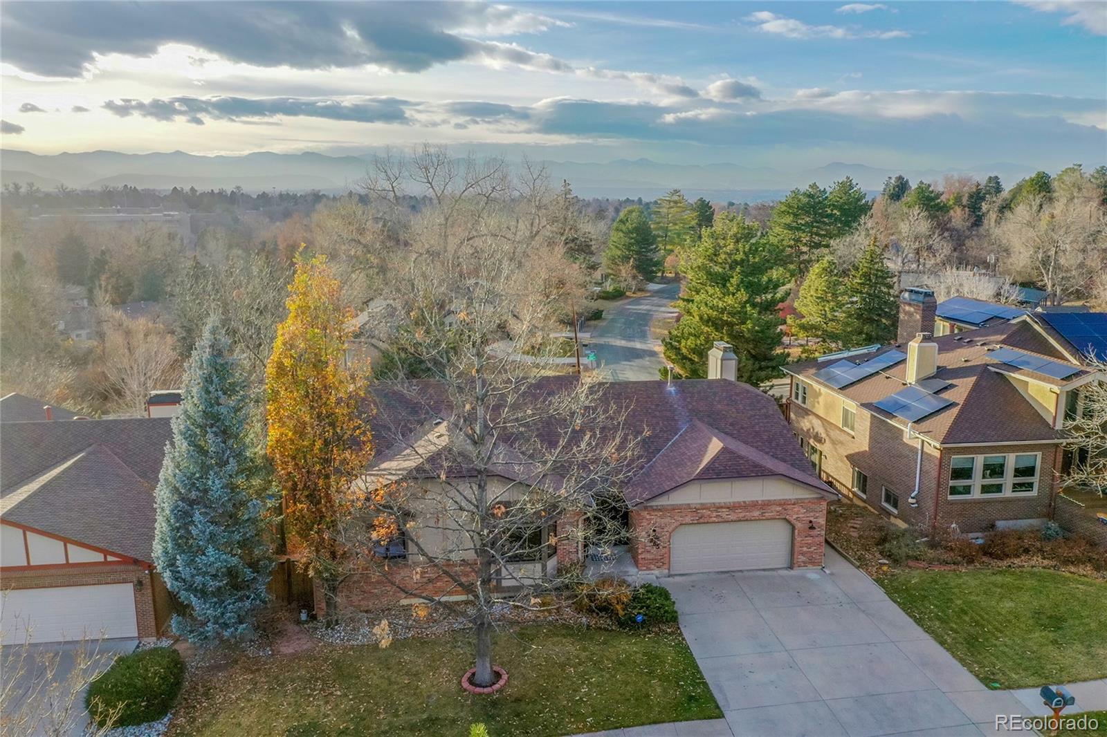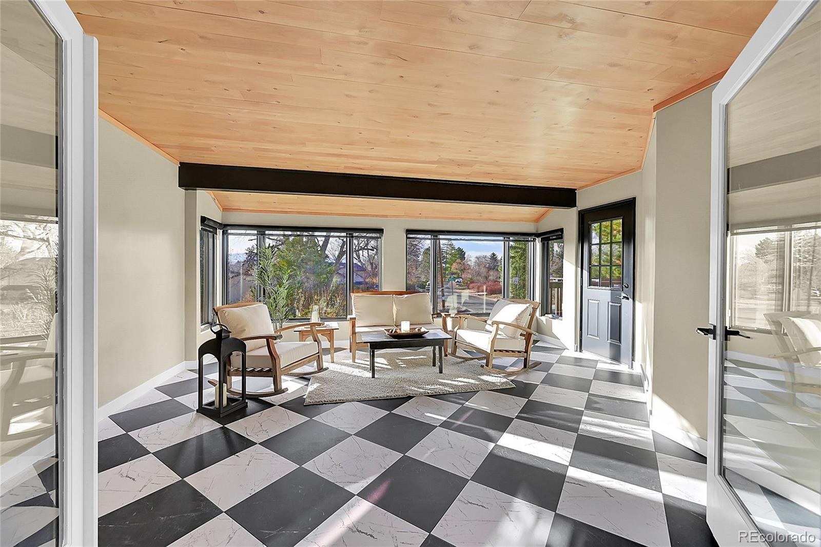 Welcome to this charming remodeled home situated in the Sundown Ridge community of Littleton. This ranch-style home boasts over 4,600 total square feet and features 5 bedrooms, 4 bathrooms, making it an ideal fit for a variety of living arrangements. Upon entering, you are welcomed by a grand foyer adorned with light-stained oak wood flooring with a beautiful wrought iron and wood staircase. The open-concept layout integrates the living room, dining area—which features an electric fireplace for added warmth and charm & a bright sunroom that showcases a beautiful knotty alder ceiling paired with striking black and white luxury vinyl tile flooring. The sunroom is bathed in natural light from its large windows, equipped with sun screens to ensure comfort during sunny days, truly the perfect spot for relaxation. The kitchen has custom white cabinetry, a spacious island, double ovens equipped with a microwave and air fryer, and a breakfast bar w/ stylish shelving above w/ under-cab lighting for a warm touch. Adjacent to the kitchen, the family room is anchored by a wood-burning fireplace & showcases a panoramic stacking door that opens up to west-facing views, enhancing the home’s connection to the outdoors. The walk-out basement adds versatility to the home, featuring two additional bedrooms—one is non-conforming room with a walk-in closet. This expansive basement includes multiple seating areas and boasts a wet bar with butcher block counters and a beverage center, creating an ideal space for entertaining or activities like pool or game nights. The main floor laundry room conveniently located off of the garage entrance features ample shelving, & butcher block counters. This charming home offers easy access to parks, the Highline Canal, Littleton Public Schools—truly a wonderful place to call home.