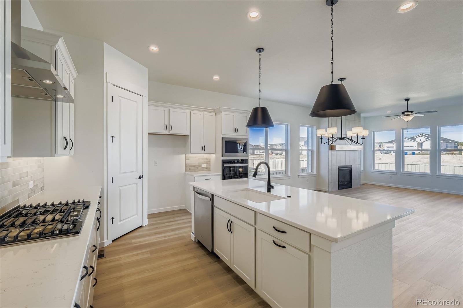 This charming ranch-style home, located in a quiet cul-de-sac, features an open concept design with 4 bedrooms, 3 full baths, and a 3-car garage. The heart of the home includes a spacious family room, dining area, and gourmet kitchen, perfect for entertaining. The kitchen boasts upgraded cabinets, an island, and high-end stainless steel appliances. The cozy family room highlights a floor-to-ceiling fireplace and large windows that fill the space with natural light. The main level also offers a convenient laundry area, a main bedroom suite with dual vanities, a soaking tub, and a walk-in closet, along with a guest bedroom and full bath. Downstairs, the finished basement offers a large rec room, two additional guest bedrooms, and a full bath, along with a beautiful wet bar. Throughout the home, you'll find upgraded countertops, fixtures, and custom closets with shoe racks. Other features include a tankless water heater and a 96% efficient furnace. This home is located next to Sand Creek and has great access to the trail system in Sterling Ranch! THIS HOME INCLUDES FULL LANDSCAPING AND FENCE!
