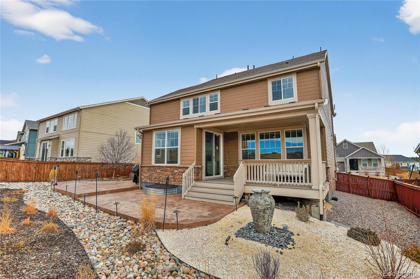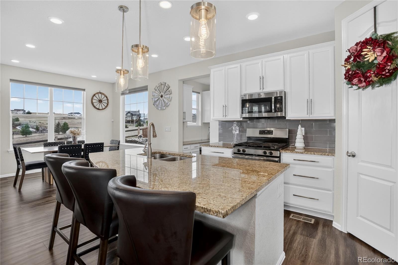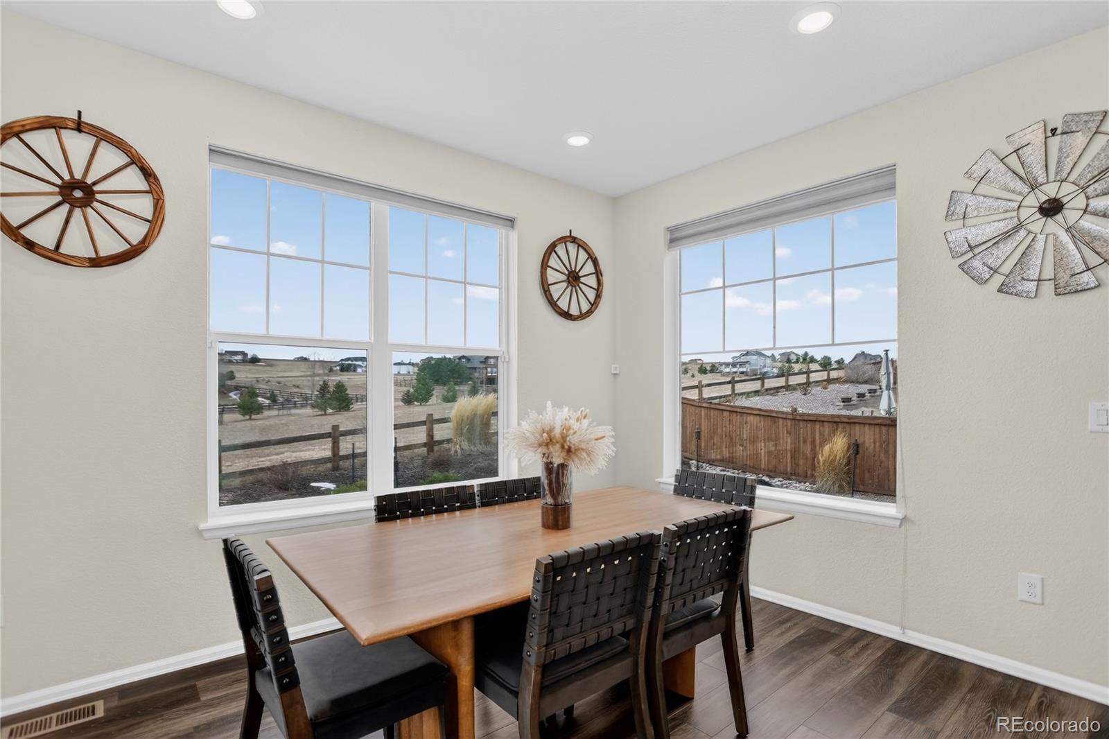 Move-in ready 2-story with rare 4-car garage, that backs to a 5-acre parcel! This home features 9' ceilings and LVP throughout the main level...expansive views out the wall of windows in the large living and dining rooms...kitchen with 42" white cabinets with crown molding, granite counters, subway tile backsplash, counter bar island with SS sink and decorator pendant lighting, corner pantry, ample recessed lighting and all SS appliances including gas range and newer touch screen French door fridge... 10'X6' built-in desk area off the garage...office/flex space overlooking the covered front porch...and convenient powder bath with pedestal sink. Upstairs, you'll find the 15'X15' primary suite with window wall and serene views, tray ceiling and ensuite bath with double sinks, lowered makeup vanity, roomy shower and 7'x10' walk-in closet...3 large additional bedrooms...one with an ensuite full bath, and two with walk-in closets and an expanded connecting Jack & Jill bath...and laundry room. The 1,216sqft unfinished basement offers 9' ceilings, bath rough in, dual AC systems and so many possibilities for finishing the space. Outside, you'll enjoy all the amenities of the thoughtfully landscaped backyard...17'X10' covered deck with custom live edge bar top, sun shades and rolling gate (perfect to help manage small children or pets)...multi-level stamped concrete patio...several water features...dog run...automated landscape lighting...and shaded front porch for those hot summer afternoons. 3 houses down from the playground at Gold Creek Valley Park, .6 miles to Walmart and less than 2 miles to the center of the Town of Elizabeth, too!