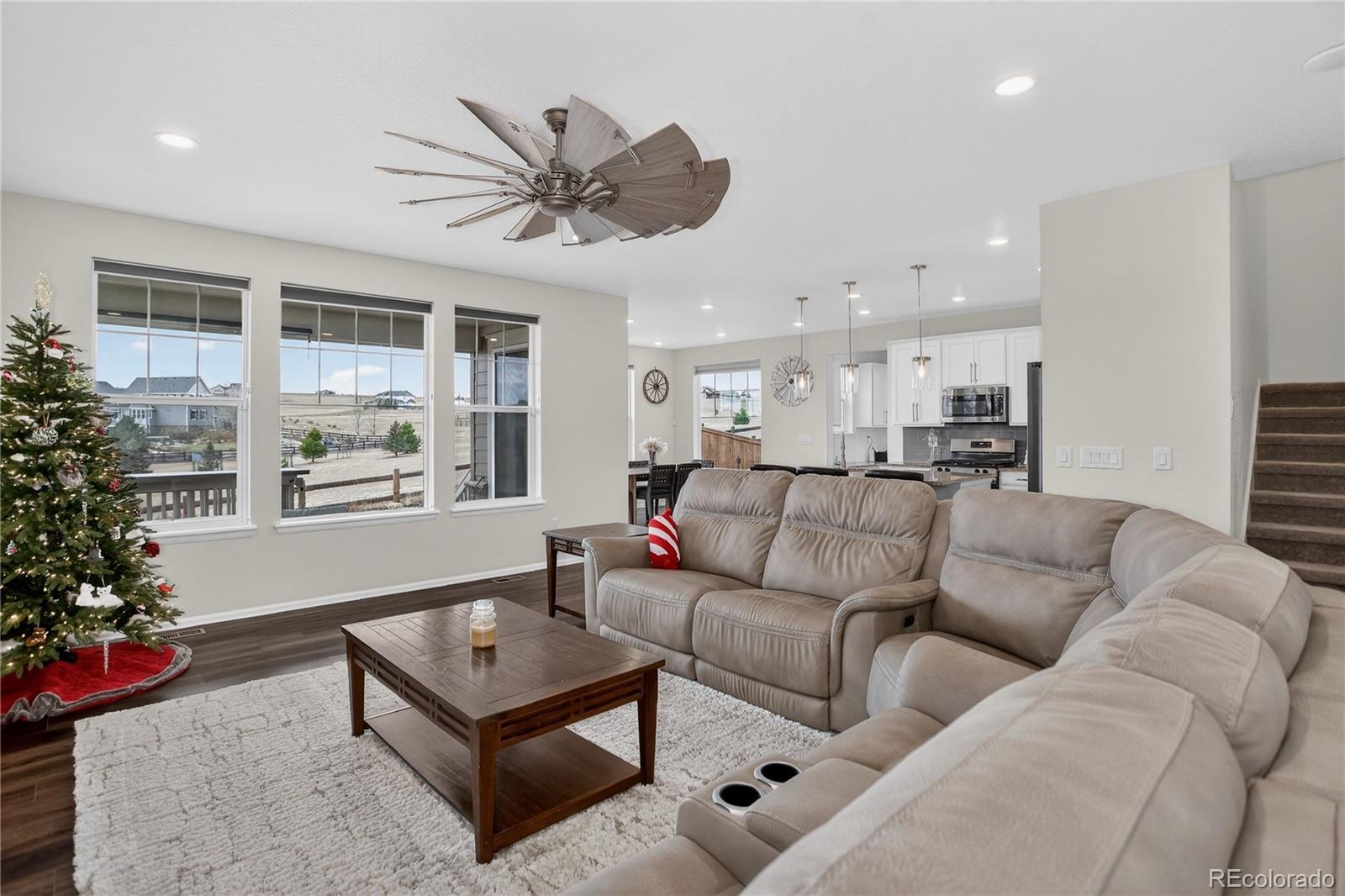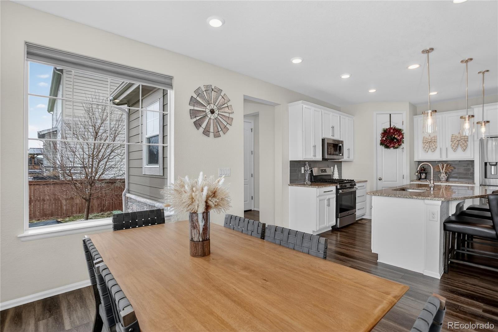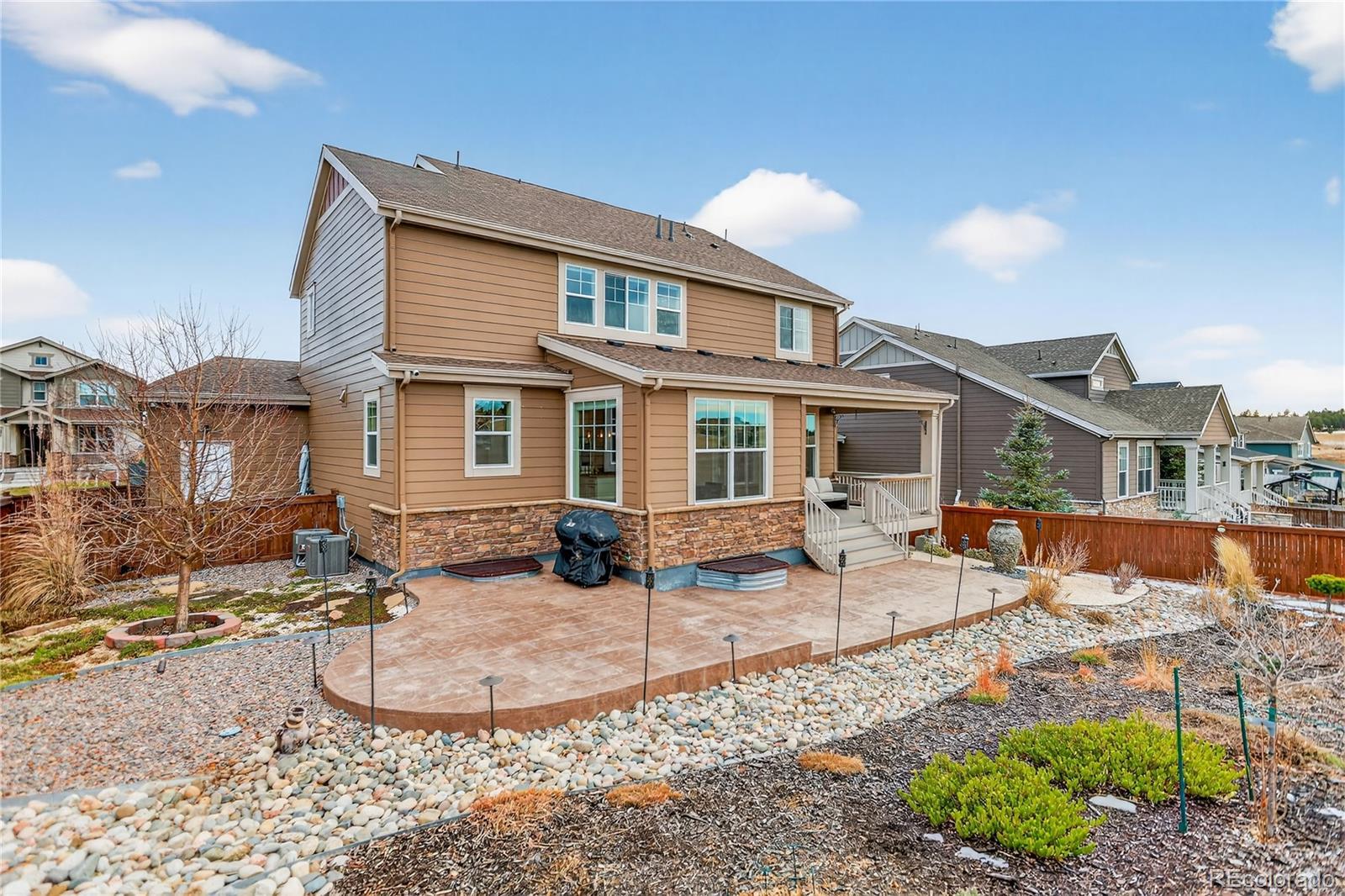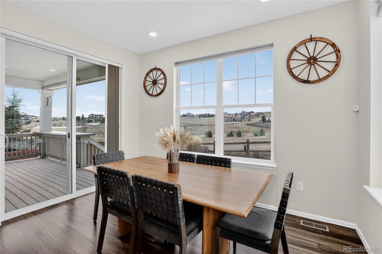 Move-in ready 2-story with rare 4-car garage, that backs to a 5-acre parcel! This home features 9' ceilings and LVP throughout the main level...expansive views out the wall of windows in the large living and dining rooms...kitchen with 42" white cabinets with crown molding, granite counters, subway tile backsplash, counter bar island with SS sink and decorator pendant lighting, corner pantry, ample recessed lighting and all SS appliances including gas range and newer touch screen French door fridge... 10'X6' built-in desk area off the garage...office/flex space overlooking the covered front porch...and convenient powder bath with pedestal sink. Upstairs, you'll find the 15'X15' primary suite with window wall and serene views, tray ceiling and ensuite bath with double sinks, lowered makeup vanity, roomy shower and 7'x10' walk-in closet...3 large additional bedrooms...one with an ensuite full bath, and two with walk-in closets and an expanded connecting Jack & Jill bath...and laundry room. The 1,216sqft unfinished basement offers 9' ceilings, bath rough in, dual AC systems and so many possibilities for finishing the space. Outside, you'll enjoy all the amenities of the thoughtfully landscaped backyard...17'X10' covered deck with custom live edge bar top, sun shades and rolling gate (perfect to help manage small children or pets)...multi-level stamped concrete patio...several water features...dog run...automated landscape lighting...and shaded front porch for those hot summer afternoons. 3 houses down from the playground at Gold Creek Valley Park, .6 miles to Walmart and less than 2 miles to the center of the Town of Elizabeth, too!