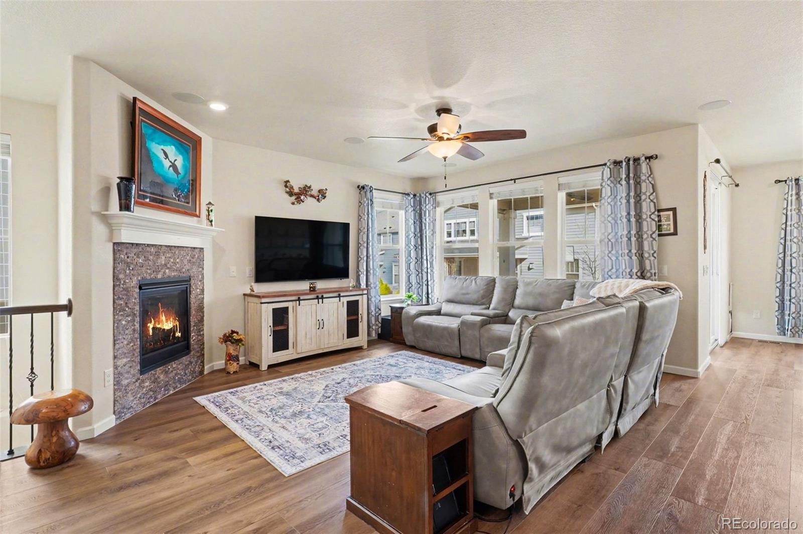 Open House Saturday, 3/7 from 11-2! Experience the perfect blend of style and low-maintenance living in this stunning 5-bedroom home in Aurora’s sought-after Copperleaf community. The open-concept floor plan with gorgeous, recently updated LVP flooring and soaring 9-foot ceilings on the main level centers around a cozy gas fireplace and flows effortlessly into a gourmet kitchen outfitted with granite countertops, a walk-in pantry, and a large island with bar seating. The main floor offers ultimate convenience with a dedicated laundry room and a private primary suite featuring a spa-like soaking tub and a massive walk-in closet with a custom built-in organizing system. Two additional bedrooms share a recently remodeled bathroom, and all bedrooms feature brand-new carpet. Custom blinds throughout the home provide both comfort and privacy, while the main level and basement are wired for surround sound and the home is pre-wired for internet and TV for modern connectivity. Descend to the expansive finished basement—also featuring 9-foot ceilings and designed for entertaining—complete with a sleek wet bar, a home theater, a full bathroom, and two additional bedrooms, perfect for guests. Your outdoor oasis awaits on the large covered Trex deck, overlooking a fully fenced yard with turf xeriscaping for year-round greenery without the yard work. Central air and a whole-house water filtration system add to the home's comfort and convenience. Located in the prestigious Cherry Creek School District, you’re just minutes from the shopping and dining at Southlands, the recreation of Aurora Reservoir, and quick access to E-470.