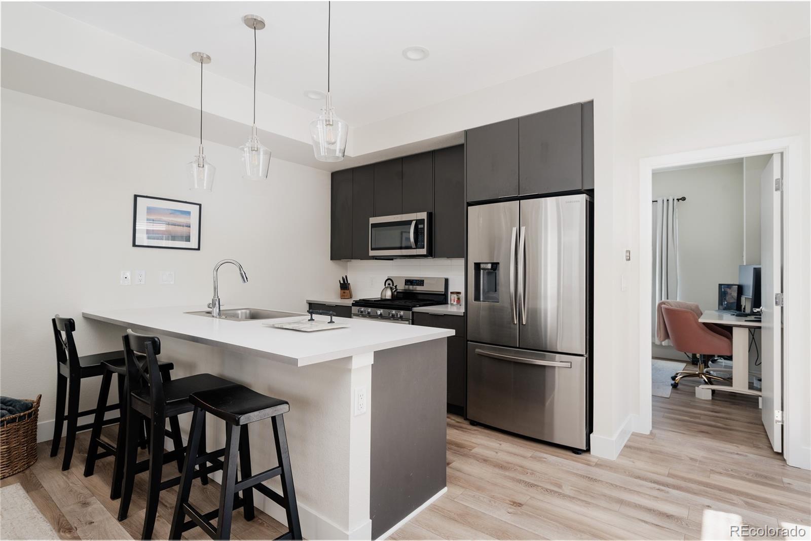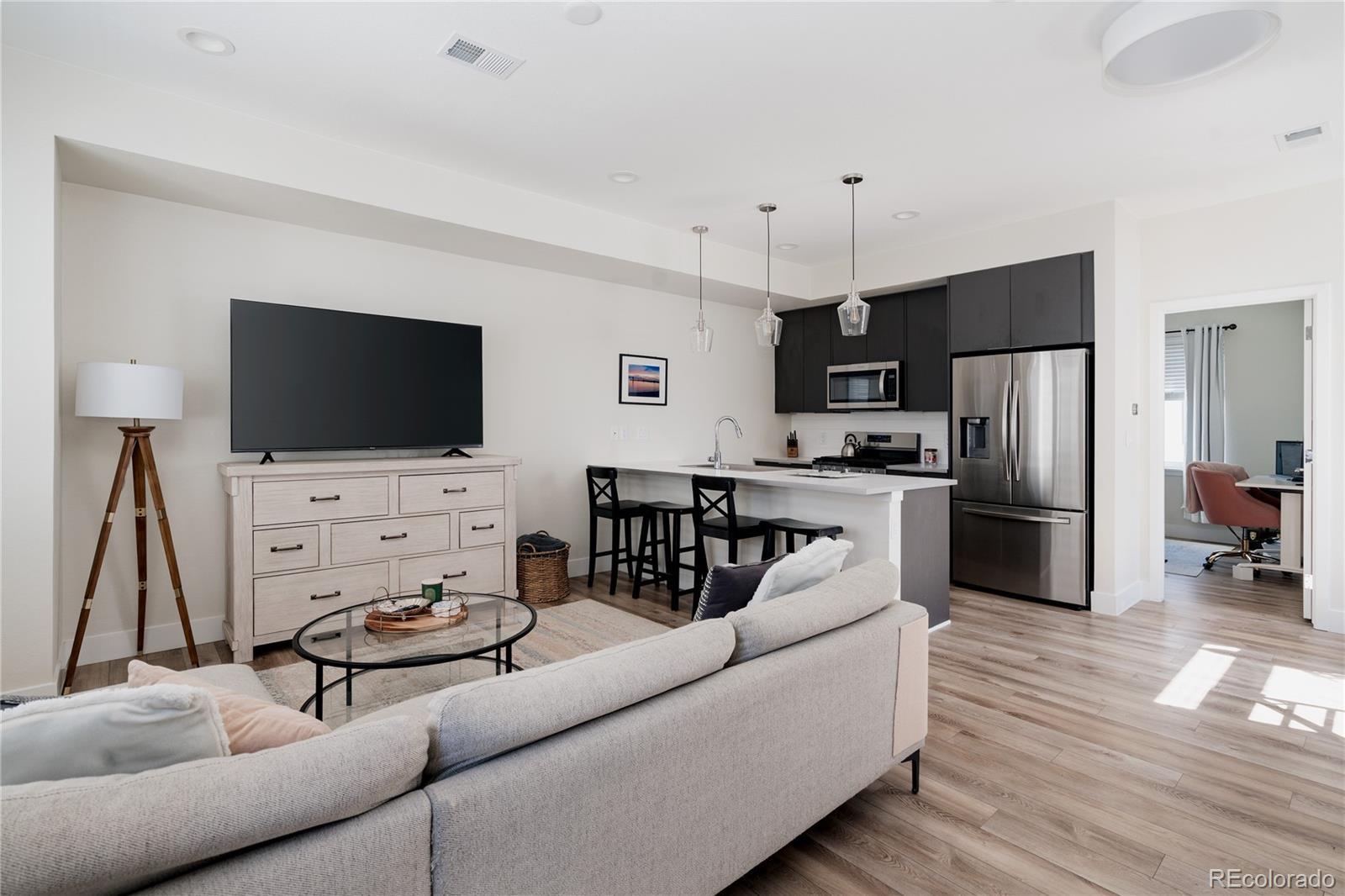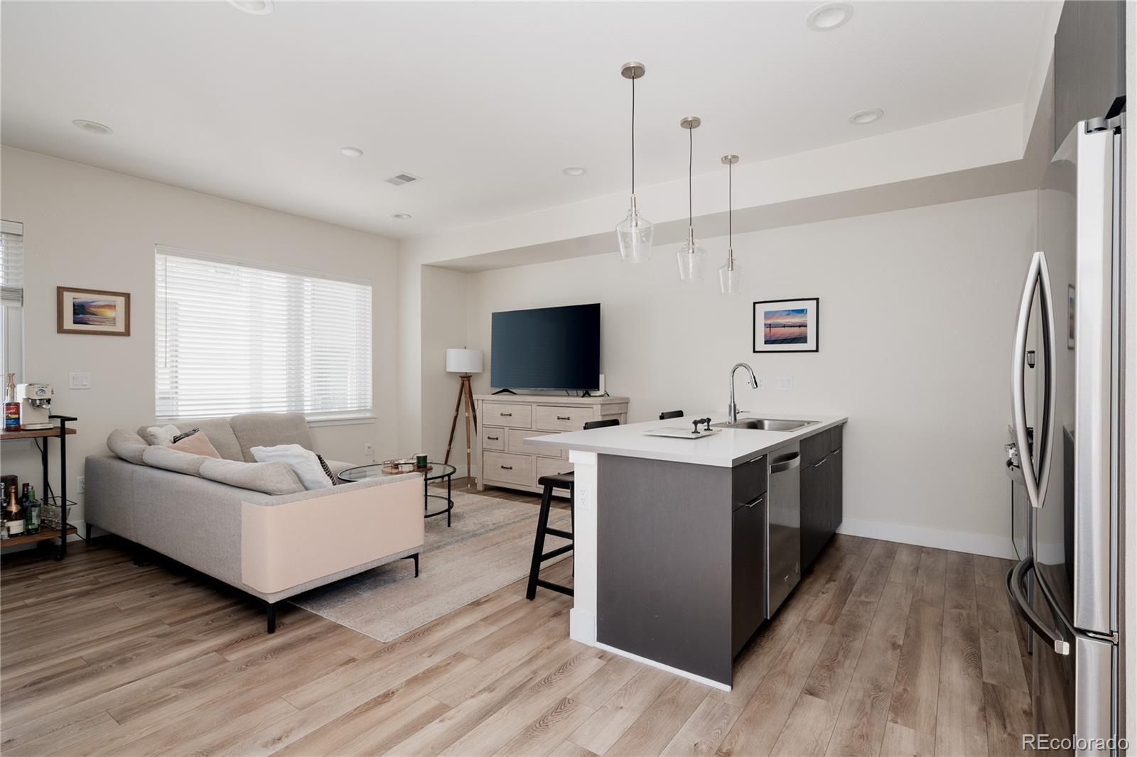 FOR SALE OR FOR RENT: Welcome to Parkview Residences, where modern design meets easy Lakewood living. This end unit townhome is filled with natural light and thoughtfully designed spaces that make everyday life feel just a little more elevated. From the moment you walk in, you’re greeted by a functional entry way and drop zone just off the attached two car garage. Upstairs is where the home really opens up. The home features hard surface flooring throughout and large windows that pour in natural light all day long. The kitchen is sleek and modern with stainless steel appliances, generous bar seating, and plenty of space to gather. Whether you’re hosting friends, opening a bottle of wine, or just making a quick weeknight dinner, this space makes it easy. The living room flows effortlessly from the kitchen, creating a bright and comfortable entertaining space that feels both stylish and relaxed. You’ll also find an additional bedroom and full bathroom on this level with a tub and shower. Perfect for guests, a home office. Head upstairs to your private retreat. The primary suite offers a peaceful space to unwind with double sinks and a closet that deserves a moment of appreciation. Laundry is conveniently located on this floor too. Don't forget to step outside to your private deck with mountain views — perfect for morning coffee, sunset drinks, or just taking a minute to relax. Modern finishes, thoughtful design, and low maintenance living all wrapped into one beautifully designed home in the heart of Lakewood. Close to parks, trails, shopping, dining, and easy access to both downtown Denver and the mountains. Easy living, great design, and a little Colorado magic. Reach out for more information on rental opportunity $3,000 a month