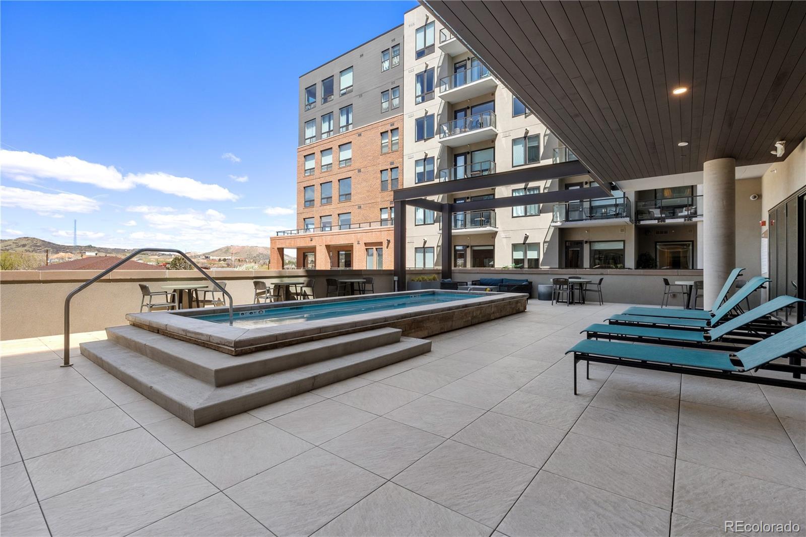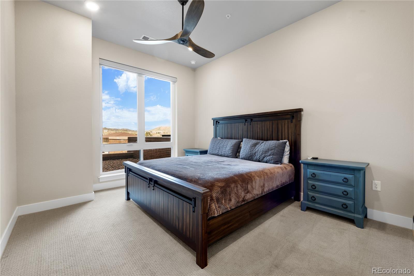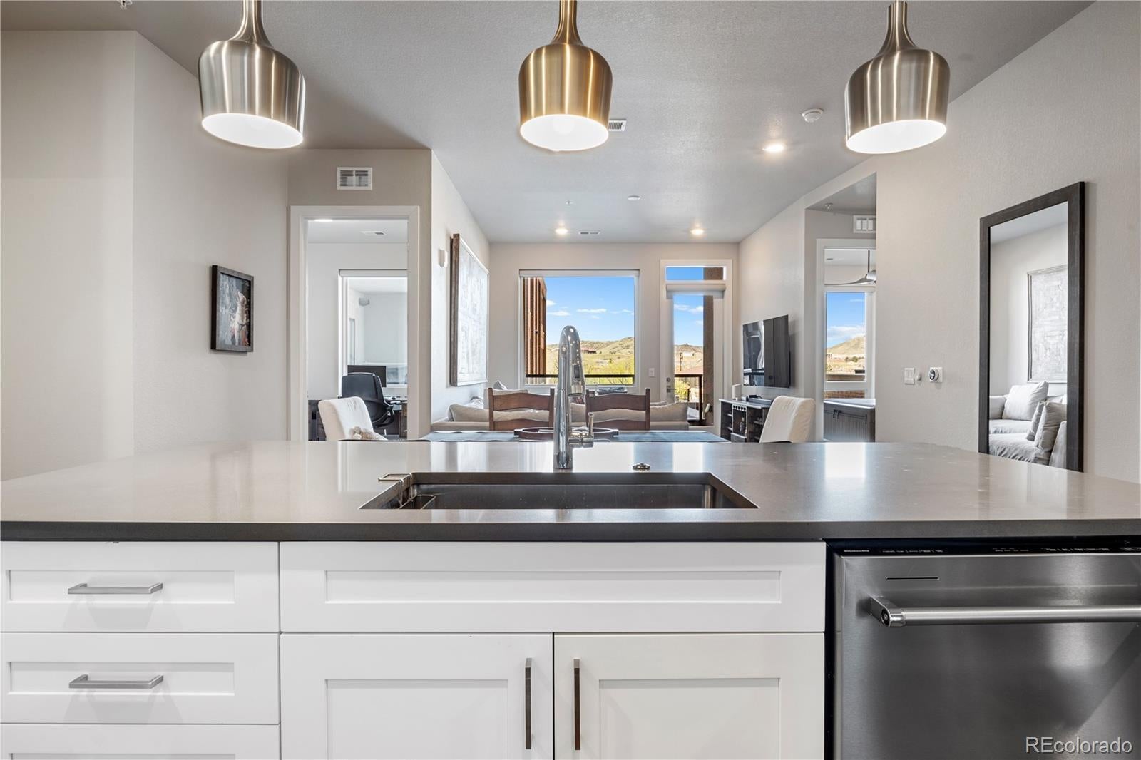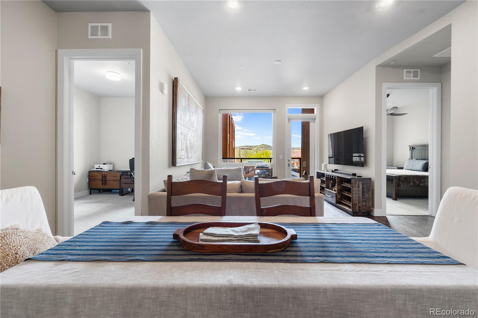 Incredible opportunity to live in the bustling and fun Encore downtown Castle Rock! Don't let this pass you up! ** SHORT SALE OPPORTUNITY ** Imagine being steps to restaurants, shops, cafes, salons, and Festival Park -- where there are weekly events such as Farmer's Markets, Art Shows, and live music. A true downtown lifestyle in the highly-desirable Encore building, right in the heart of downtown Castle Rock. The newly-built condo building features a contemporary and sophisticated design and offers amazing amenities that cater to everyone. This 2nd floor unit has an ideal, west-facing direction overlooking the courtyard with scenic, hilltop views. Stylishly designed and beautifully updated with upgrades, the condo features premium, Hunter Douglas electronic blinds, Google smart home technology, newly installed laundry room storage, and includes two deeded parking spaces. The open floorplan has coveted 10-foot ceilings and is oriented around generously-sized windows with views. The stunning kitchen showcases slab quartz countertops, stainless-steel KitchenAid appliances, and a large center island with seating, plus the adjacent dining area is large enough for entertaining. The spacious primary bedroom features an ensuite luxury bathroom, equipped with frameless glass shower, quartz countertops, and double vanity. Living at the Encore is truly a lifestyle. The amenities include a well-equipped fitness center, clubhouse with kitchen and pool table, 25-person jacuzzi, lounge with golf simulator, dog park, pet spa, outdoor lounging areas with fire pits and grills, and sleek common areas for working or relaxing. Onsite security and key fob entry keeps the building safe and secure and the units have smart, keypad locks for easy access, and two deeded parking spaces come with the unit. The location offers an easy commute to Denver, DTC, or Colorado Springs and there’s so much to do right at your fingertips. This is the best of luxury and low-maintenance living.