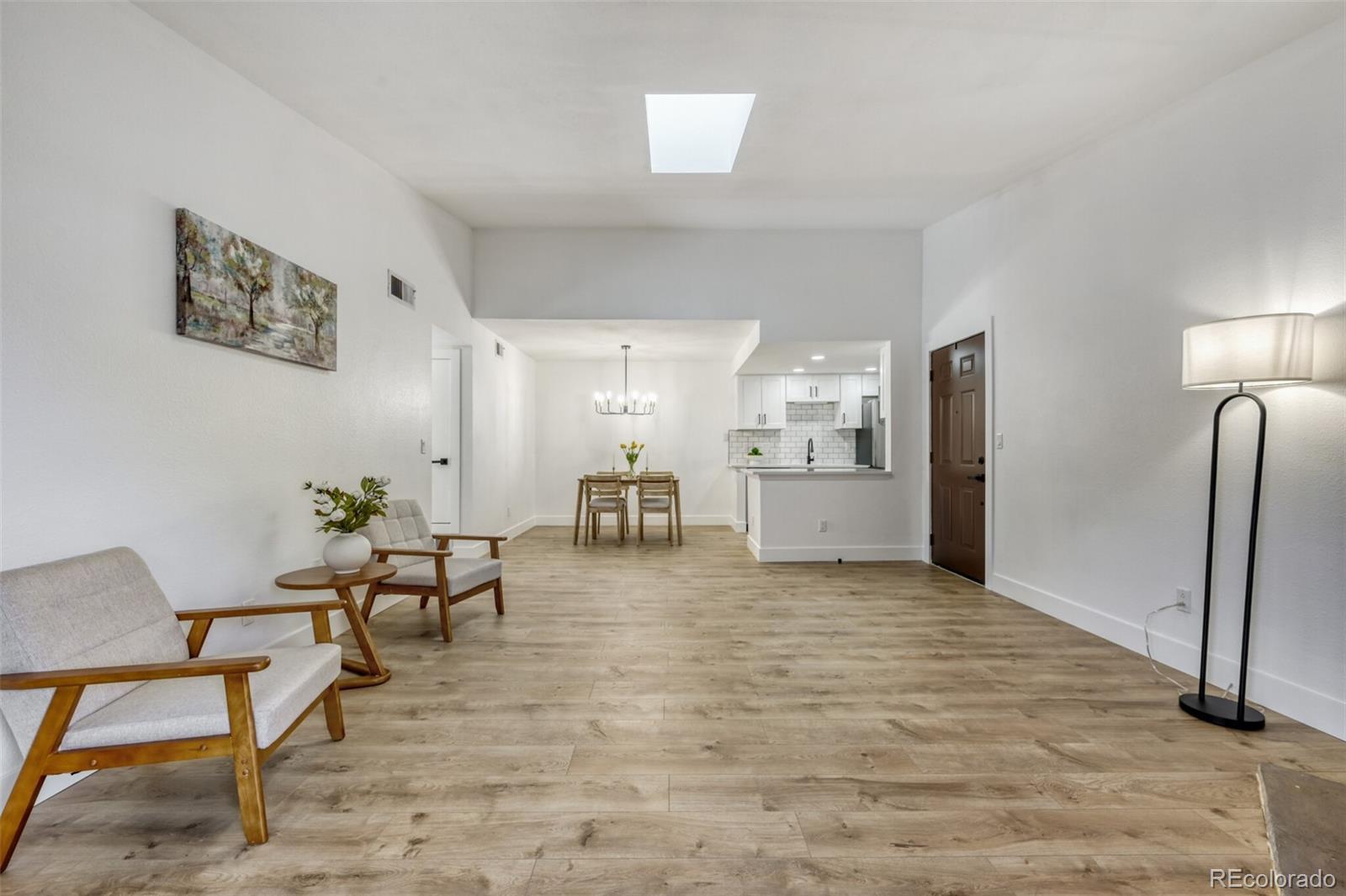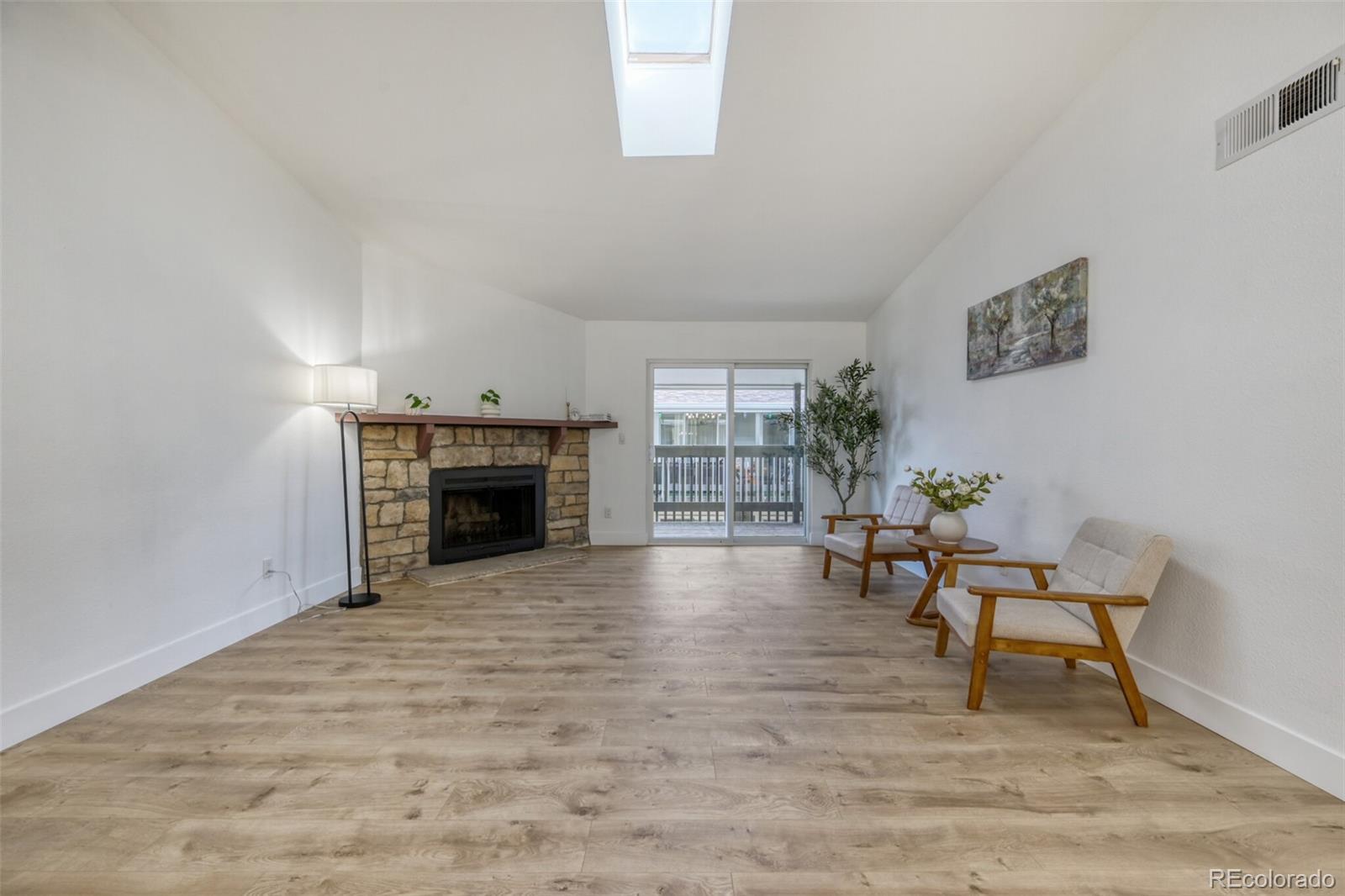 FABULOUS 2nd-Floor Condo – Move-In Ready! Enjoy bright, open living in this beautifully updated 2nd-floor condo. The living room features a vaulted ceiling, skylight, and a cozy stone-surround fireplace, creating a warm and inviting space filled with natural light. The open layout seamlessly connects the living, dining, and kitchen areas—perfect for entertaining or relaxing at home. The kitchen boasts stainless steel appliances, brand-new cabinets, and sleek quartz countertops. Both bathrooms have been fully remodeled, and the primary suite offers a private bath and spacious walk-in closet. A second bedroom, second bath, and included washer/dryer complete the thoughtful layout. Step outside to your private patio and enjoy access to the community pool and clubhouse. Newer windows, patio doors, and AC add comfort and efficiency. Conveniently located near Meadow Hills Golf Course, Cherry Creek Reservoir & State Park, Kennedy Golf Course, I-225, light rail, and bus lines, with easy access to shopping, dining, and top-rated schools. Hot water included in HOA