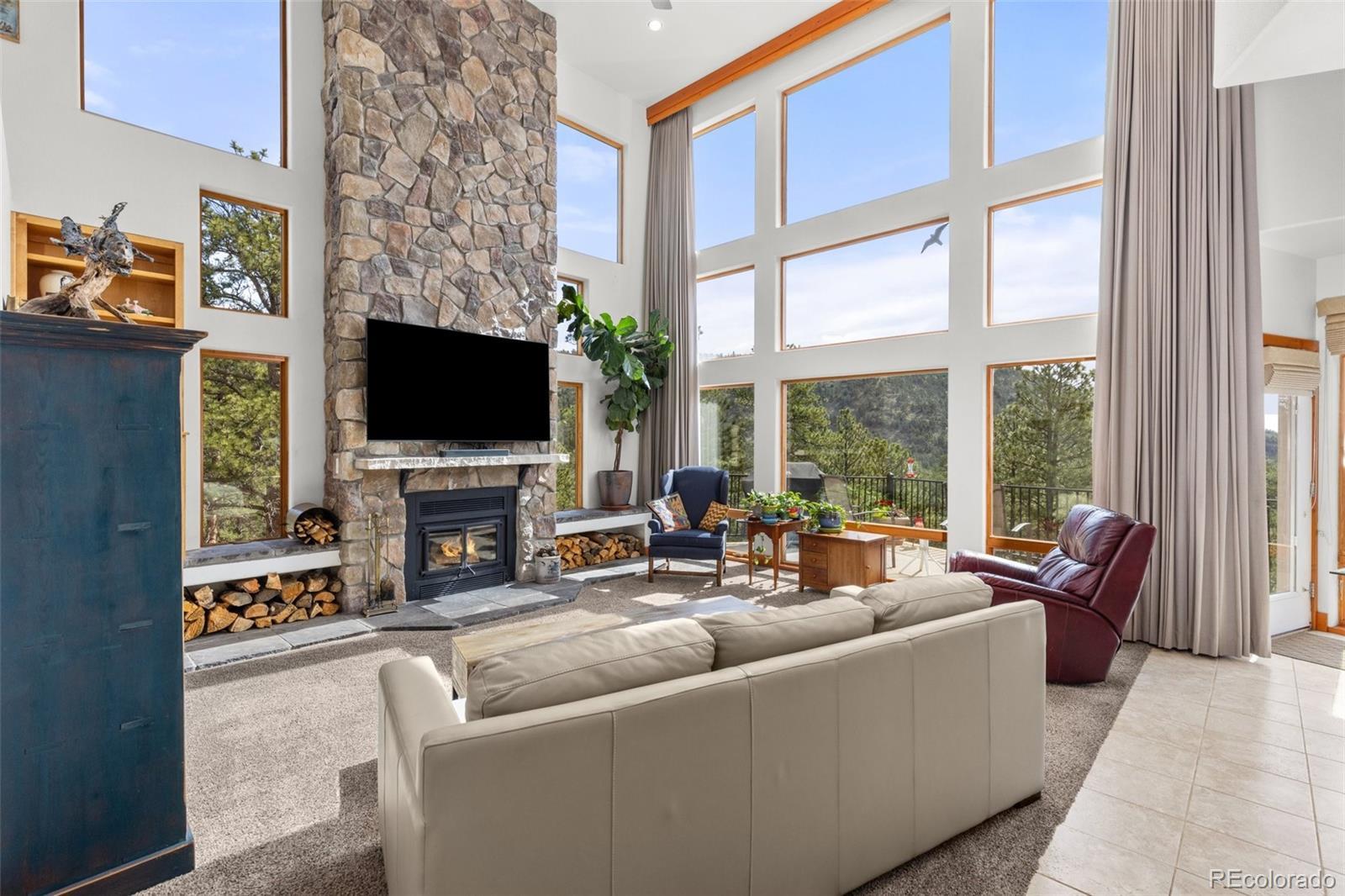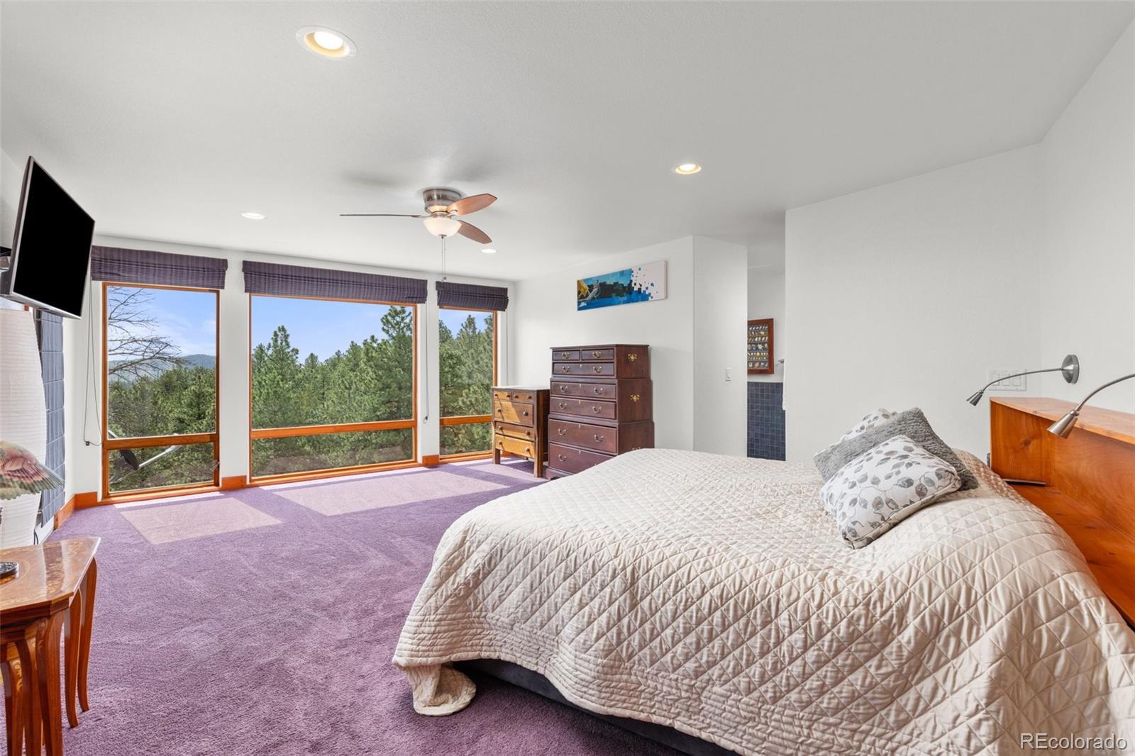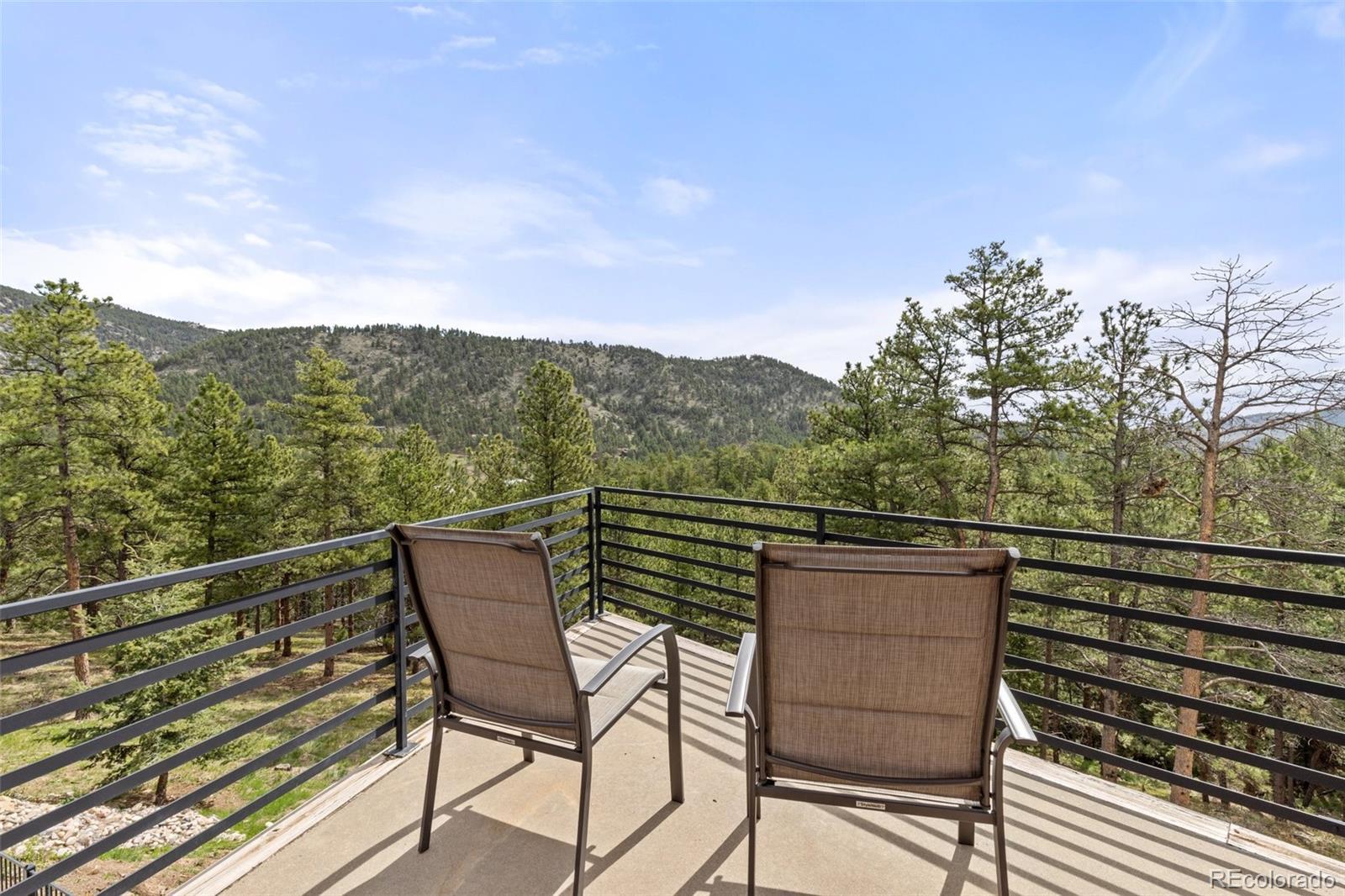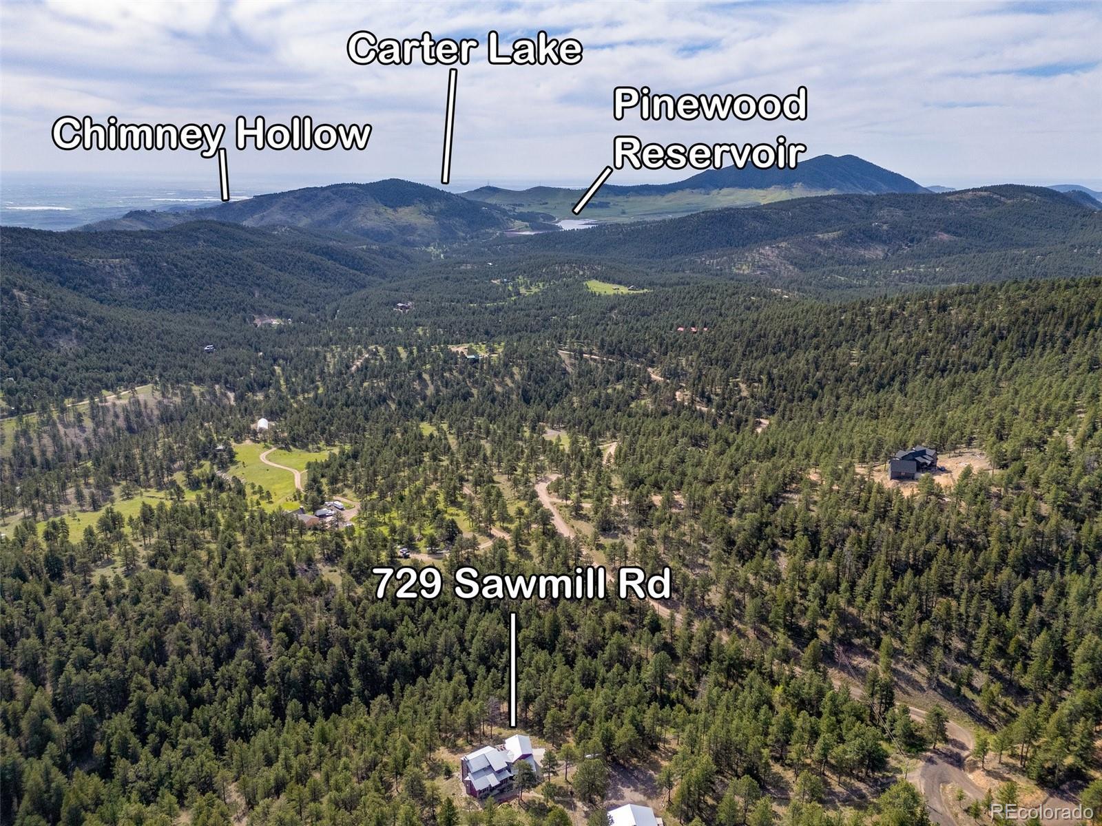 Experience mountain living in this custom-built contemporary home nestled on 35 private acres in the Saddle Notch Ranch area just west of the City of Loveland. Designed for comfort, energy efficiency, and connection to nature, this property offers unmatched views through soaring floor-to-ceiling windows in the expansive great room, showcasing the stunning natural surroundings. Thoughtfully constructed with high insulation values, passive solar design, in-floor radiant heating with 12 zones, and a whole-house fan, the home stays comfortable year-round. The open-concept layout includes a chef's kitchen with Tigerwood custom cabinetry, a five-burner gas cooktop, double ovens, large island with seating, walk-in pantry, and deck access for indoor-outdoor living. The main floor also features a guest suite with private entrance and jetted tub, and a unique mudroom off the attached four-car garage with ample storage. Upstairs, the loft-level home office overlooks the great room and sweeping landscape. The primary suite is a peaceful retreat with a gas fireplace, large walk-in closet, luxurious bath with dual showerheads, body sprays, and an oversized jetted tub with a view. The laundry room, also located off the primary suite, offers exceptional functionality with custom cabinetry and organization features. The large partially finished/unfinished walk-out basement-with 220V power has a separate entrance and is currently being used by the Sellers as a recreation room and hobby room/shop. Additional property highlights include CAT 5E ethernet wiring, custom window coverings, decorative ceiling fans, and a 1,000-gallon indoor cistern system. The fenced outdoor area is pet-friendly with room to expand, and the oversized driveway leads to the nearly new detached 4 car garage with 1,140 square feet of additional space! Enjoy privacy, sustainability, and panoramic views in a truly special setting. Shown by appointment only. Located on a private road-no drive-bys, please.