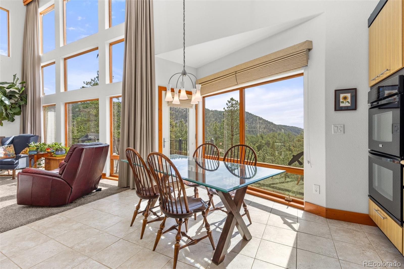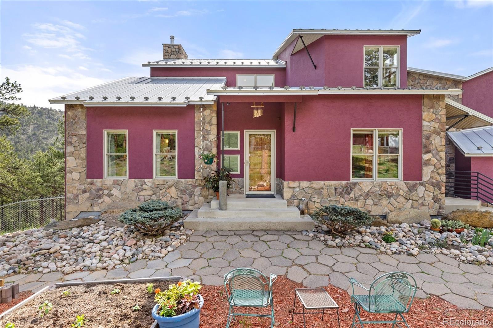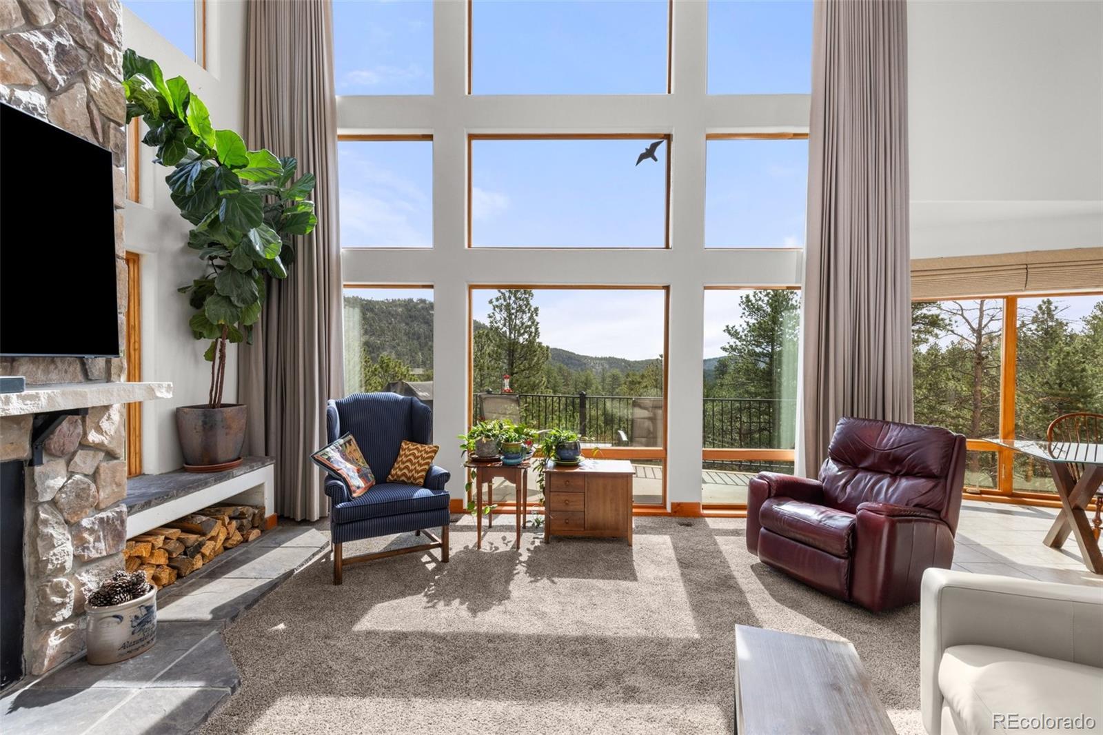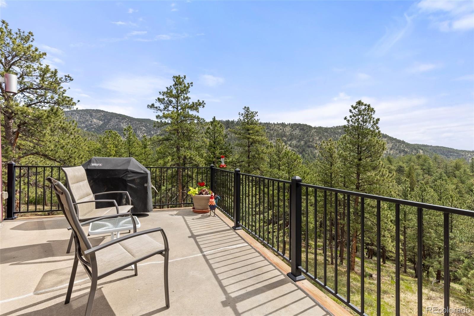 Experience mountain living in this custom-built contemporary home nestled on 35 private acres in the Saddle Notch Ranch area just west of the City of Loveland. Designed for comfort, energy efficiency, and connection to nature, this property offers unmatched views through soaring floor-to-ceiling windows in the expansive great room, showcasing the stunning natural surroundings. Thoughtfully constructed with high insulation values, passive solar design, in-floor radiant heating with 12 zones, and a whole-house fan, the home stays comfortable year-round. The open-concept layout includes a chef's kitchen with Tigerwood custom cabinetry, a five-burner gas cooktop, double ovens, large island with seating, walk-in pantry, and deck access for indoor-outdoor living. The main floor also features a guest suite with private entrance and jetted tub, and a unique mudroom off the attached four-car garage with ample storage. Upstairs, the loft-level home office overlooks the great room and sweeping landscape. The primary suite is a peaceful retreat with a gas fireplace, large walk-in closet, luxurious bath with dual showerheads, body sprays, and an oversized jetted tub with a view. The laundry room, also located off the primary suite, offers exceptional functionality with custom cabinetry and organization features. The large partially finished/unfinished walk-out basement-with 220V power has a separate entrance and is currently being used by the Sellers as a recreation room and hobby room/shop. Additional property highlights include CAT 5E ethernet wiring, custom window coverings, decorative ceiling fans, and a 1,000-gallon indoor cistern system. The fenced outdoor area is pet-friendly with room to expand, and the oversized driveway leads to the nearly new detached 4 car garage with 1,140 square feet of additional space! Enjoy privacy, sustainability, and panoramic views in a truly special setting. Shown by appointment only. Located on a private road-no drive-bys, please.