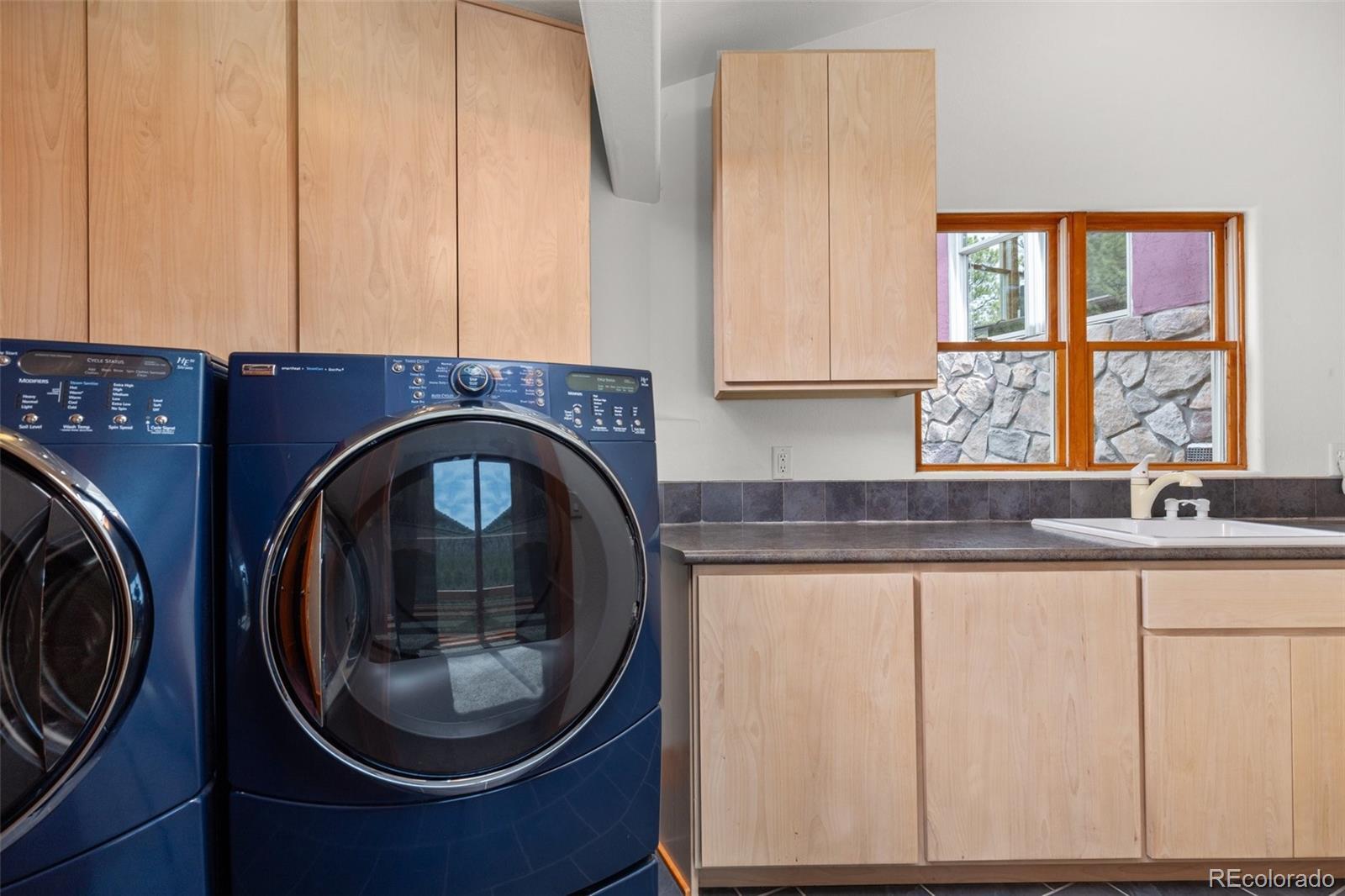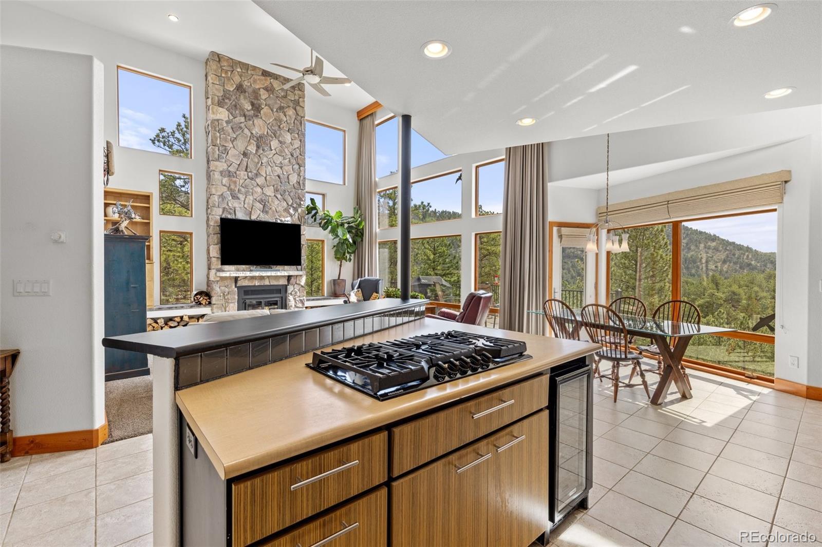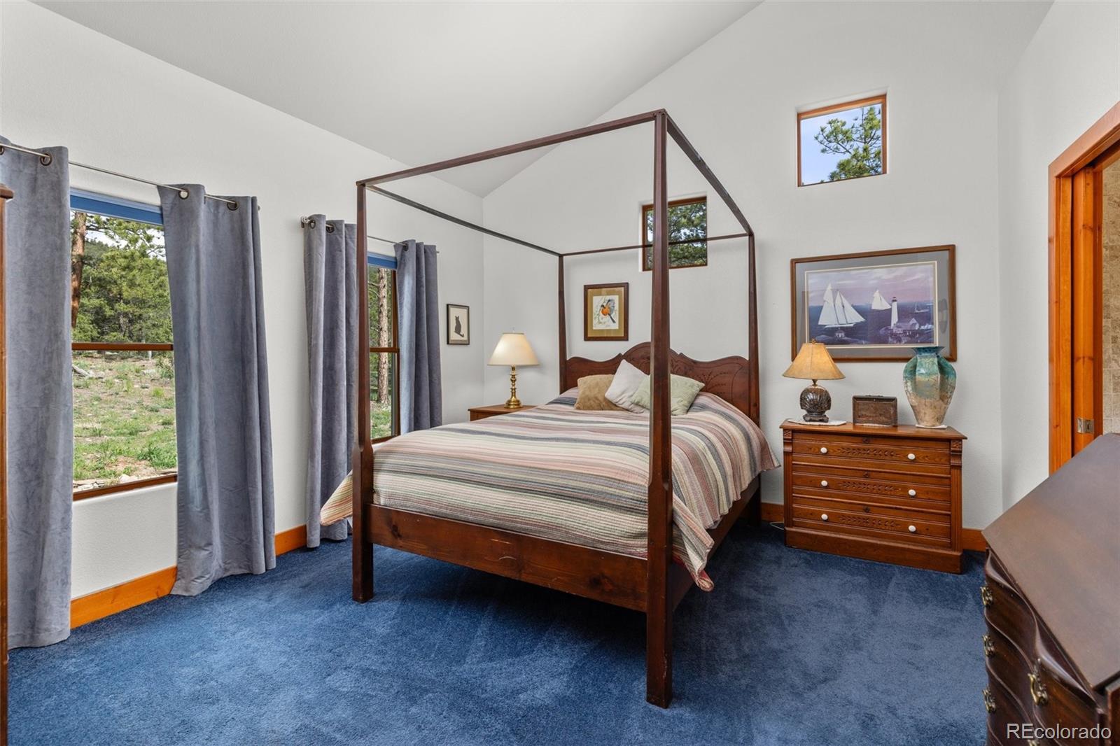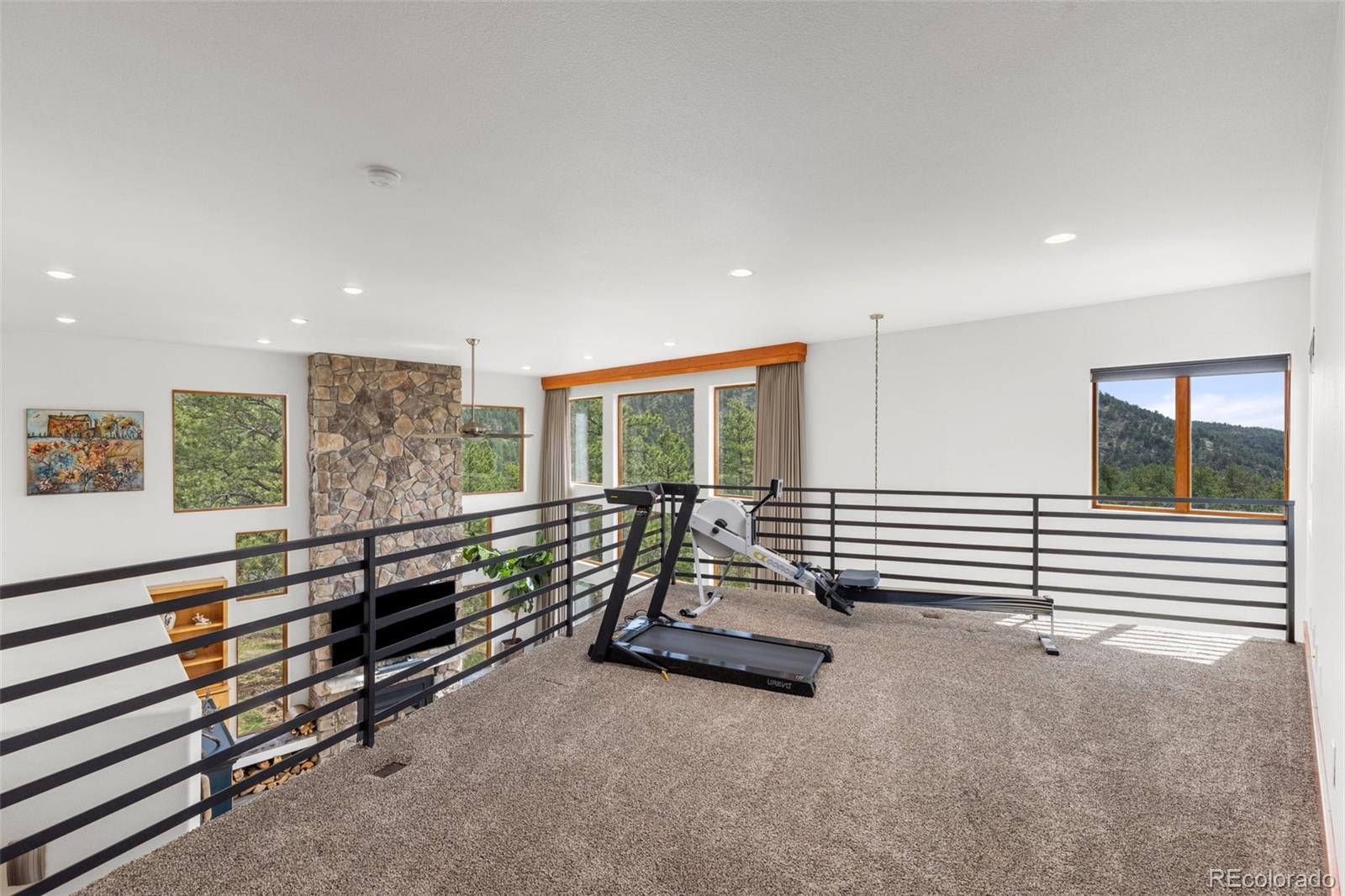Experience mountain living in this custom-built contemporary home nestled on 35 private acres in the Saddle Notch Ranch area just west of the City of Loveland. Designed for comfort, energy efficiency, and connection to nature, this property offers unmatched views through soaring floor-to-ceiling windows in the expansive great room, showcasing the stunning natural surroundings. Thoughtfully constructed with high insulation values, passive solar design, in-floor radiant heating with 12 zones, and a whole-house fan, the home stays comfortable year-round. The open-concept layout includes a chef's kitchen with Tigerwood custom cabinetry, a five-burner gas cooktop, double ovens, large island with seating, walk-in pantry, and deck access for indoor-outdoor living. The main floor also features a guest suite with private entrance and jetted tub, and a unique mudroom off the attached four-car garage with ample storage. Upstairs, the loft-level home office overlooks the great room and sweeping landscape. The primary suite is a peaceful retreat with a gas fireplace, large walk-in closet, luxurious bath with dual showerheads, body sprays, and an oversized jetted tub with a view. The laundry room, also located off the primary suite, offers exceptional functionality with custom cabinetry and organization features. The large partially finished/unfinished walk-out basement-with 220V power has a separate entrance and is currently being used by the Sellers as a recreation room and hobby room/shop. Additional property highlights include CAT 5E ethernet wiring, custom window coverings, decorative ceiling fans, and a 1,000-gallon indoor cistern system. The fenced outdoor area is pet-friendly with room to expand, and the oversized driveway leads to the nearly new detached 4 car garage with 1,140 square feet of additional space! Enjoy privacy, sustainability, and panoramic views in a truly special setting. Shown by appointment only. Located on a private road-no drive-bys, please.