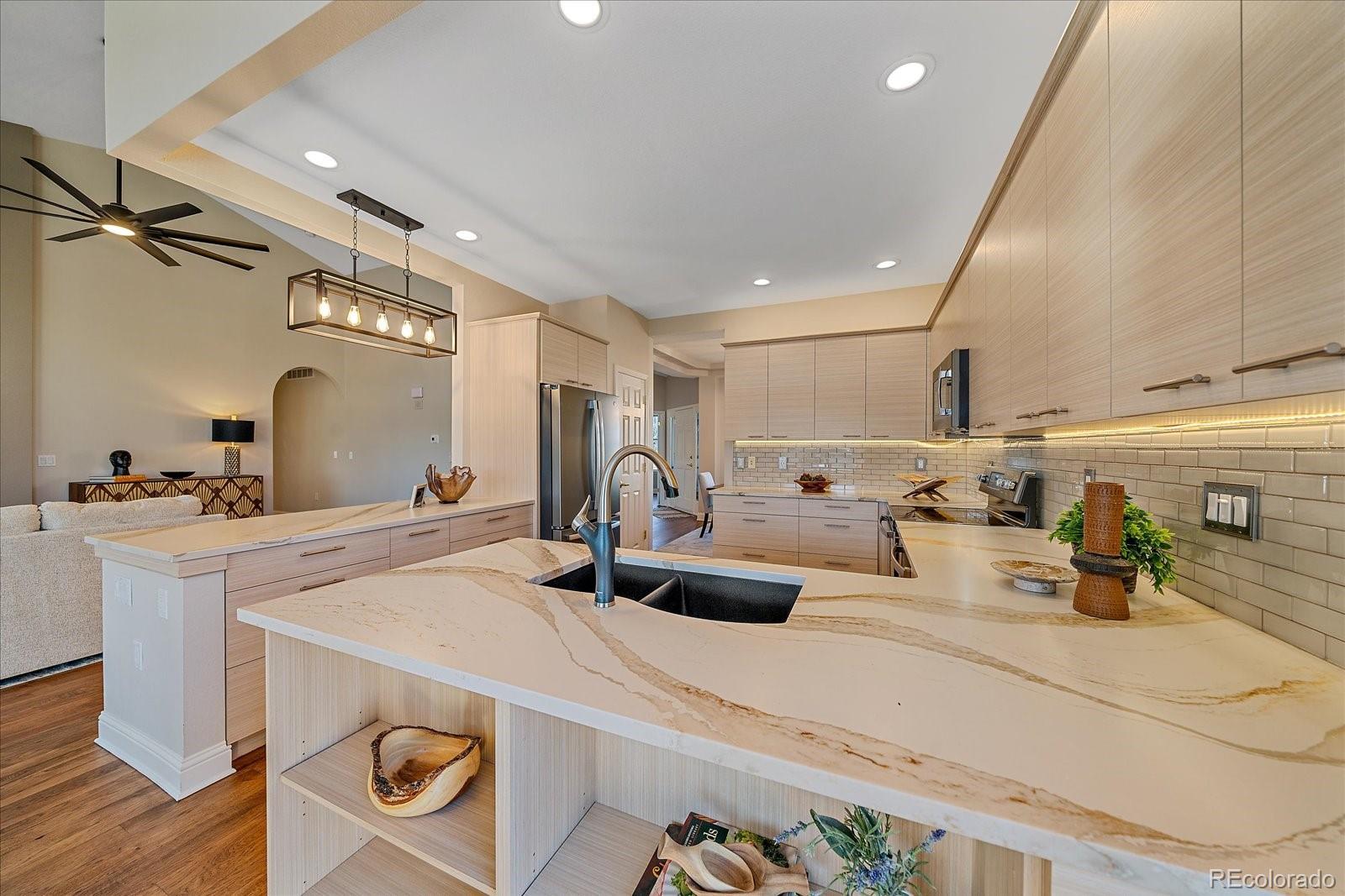 Breakfast Bar, Built-in Features, Ceiling Fan(s), Eat-in Kitchen, Five Piece Bath, High Ceilings, Kitchen Island, Open Floorplan, Pantry, Primary Suite, Quartz Counters, Wet Bar