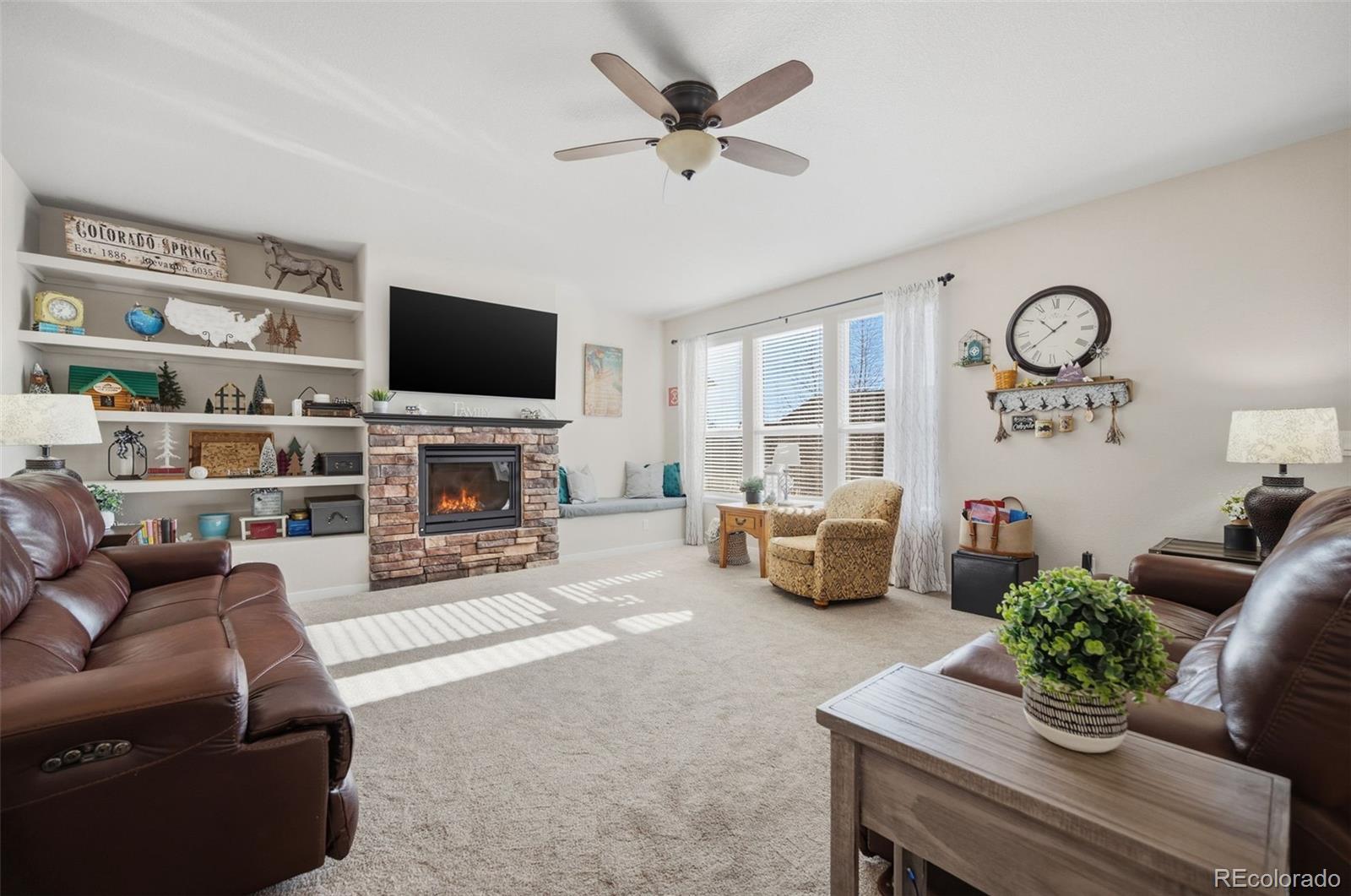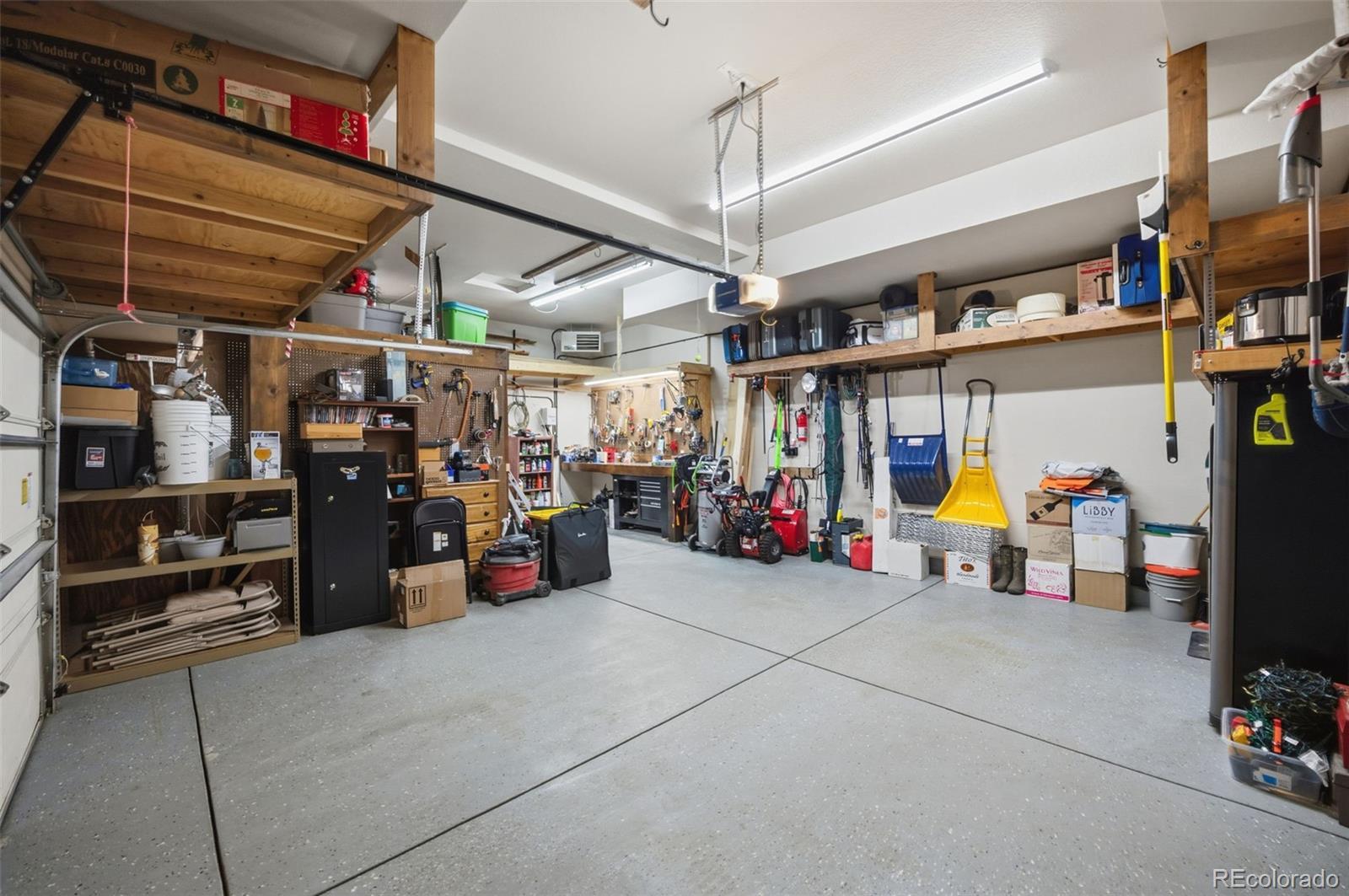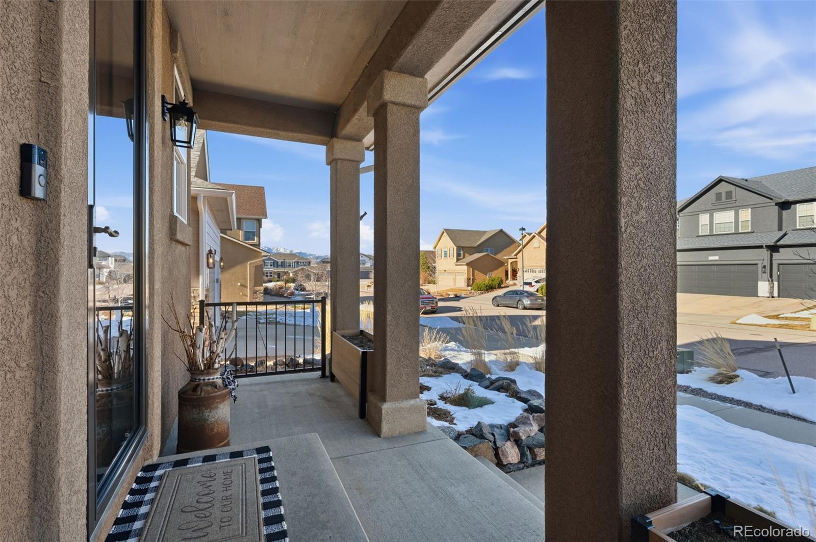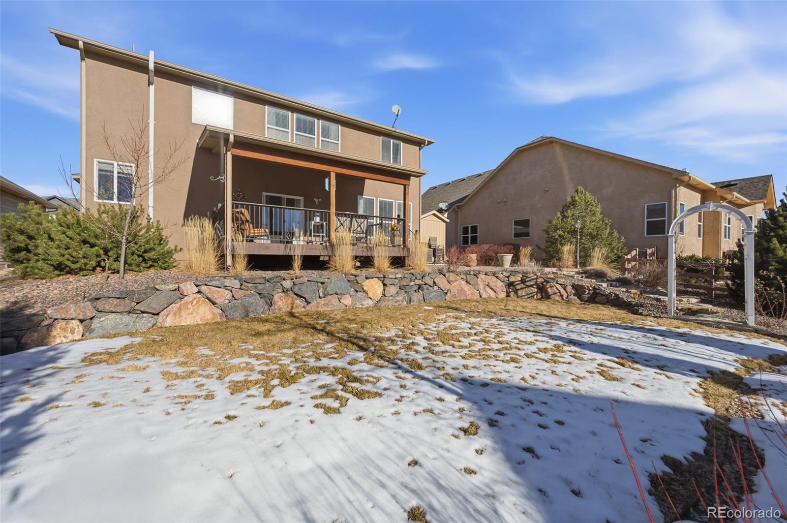 Stunning Five-Bedroom Wolf Ranch Home with Three-Car Garage, Finished Basement This exceptional five-bedroom home in sought-after Wolf Ranch offers space, style, and functionality, highlighted by a three-car garage, finished basement, and beautiful outdoor living. A vaulted entryway welcomes you with hardwood flooring flowing through the entry, dining area, and kitchen, complemented by newer carpet on the main and upper levels. The spacious great room features a gas fireplace with stone surround, built-in shelving, and abundant natural light. The open-concept kitchen showcases upgraded granite countertops, a large island with seating, pendant lighting, and seamless connection to the dining area ideal for everyday living and entertaining. Upstairs, the primary suite impresses with vaulted ceilings and a spa-like bath with soaking tub, freestanding shower, and dual vanities. Three additional bedrooms complete the level, two with walk-in closets and a third perfect for a craft room or home office. A full bath, oversized laundry room, and a large connecting loft add versatility. The finished basement offers a generous rec room with an included pool table, a fifth bedroom, full bath, and a storage room that could easily convert to a sixth bedroom. A separate thermostat provides comfortable temperature control. Enjoy a huge backyard with a 12x18 covered deck, additional concrete patio, natural gas line for the included grill, Pikes Peak views, fruit trees, and a large grassy area. Additional features include a 7x10 wooden shed, year-round decorative eave lighting, central air conditioning, a built in basketball hoop, and a dream three-car garage set up as a workshop with built-in storage, workbench, and natural gas heater. Wolf Ranch has multiple trails, parks, a lake, and an optional pool community center membership.