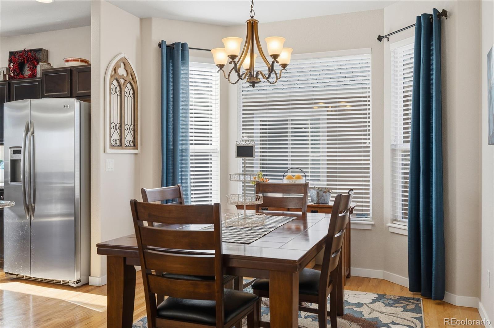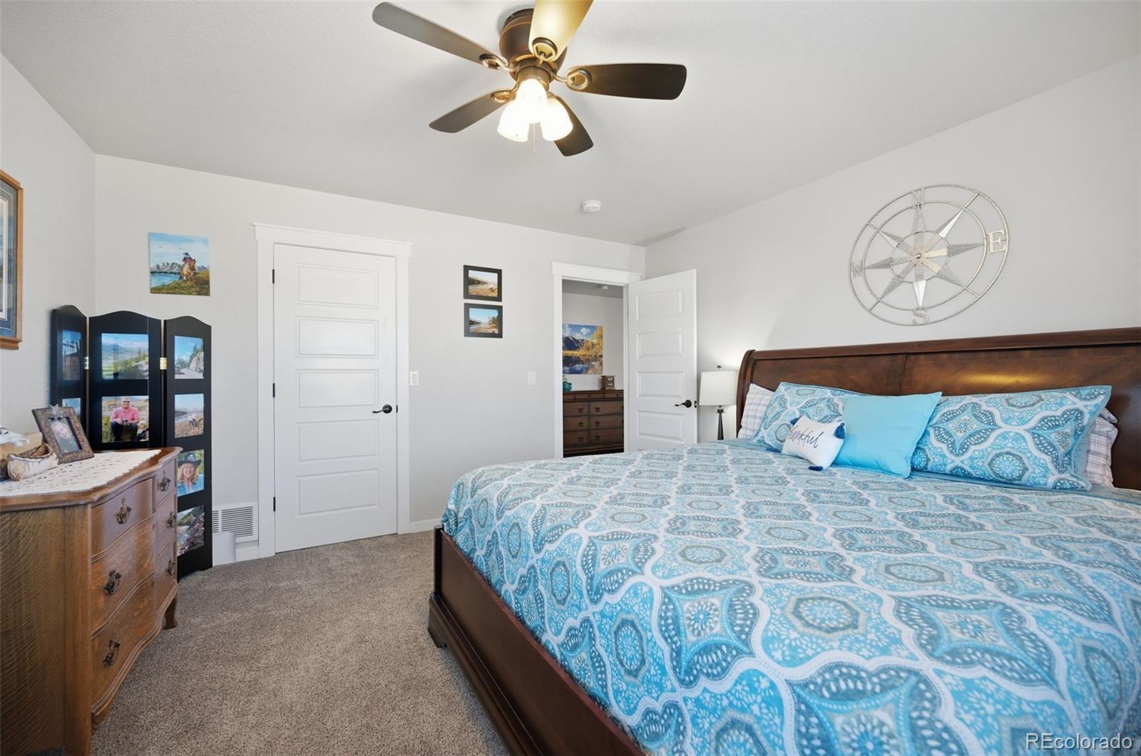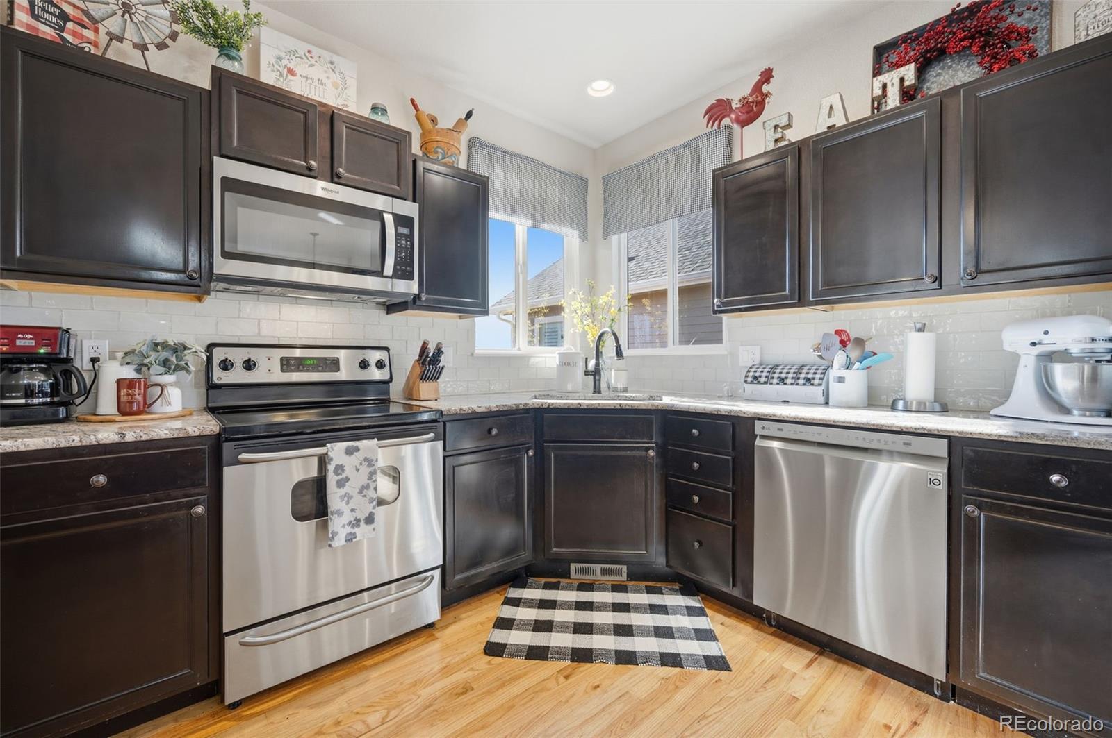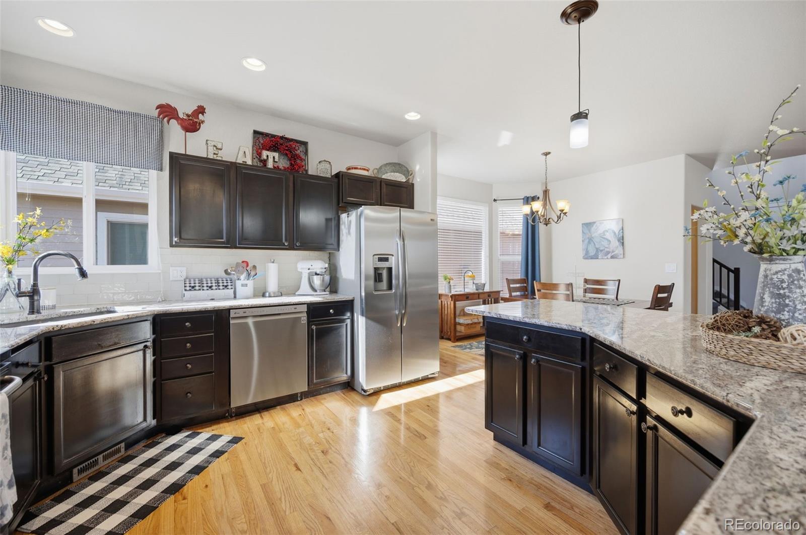 Stunning Five-Bedroom Wolf Ranch Home with Three-Car Garage, Finished Basement This exceptional five-bedroom home in sought-after Wolf Ranch offers space, style, and functionality, highlighted by a three-car garage, finished basement, and beautiful outdoor living. A vaulted entryway welcomes you with hardwood flooring flowing through the entry, dining area, and kitchen, complemented by newer carpet on the main and upper levels. The spacious great room features a gas fireplace with stone surround, built-in shelving, and abundant natural light. The open-concept kitchen showcases upgraded granite countertops, a large island with seating, pendant lighting, and seamless connection to the dining area ideal for everyday living and entertaining. Upstairs, the primary suite impresses with vaulted ceilings and a spa-like bath with soaking tub, freestanding shower, and dual vanities. Three additional bedrooms complete the level, two with walk-in closets and a third perfect for a craft room or home office. A full bath, oversized laundry room, and a large connecting loft add versatility. The finished basement offers a generous rec room with an included pool table, a fifth bedroom, full bath, and a storage room that could easily convert to a sixth bedroom. A separate thermostat provides comfortable temperature control. Enjoy a huge backyard with a 12x18 covered deck, additional concrete patio, natural gas line for the included grill, Pikes Peak views, fruit trees, and a large grassy area. Additional features include a 7x10 wooden shed, year-round decorative eave lighting, central air conditioning, a built in basketball hoop, and a dream three-car garage set up as a workshop with built-in storage, workbench, and natural gas heater. Wolf Ranch has multiple trails, parks, a lake, and an optional pool community center membership.