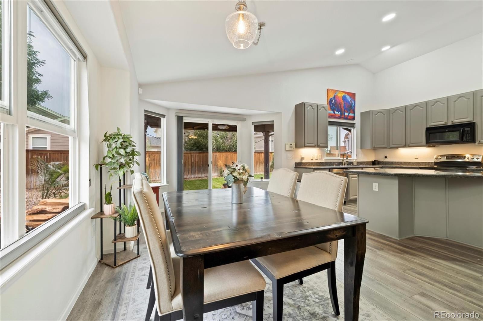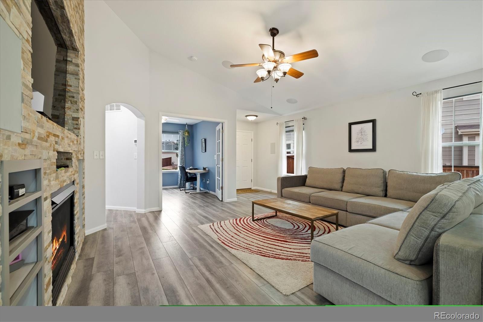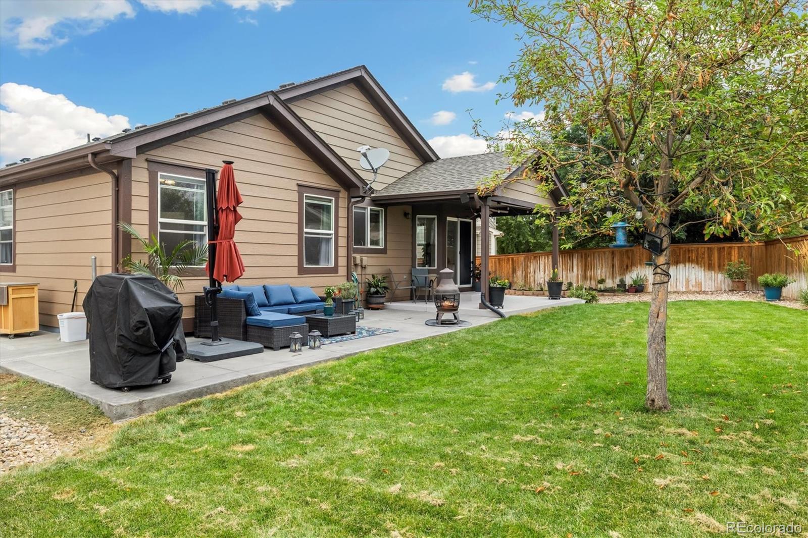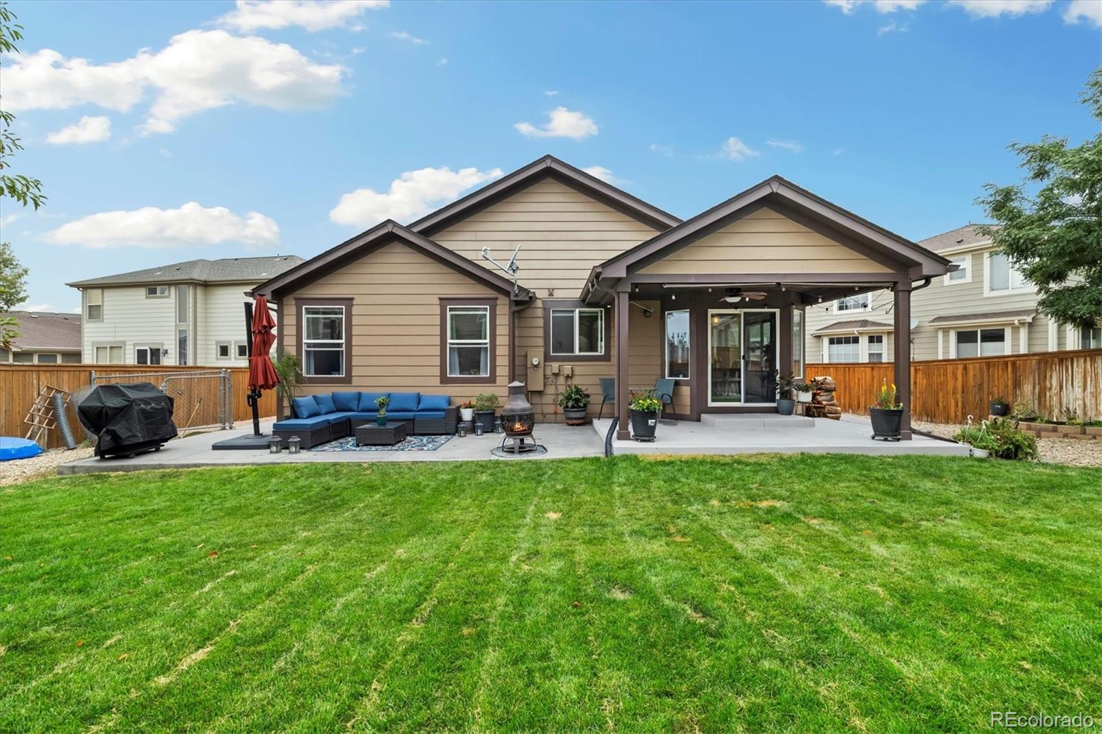Nestled in the tranquil community of Buffalo Run Mesa in Reunion, Colorado, this beautiful single-story home offers a perfect blend of comfort, functionality, and modern updates. Featuring 3 spacious bedrooms and 2 full bathrooms, this home is ideal for anyone seeking ease of living with plenty of space. The sunny, open-concept kitchen is a chef’s dream, equipped with a gas stove, under-cabinet lighting, motion-sensor lighting in the pantry. From the kitchen you can step outside to enjoy the covered patio with a ceiling fan, ideal for outdoor gatherings and the gorgeous fully fenced yard. A cozy gas fireplace creates a warm ambiance in the living room, complemented by surround sound perfect for movie nights or entertaining. All window coverings are top-down/bottom-up shades, providing privacy and light control. Additional features include a mudroom with laundry off the attached two-car garage, a dedicated dog run on the side of the house, and a house fan for efficient cooling. The master suite boasts a large walk-in closet, offering ample storage. The neighborhood is quiet, with easy access to walking trails and nearby parks.The full unfinished basement awaits your personal touch—whether for hobbies, extra living space, or expanding your home in the future. Located just 10 minutes from DIA, 25 minutes from downtown Denver, and an hour to Evergreen and Conifer for outdoor adventures, this home provides both serenity and convenience. With nearby amenities—including the community pool and a grocery store within one mile, and the Rocky Mountain Arsenal Wildlife Refuge just 20 minutes—this property is ready to become your dream home. Experience one-level living in a charming, friendly neighborhood with all the comforts and amenities you desire.