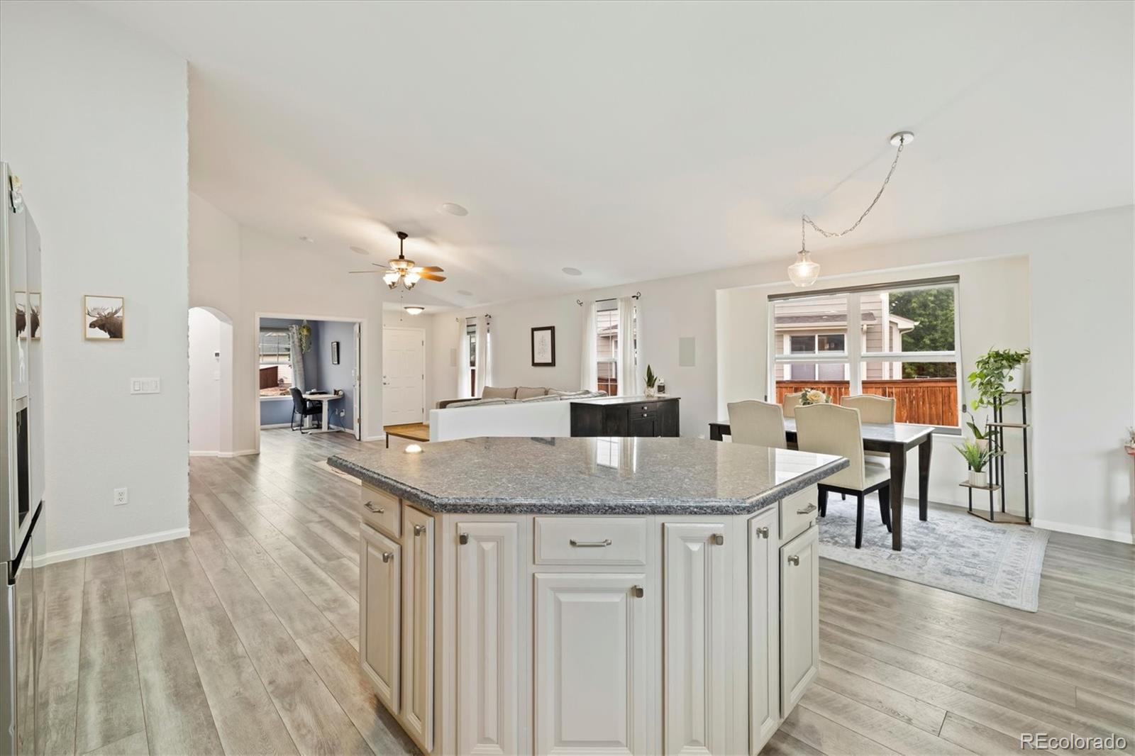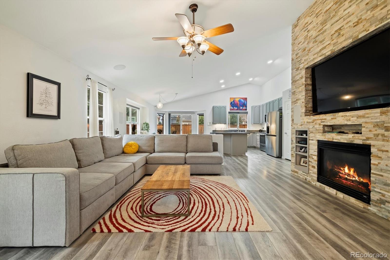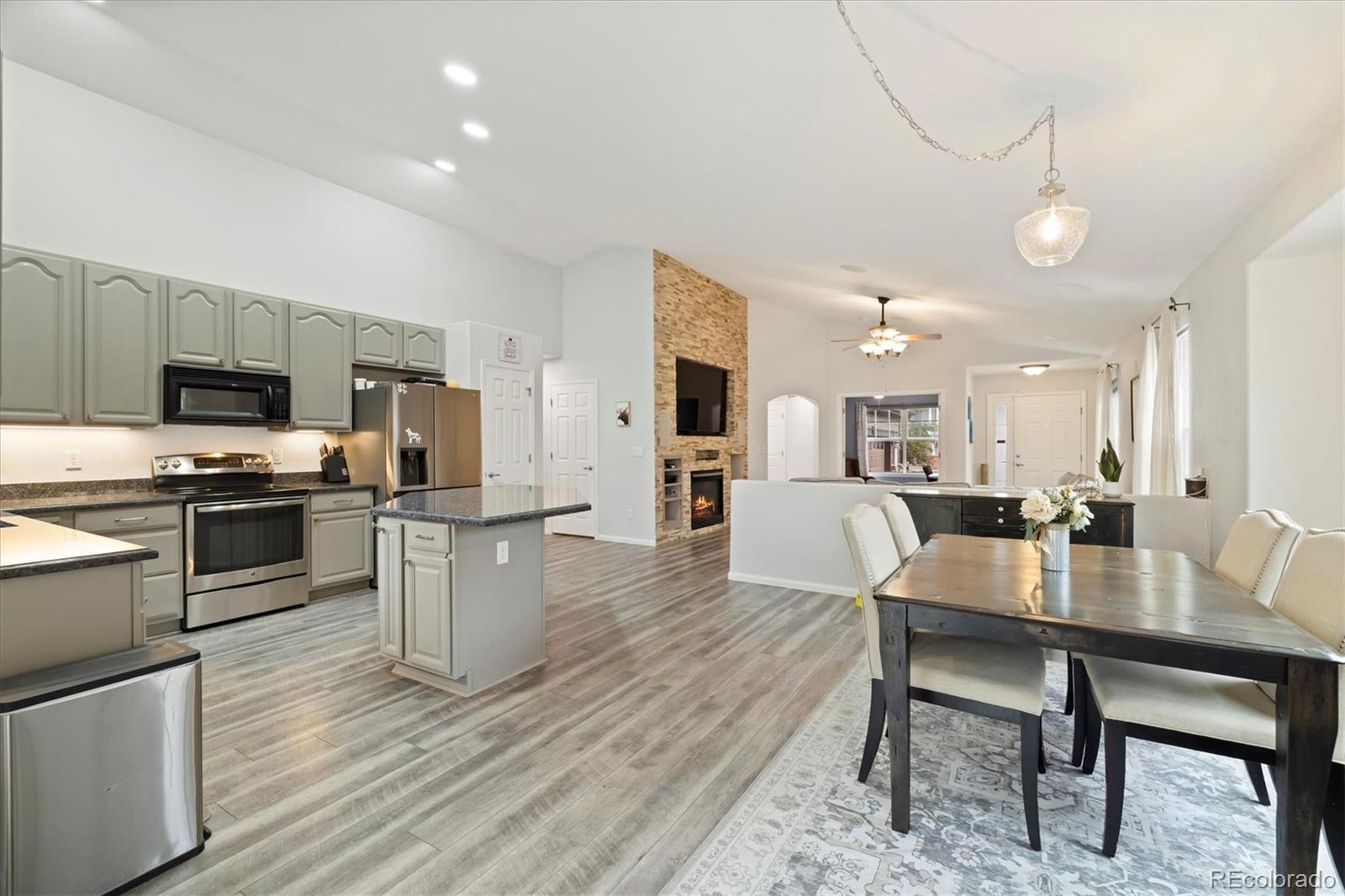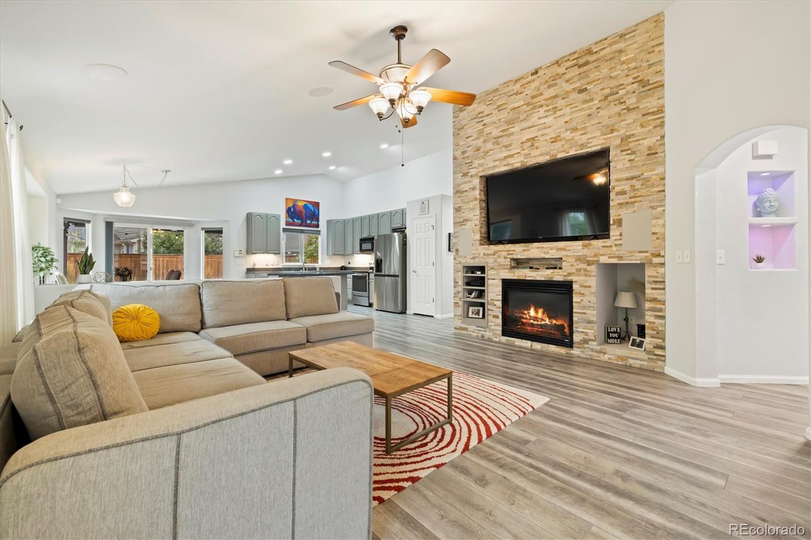 Nestled in the tranquil community of Buffalo Run Mesa in Reunion, Colorado, this beautiful single-story home offers a perfect blend of comfort, functionality, and modern updates. Featuring 3 spacious bedrooms and 2 full bathrooms, this home is ideal for anyone seeking ease of living with plenty of space. The sunny, open-concept kitchen is a chef’s dream, equipped with a gas stove, under-cabinet lighting, motion-sensor lighting in the pantry. From the kitchen you can step outside to enjoy the covered patio with a ceiling fan, ideal for outdoor gatherings and the gorgeous fully fenced yard. A cozy gas fireplace creates a warm ambiance in the living room, complemented by surround sound perfect for movie nights or entertaining. All window coverings are top-down/bottom-up shades, providing privacy and light control. Additional features include a mudroom with laundry off the attached two-car garage, a dedicated dog run on the side of the house, and a house fan for efficient cooling. The master suite boasts a large walk-in closet, offering ample storage. The neighborhood is quiet, with easy access to walking trails and nearby parks.The full unfinished basement awaits your personal touch—whether for hobbies, extra living space, or expanding your home in the future. Located just 10 minutes from DIA, 25 minutes from downtown Denver, and an hour to Evergreen and Conifer for outdoor adventures, this home provides both serenity and convenience. With nearby amenities—including the community pool and a grocery store within one mile, and the Rocky Mountain Arsenal Wildlife Refuge just 20 minutes—this property is ready to become your dream home. Experience one-level living in a charming, friendly neighborhood with all the comforts and amenities you desire.