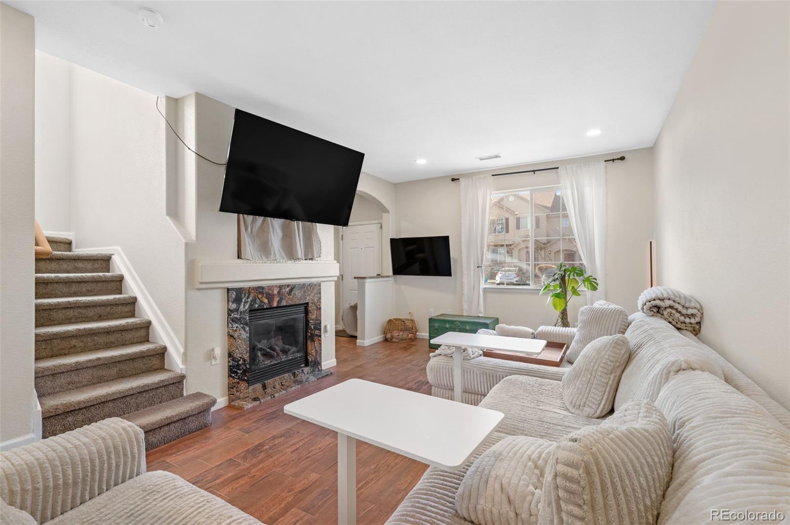 Welcome to this beautifully maintained end-unit townhome offering comfort, privacy, and easy living. The main level features an open and inviting layout with a cozy gas fireplace, flowing into the kitchen and dining area with granite countertops and a functional island, ideal for everyday living and entertaining. Upstairs, you’ll find two spacious primary suites, each with its own private ensuite bath and generous closet space, offering flexibility for guests, roommates, or a growing household. As an end unit, the home enjoys added natural light and a greater sense of privacy throughout. A fully fenced private yard provides a rare outdoor space for townhome living, perfect for pets, grilling, or relaxing. The HOA has completed major exterior improvements, including a newer roof, updated stucco, and west-facing bedroom windows, helping provide peace of mind and low-maintenance ownership. Residents also enjoy community amenities such as a pool and walking paths, along with easy access to parks, shopping, schools, and public transportation. Exterior maintenance and snow removal are included. Move-in ready and thoughtfully cared for, this end-unit townhome offers an excellent blend of comfort, convenience, and value.