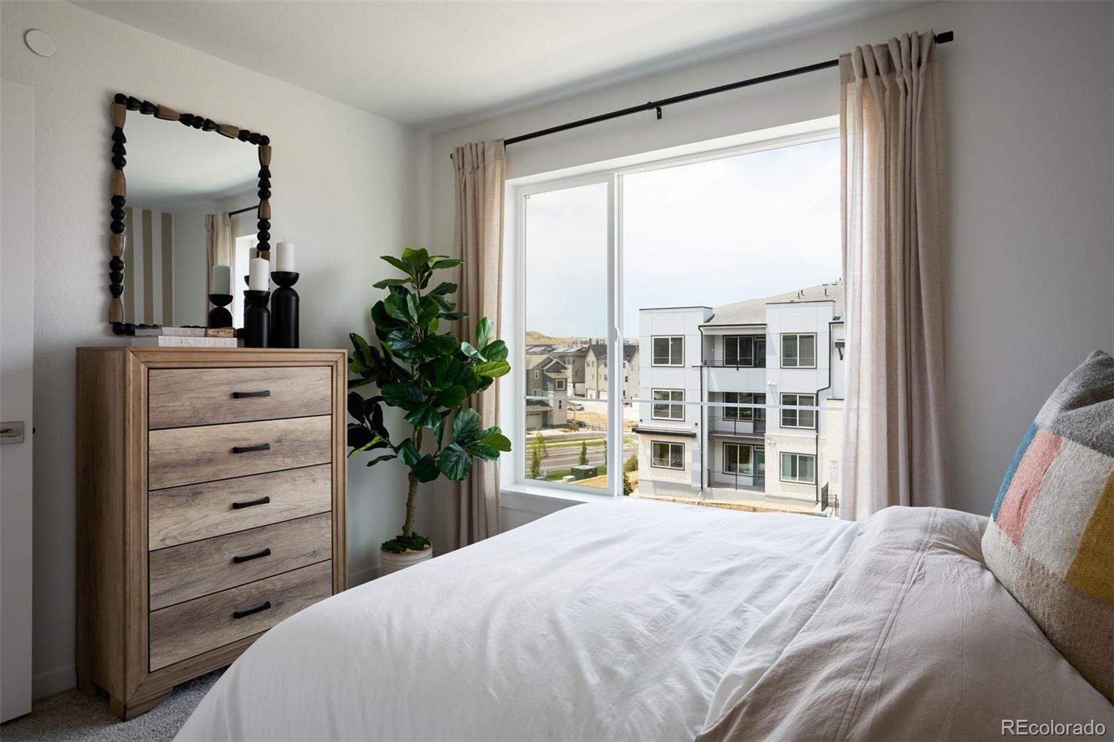 Move-in-ready and featured as our Home of the Week, this stylish new townhome offers exclusive interest rate promotions and additional closing cost assistance—an exceptional opportunity in one of Lone Tree’s most sought-after new communities. Located in Lyric at RidgeGate, a thoughtfully planned, walkable neighborhood near I-25, Park Meadows Mall, C-470, and the Denver Tech Center, this home delivers the perfect blend of convenience, connectivity, and modern Colorado living. The Wakefield floor plan features 1,297 square feet of smartly designed space with 2 bedrooms and 2.5 baths. The open-concept main level is bright and inviting, highlighted by 9-foot ceilings, quartz countertops, and a spacious kitchen island that flows seamlessly into the living and dining areas—ideal for both everyday living and entertaining. A private deck extends your living space outdoors, perfect for enjoying Colorado sunshine. Upstairs, the primary suite offers a relaxing retreat with dual vanities and a walk-in closet. A separate guest suite provides privacy for visitors, while a versatile flex space is ideal for a home office, workout area, or reading nook. This move-in-ready home also includes central A/C, Kohler fixtures, Samsung kitchen appliances, and an oversized two-car garage, ensuring comfort and quality from day one. Enjoy easy access to parks, trails, dining, and shopping, all part of the vibrant Lyric at RidgeGate lifestyle. Photos are of a model home with the same floor plan; finishes and views may vary.