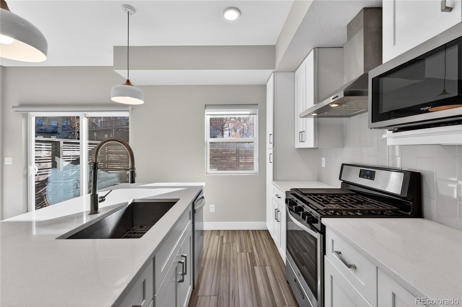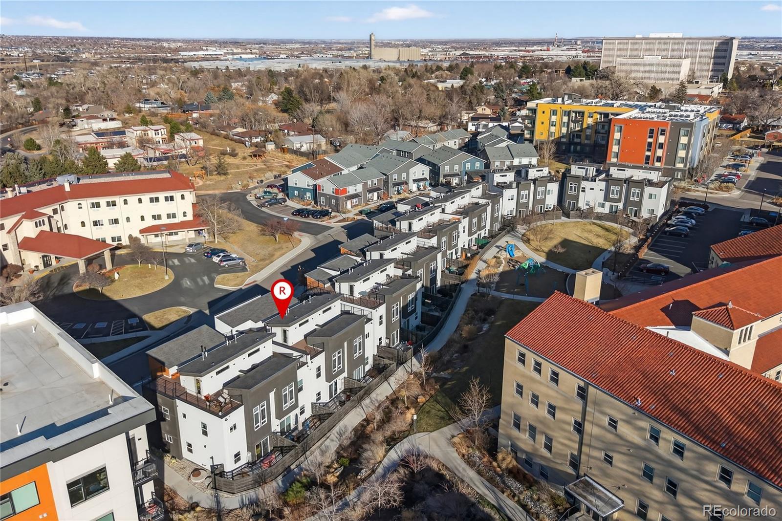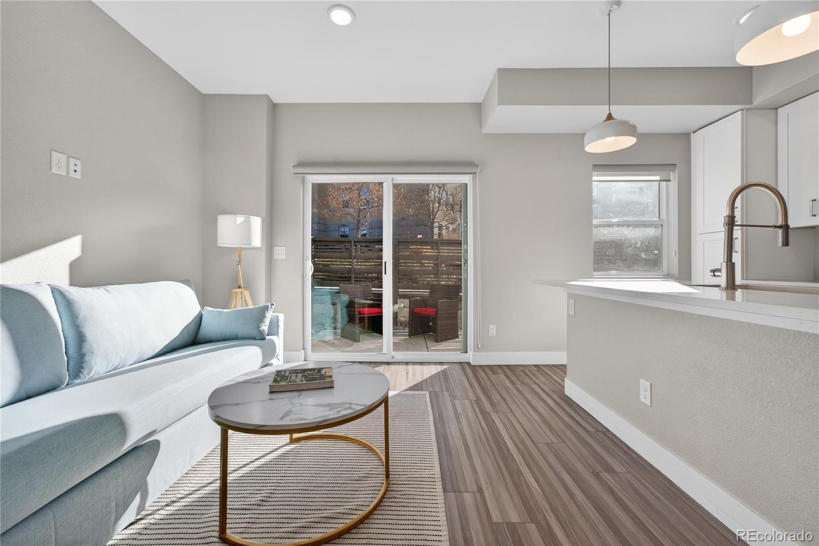 Welcome to this gorgeous, modern townhome in Denver’s sought-after Aria community—offering turnkey living with sleek finishes and exceptional outdoor spaces on every level! Thoughtfully designed with style and functionality in mind, this home delivers contemporary comfort in an unbeatable location. The entry level features the main living space with an open-concept kitchen and living area, creating a bright and welcoming atmosphere. The kitchen is beautifully appointed with quartz countertops, a center island with breakfast bar, and stainless steel appliances—all included. The living room opens through sliding glass doors to a privacy-fenced patio, perfect for relaxing, entertaining, or enjoying your own outdoor retreat. A convenient half bath and direct access to the attached one-car garage complete this level. Upstairs, the second floor hosts the bedroom spaces, including a spacious and sun-filled primary suite featuring its own private patio, en-suite bathroom, and walk-in closet. Two additional bedrooms, a full bathroom, and a dedicated laundry room provide comfort and everyday convenience. The third floor offers a bright landing with a closet and access to an impressive private rooftop patio—ideal for entertaining, unwinding, or taking in stunning mountain and city views. Luxury vinyl plank flooring runs throughout the home, enhancing both style and durability. Located just minutes from major freeways, downtown Denver, and the vibrant Highland, Tennyson, and Berkeley neighborhoods—and with no metro district—this Aria townhome offers modern design, low-maintenance living, and outstanding access to everything the city has to offer!