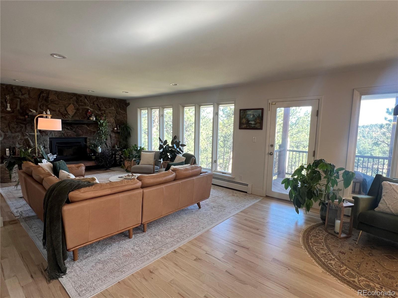 Spectacular home with breathtaking mountain views is a tranquil retreat just 10 minutes from Pearl Street. Natural light flows through this beautifully remodeled home w/ newer hardwood floors, updated wood staircase, railings, custom newel posts, newly remodeled primary bathroom w/ marble floors, dual shower heads, large free standing soaking tub, double sinks w/ new quartz counters & skylights. This home has a charming Scandinavian feel. A chef's dream w/ a remodeled gourmet kitchen complete w/ both quartz & granite counters, Viking range w/ gas burners, Viking vent hood, microwave drawer, large farm sink, large cabinets w/ pull-out drawers for pantry items & a wonderful coffee bar w/ cabinets & mountain views. The cozy wood burning fireplace surrounded by stone invites you to sit down, relax & enjoy the views. Lots of outdoor spaces for gathering & enjoying the views including a 1,300 sq ft. deck w/ a built-in hot tub (New in 2023), both covered & uncovered deck areas to take in the views, a lovely balcony off the large primary bedroom w/ vaulted ceilings to enjoy sunsets, convenient covered deck off the family room & flagstone patio off the walk-out lower level. Mountain views from nearly every room in the house. 4 bedrooms plus an office w/ a cozy pellet stove & mountain views. Large steam shower seats at least 4 people. This home has been beautifully updated w/ remodeled main floor bathroom w/ beautiful tile. Lots of windows & skylights throughout bring the outdoors in. Solar panels are owned for low electricity bills. Back up generator. Large 3 car garage & a wonderful wine cellar. Custom light fixtures, newer paint & fixtures. This home is a gem! New roof & septic system in 2023. 220 outlet in garage w/ electric car charger. Great location close to Betasso Preserve for cycling, hiking & horseback riding. A short drive to Boulder Creek for fly fishing & more trails to enjoy. 30 min drive to Eldora Ski Resort. Short walk to school bus stop. Showings start 1/29.