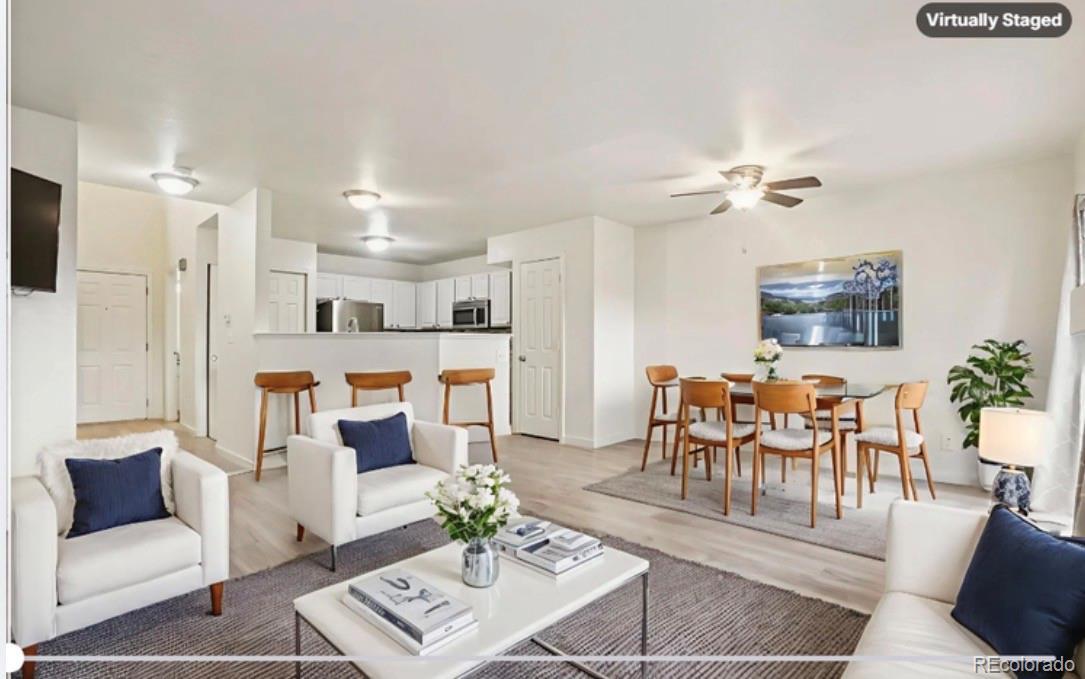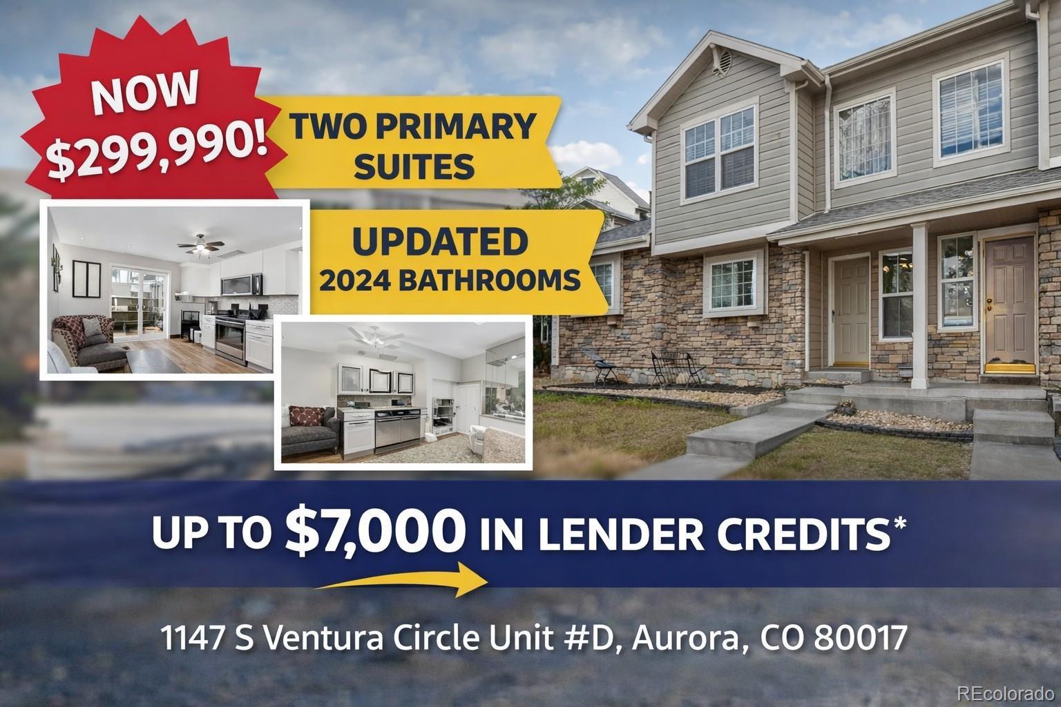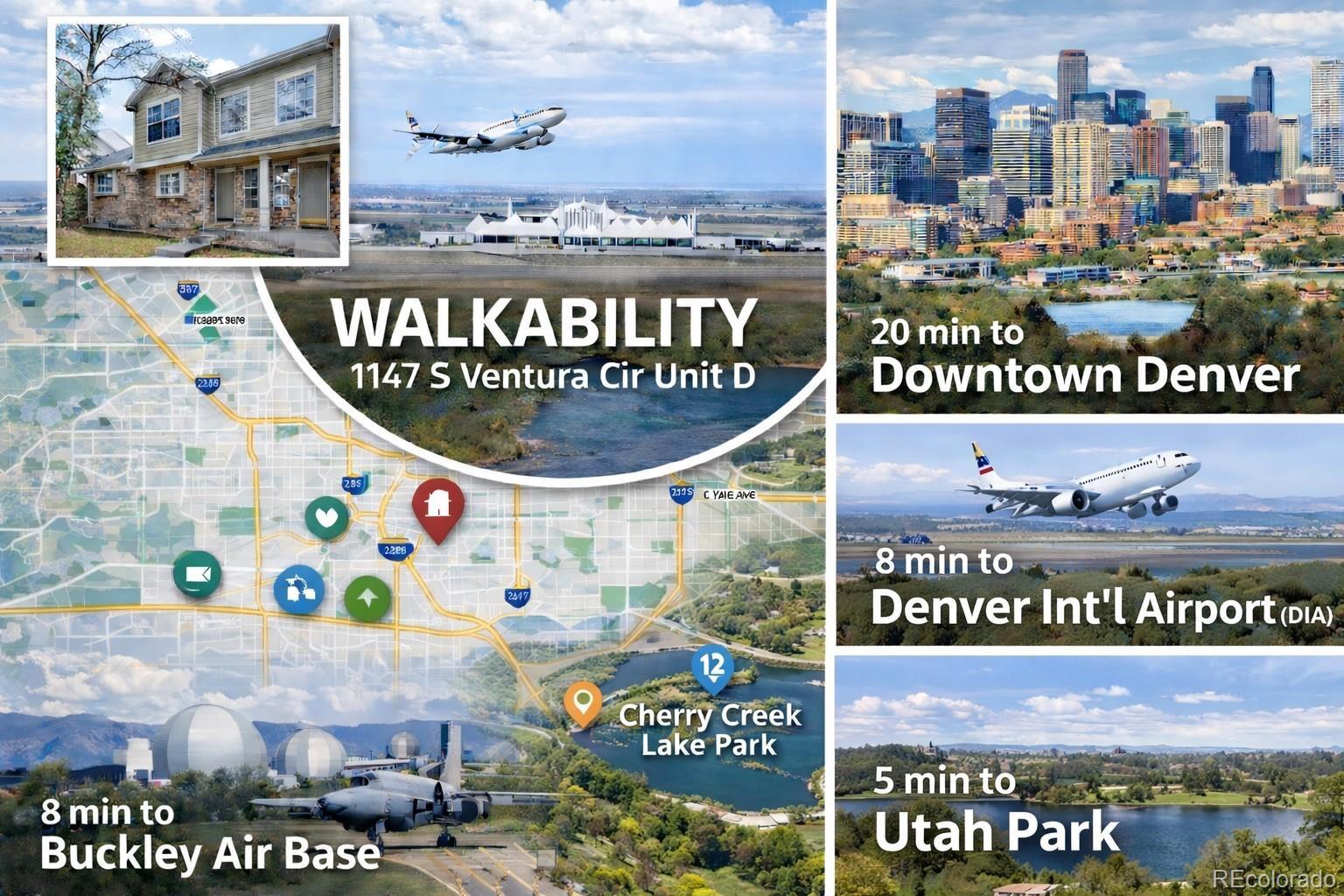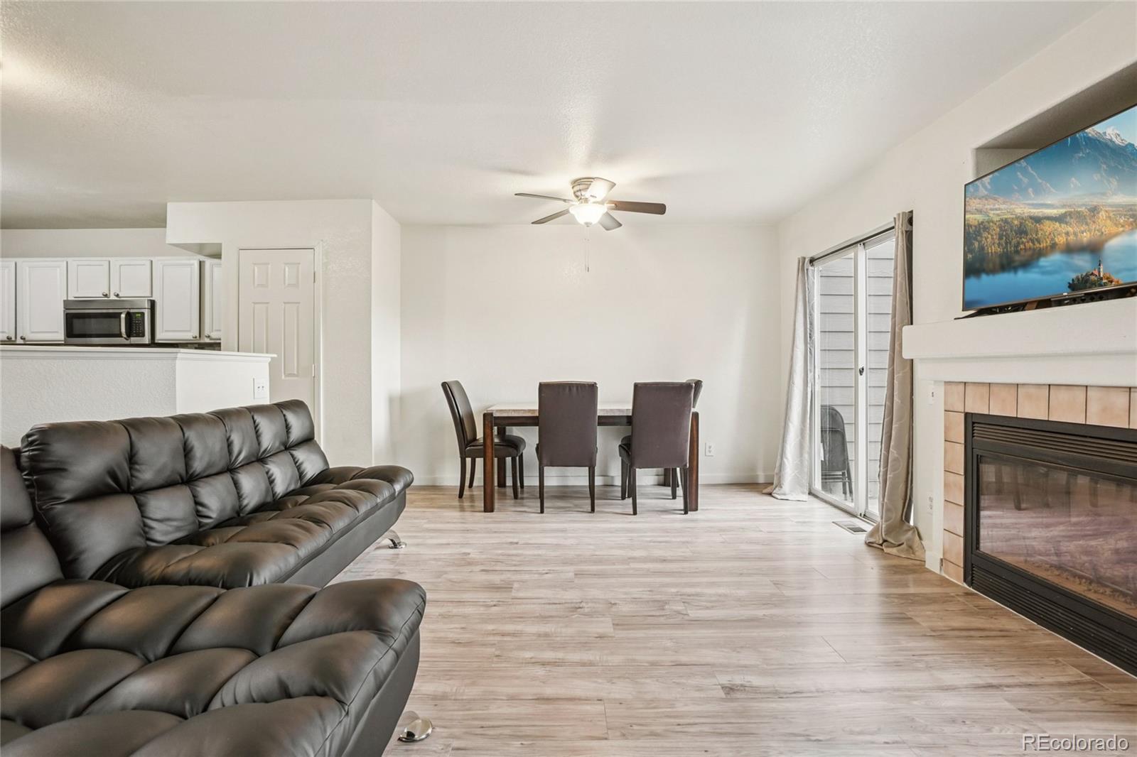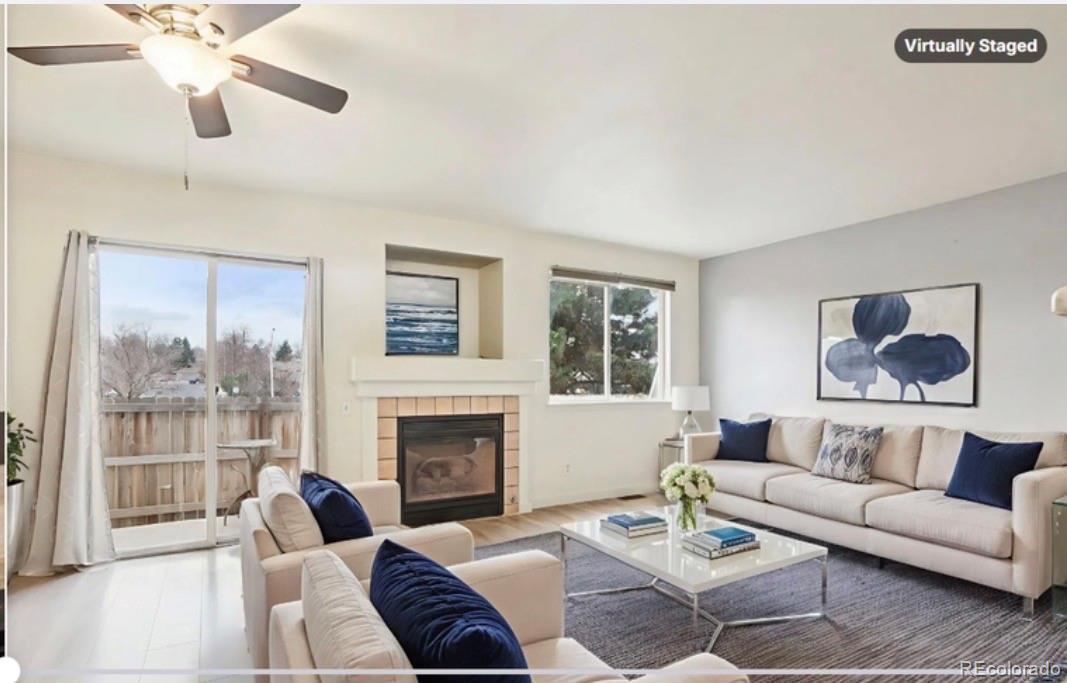 Quail Run townhome with a functional 2-story layout, 2 bedrooms, 3 baths, private fenced patio, and access to community amenities including a pool, fitness center, clubhouse, tennis courts, pond, and hot tub. The main level features an open living and dining area with laminate flooring, a gas fireplace, ceiling fan, and sliding glass door that connects directly to the fenced outdoor space, creating an easy extension of the main living area. The kitchen is positioned adjacent to the dining space and includes granite countertops, stainless steel appliances, updated backsplash, pantry storage, bar seating, and ample cabinet space. Main-floor laundry and a powder bath add convenience and flexibility to the main level. Upstairs, both bedrooms are located on the second floor, including a primary suite with en suite bath, plus a second bedroom with access to its own full bath, creating a dual-suite style layout that works well for a variety of living arrangements. Additional interior features include central A/C, high ceilings, skylight, walk-in closet, neutral finishes, and updated bathroom finishes. A covered front porch adds another usable exterior space, and the property includes one reserved parking space plus one additional off-street parking space. Floor plans are included in the listing media, and the community is FHA-approved. Located in Aurora near Highland Hollows Park, Buckley Space Force Base, E-470, I-225, groceries, retail, dining, trail connections, and regional commuter routes, this home offers strong access to everyday services, recreation, and transportation corridors while maintaining a practical low-maintenance townhome layout.