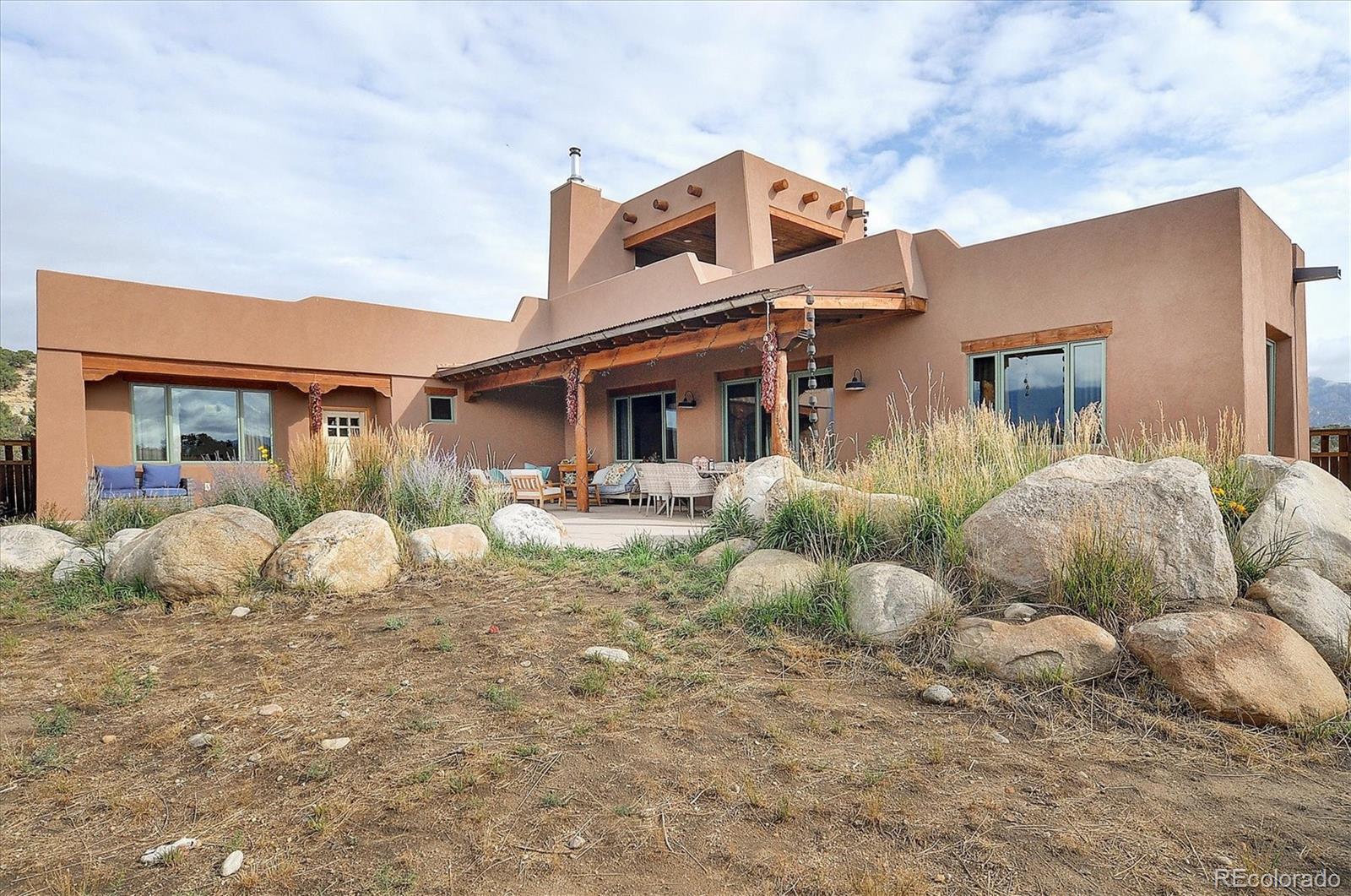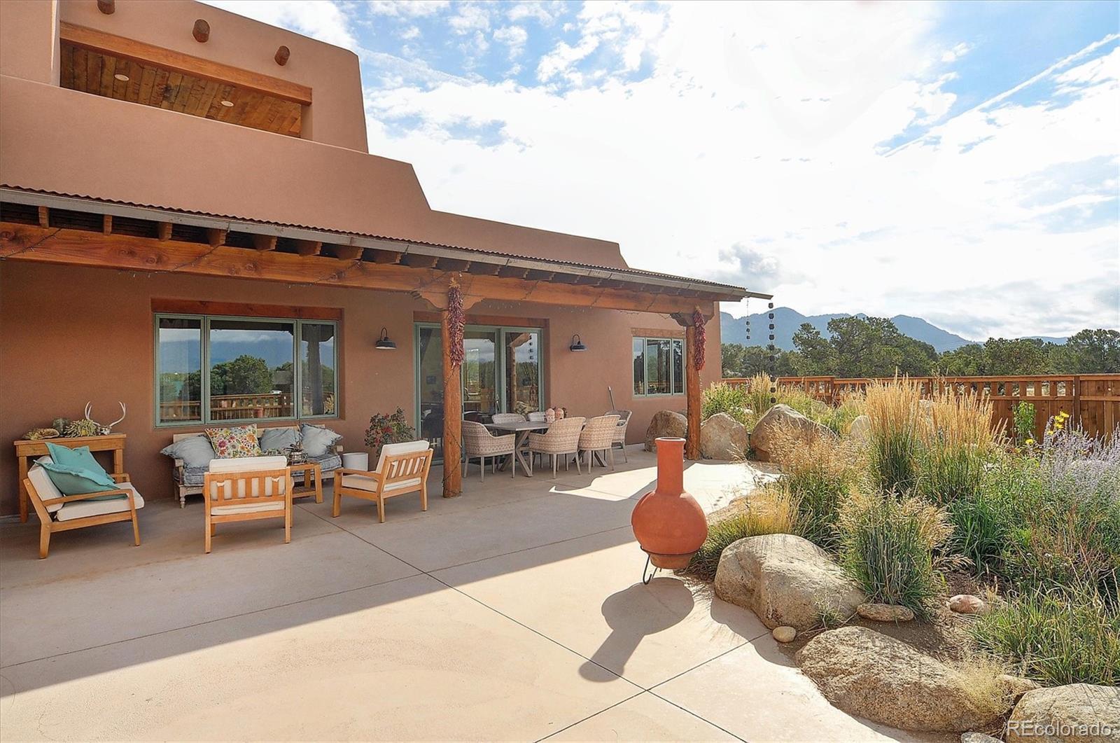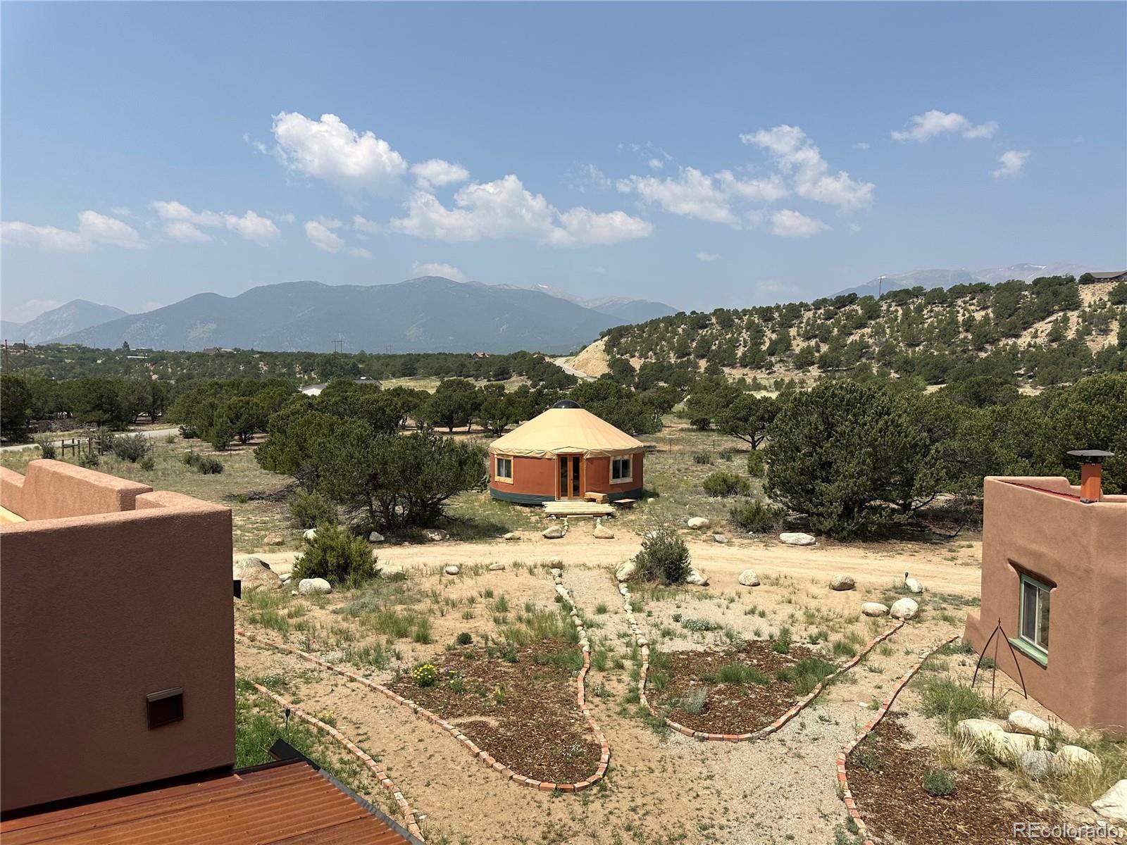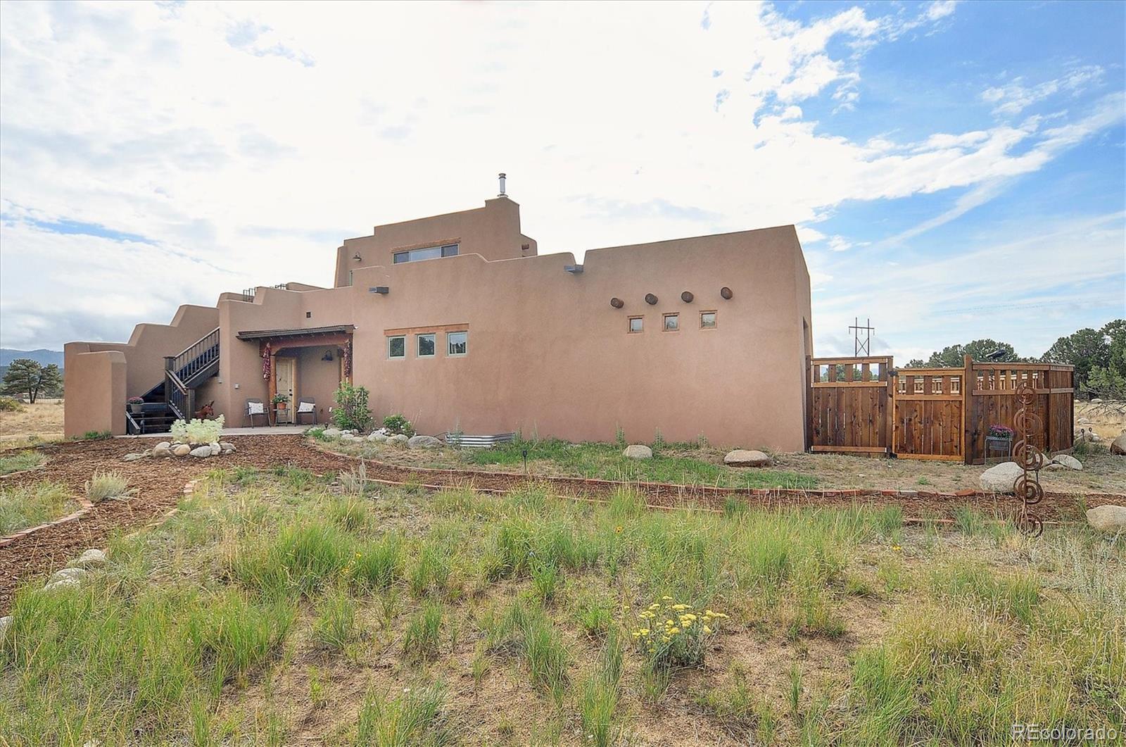 Experience elevated living in timeless Santa Fe style. Nestled in the heart of a storied mountain town rich with heritage and natural beauty, this custom-built residence is the pinnacle of elegance. Thoughtfully designed in the classic Santa Fe style, this home blends handcrafted detail with modern sophistication - all set against a backdrop of sweeping mountain vistas. From the moment you step inside, you're welcomed into a space where organic textures, warm hues, and clean contemporary lines coexist in harmony. Exposed vigas, intentionally curated doors and eclectic features reflect timeless character, while upscale appliances, energy efficient heating units and expansive glass windows bring comfort and innovation to every room. The open-concept great room flows effortlessly into a chef's kitchen and dining space - ideal for entertaining or quiet evenings by the free-standing wood burning stove. Two generously sized suites, spa-inspired bathrooms and private outdoor courtyard offer moments of serenity, while the stunning rooftop deck offers panoramic views that frame sunrises and sunsets over the mountains. Two versatile outbuildings, a large yurt and studio provide additional creative or office space. Augmented well allows for outside watering. Located minutes from historic downtown restaurants and shops, hiking trails, with the Arkansas River and ski slopes nearby, this is more than a home - it's a lifestyle immersed in nature and refined mountain living. See uploaded Special Features document for additional details.