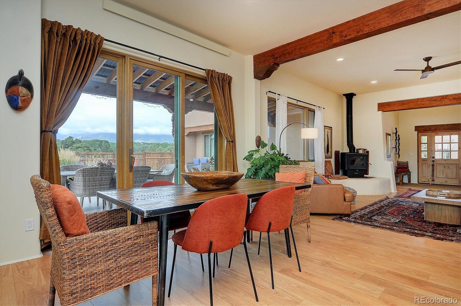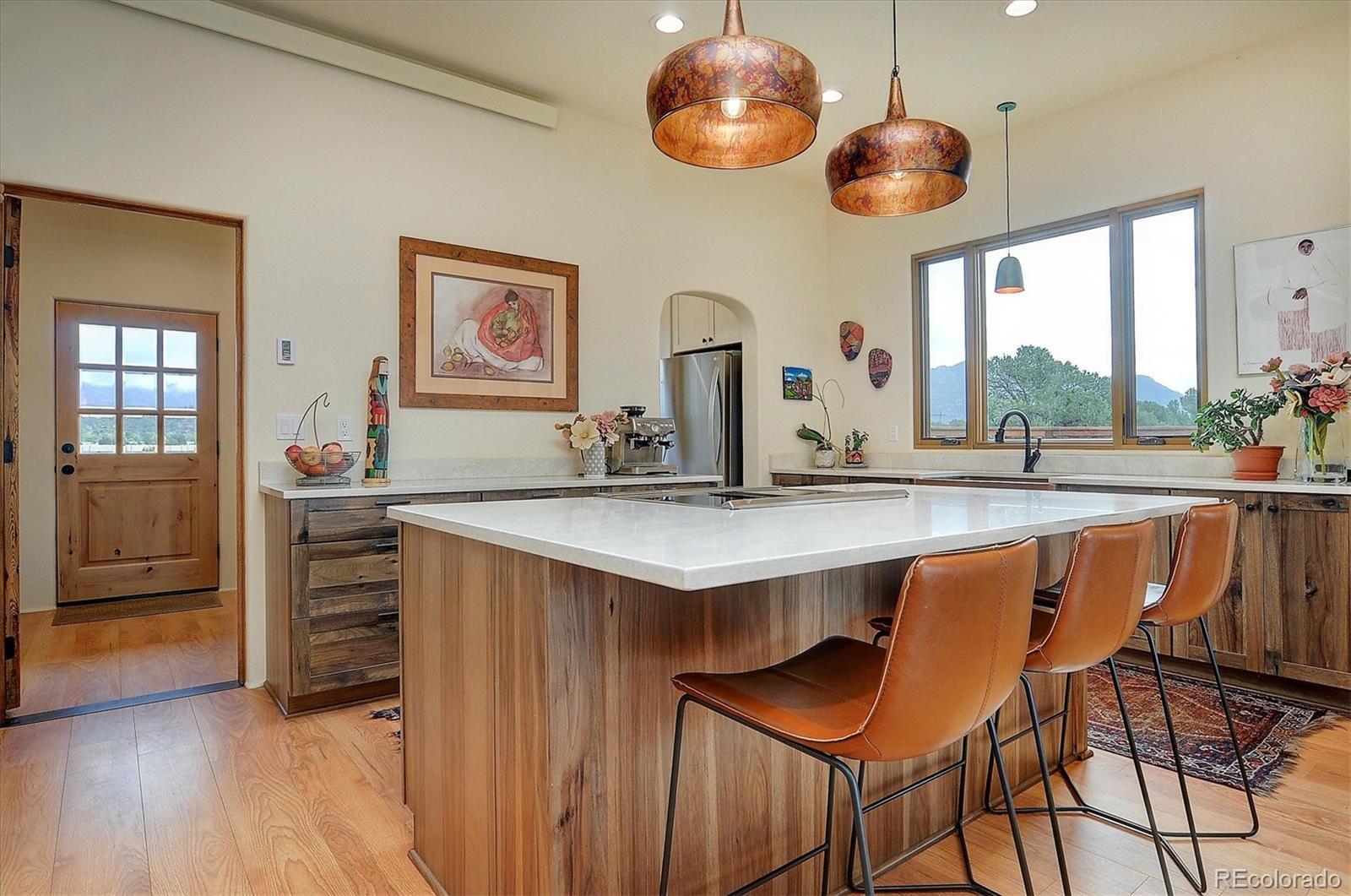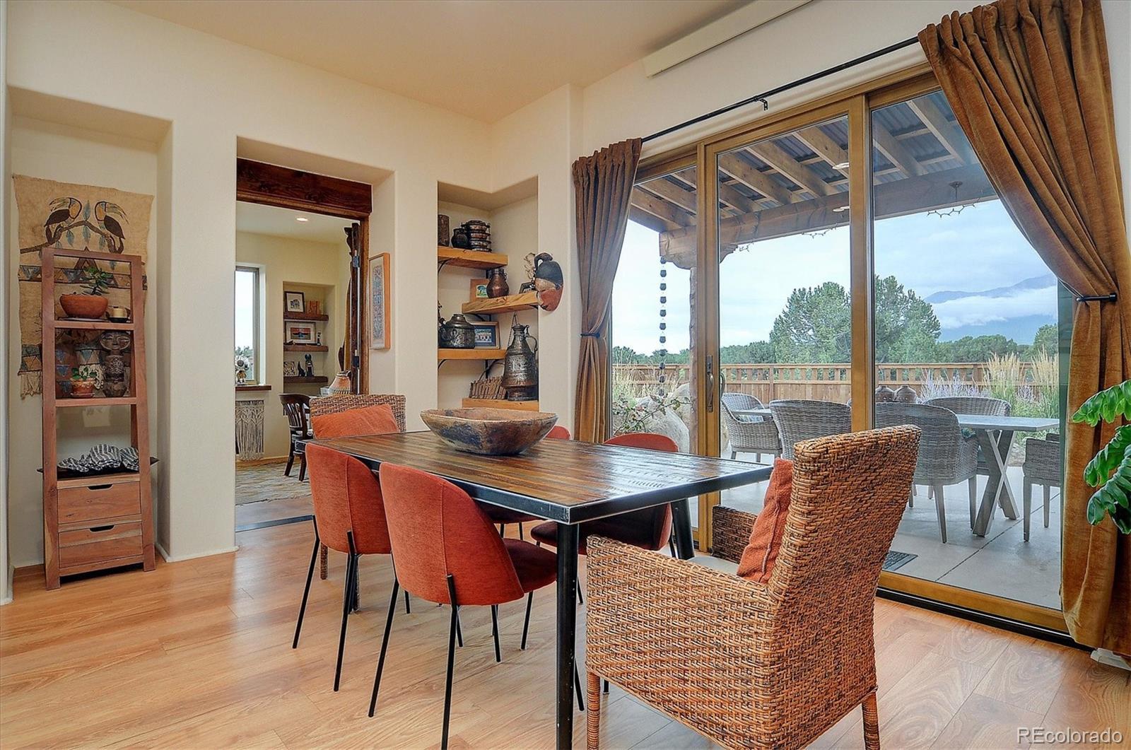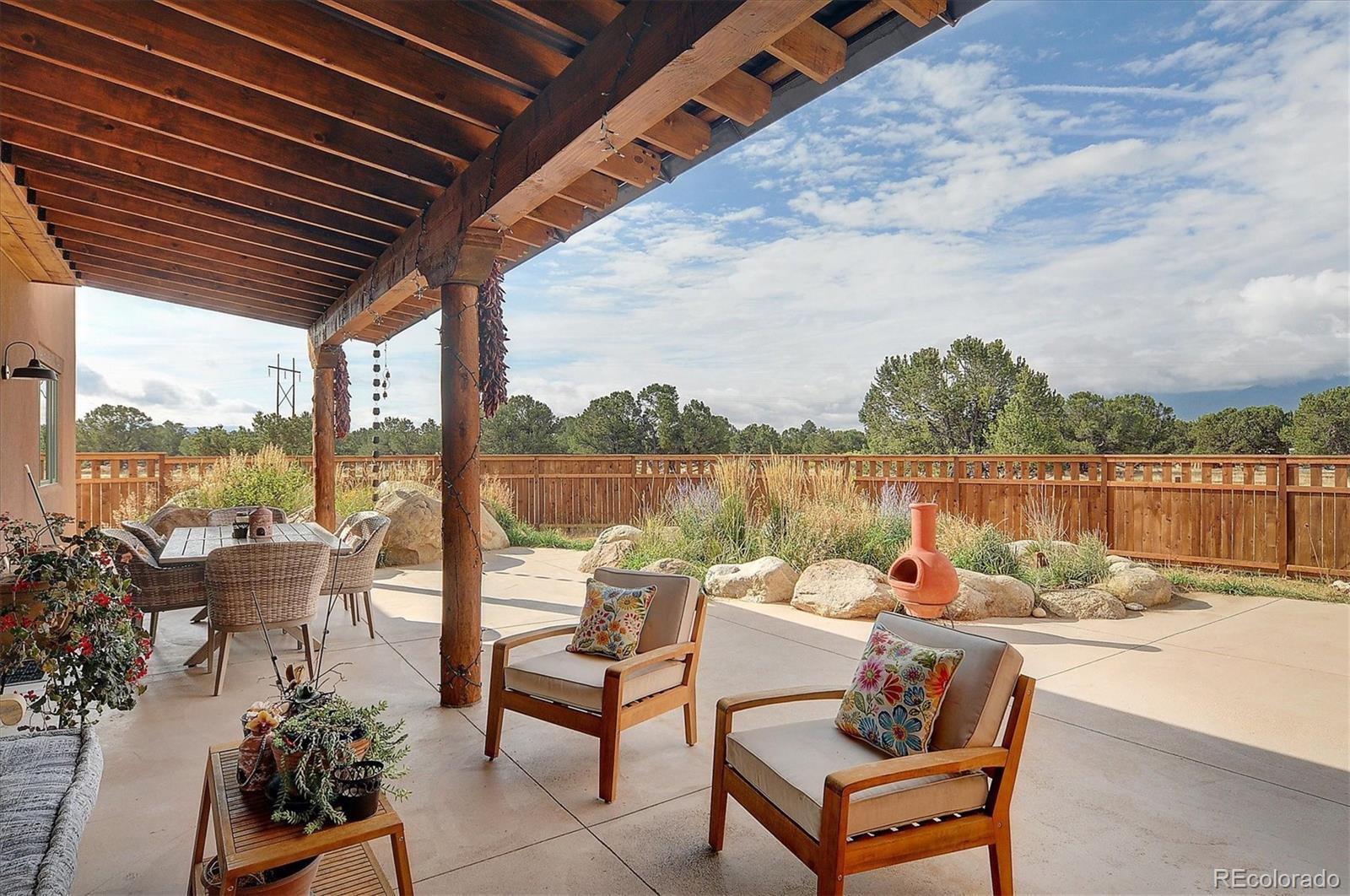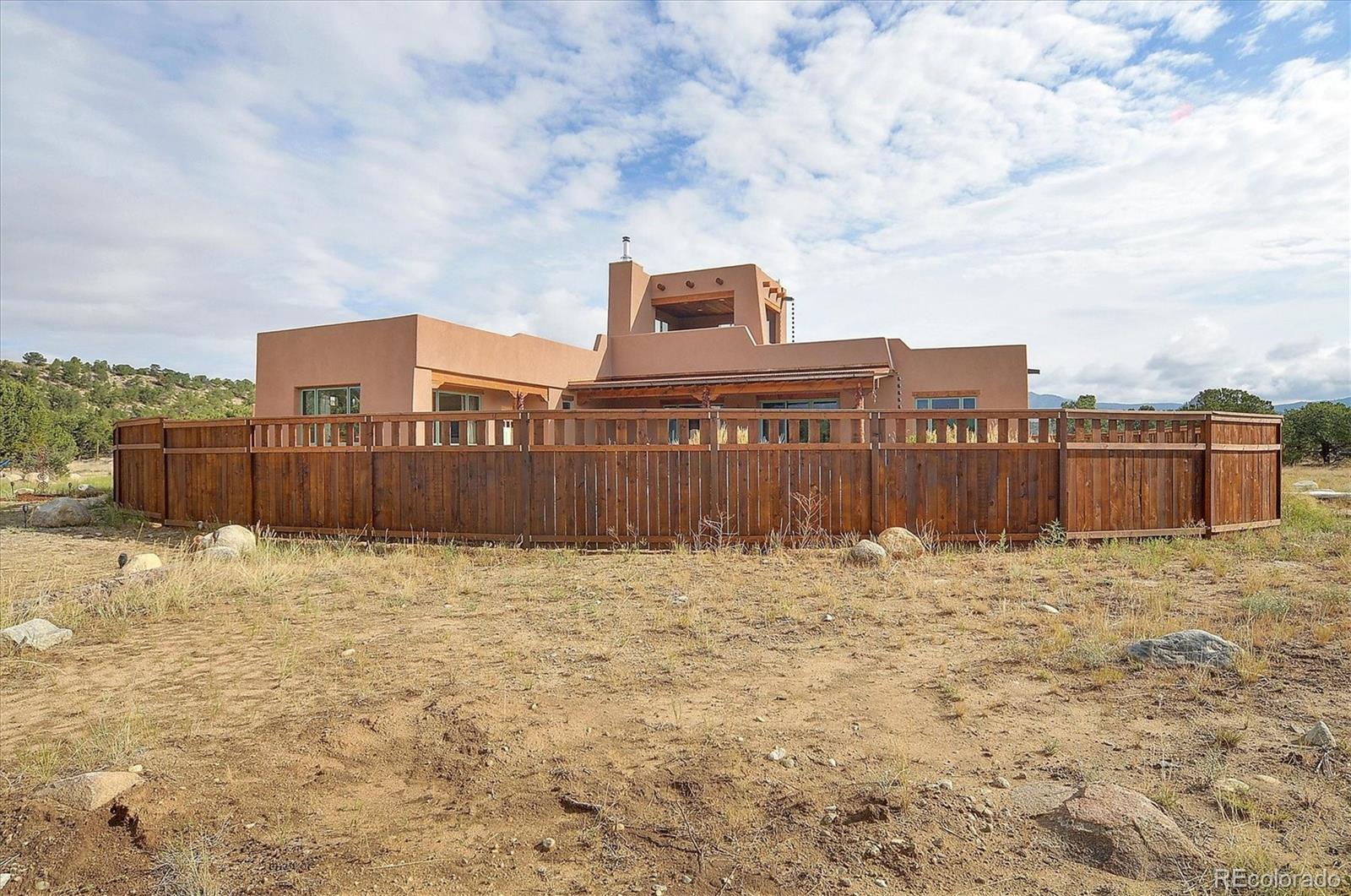 Experience elevated living in timeless Santa Fe style. Nestled in the heart of a storied mountain town rich with heritage and natural beauty, this custom-built residence is the pinnacle of elegance. Thoughtfully designed in the classic Santa Fe style, this home blends handcrafted detail with modern sophistication - all set against a backdrop of sweeping mountain vistas. From the moment you step inside, you're welcomed into a space where organic textures, warm hues, and clean contemporary lines coexist in harmony. Exposed vigas, intentionally curated doors and eclectic features reflect timeless character, while upscale appliances, energy efficient heating units and expansive glass windows bring comfort and innovation to every room. The open-concept great room flows effortlessly into a chef's kitchen and dining space - ideal for entertaining or quiet evenings by the free-standing wood burning stove. Two generously sized suites, spa-inspired bathrooms and private outdoor courtyard offer moments of serenity, while the stunning rooftop deck offers panoramic views that frame sunrises and sunsets over the mountains. Two versatile outbuildings, a large yurt and studio provide additional creative or office space. Augmented well allows for outside watering. Located minutes from historic downtown restaurants and shops, hiking trails, with the Arkansas River and ski slopes nearby, this is more than a home - it's a lifestyle immersed in nature and refined mountain living. See uploaded Special Features document for additional details.