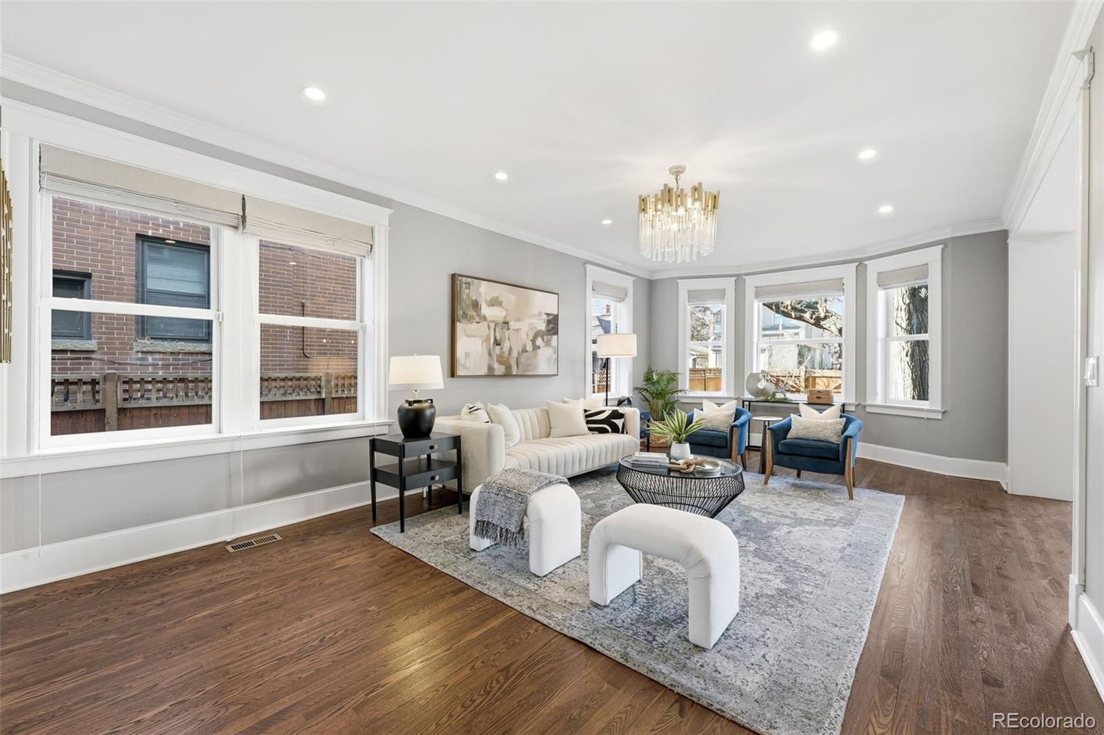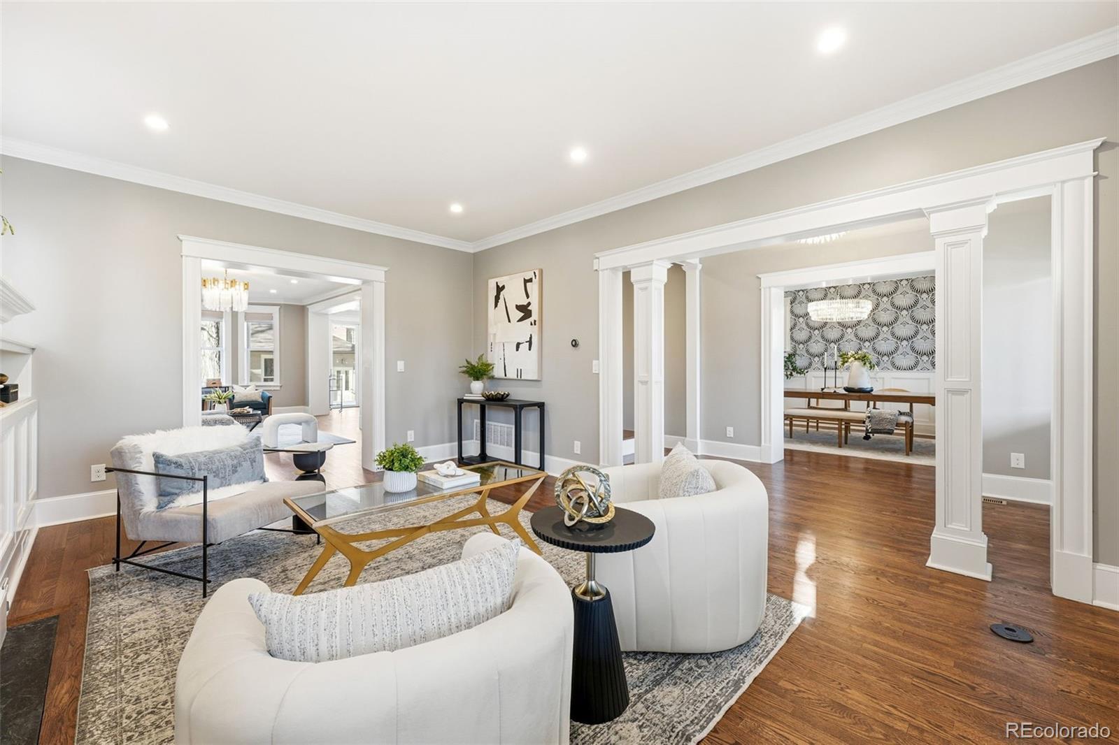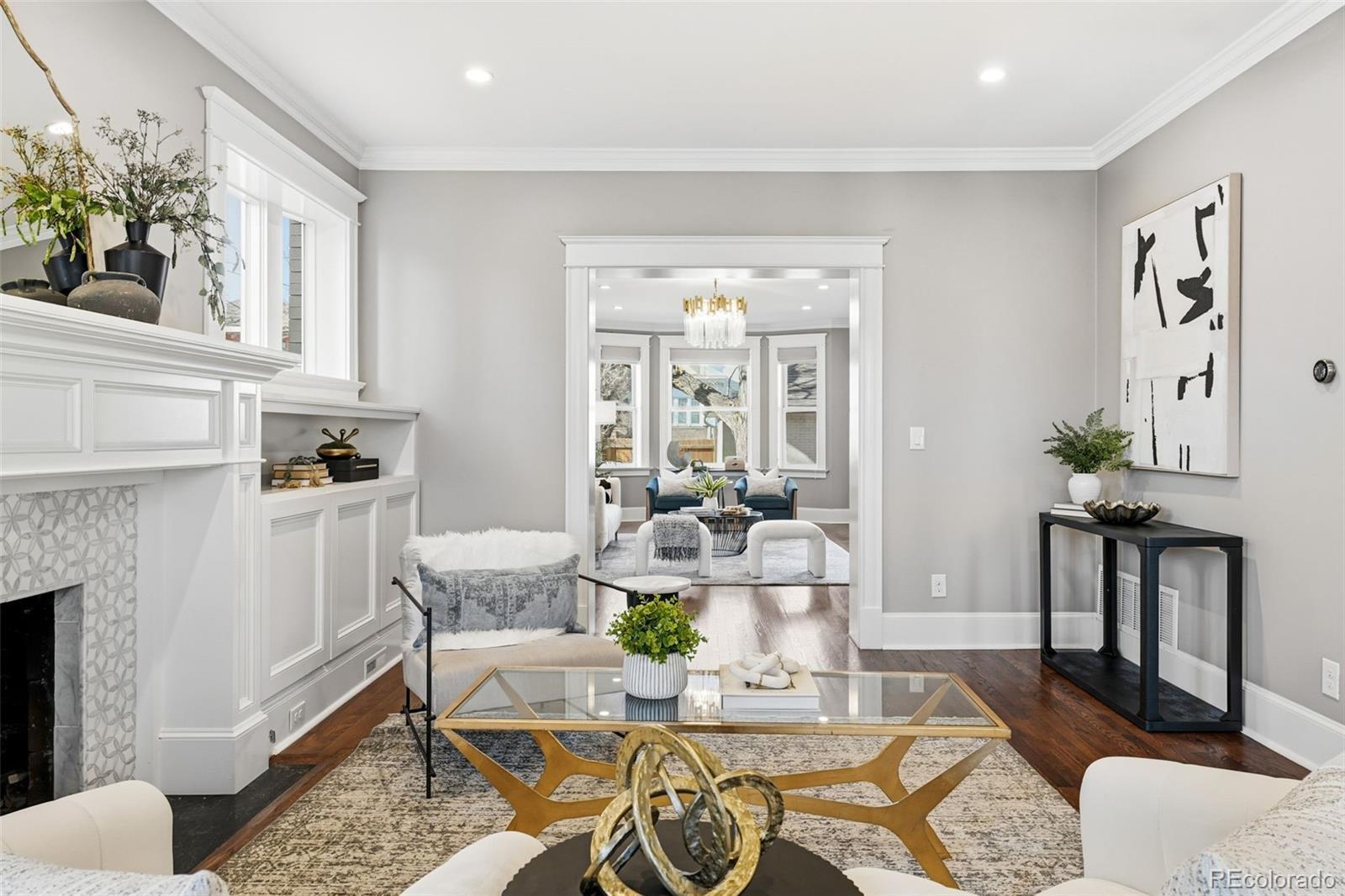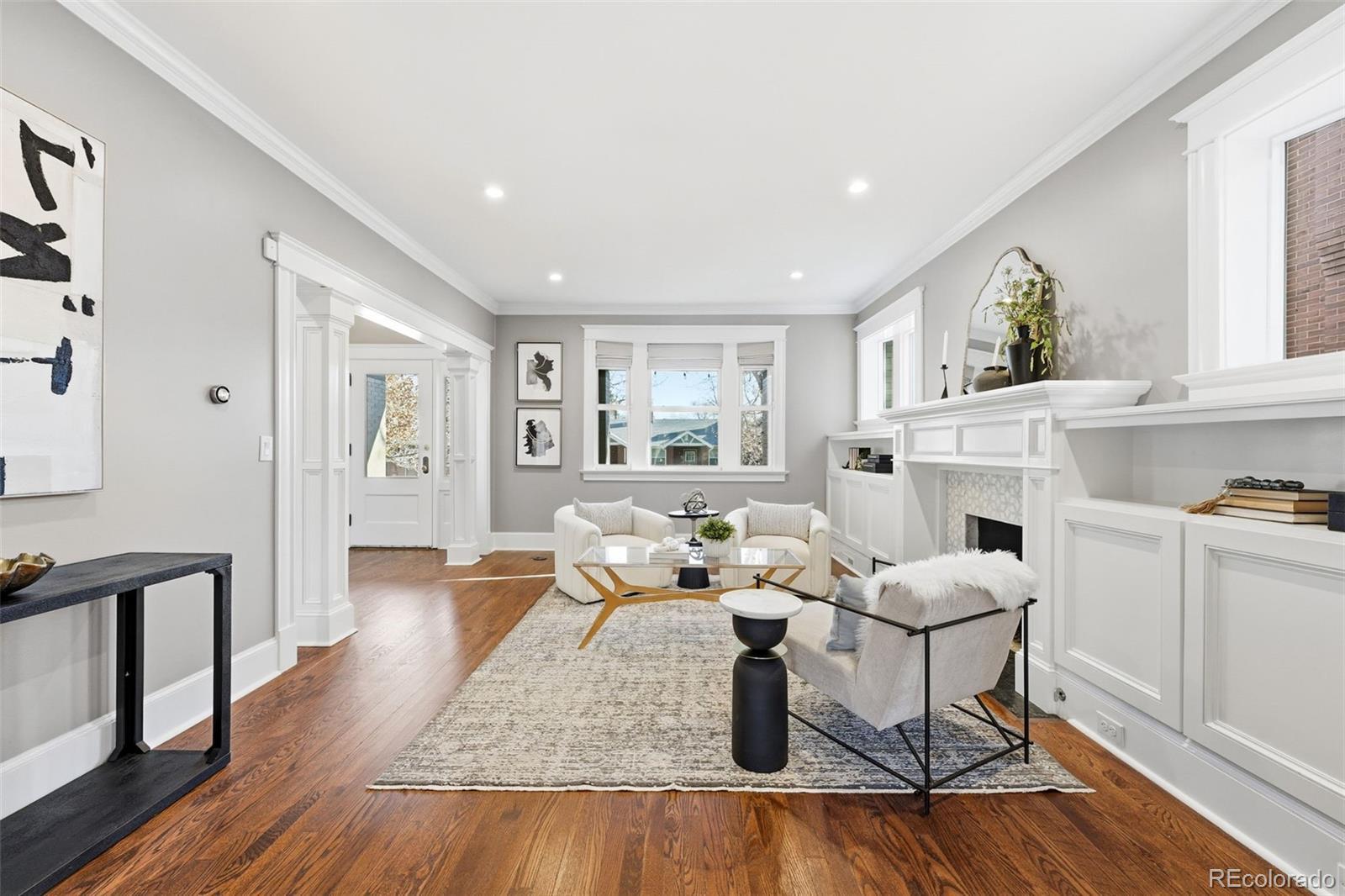 Luxury living in Congress Park is redefined at 1257 Fillmore Street. This stunning 3-story Denver Square has been meticulously renovated for modern living while preserving timeless character. Offering more than 3,700 above-grade square feet and over 5,000 total square feet, the home delivers exceptional scale, design, and functionality across every level. The thoughtfully designed floor plan includes 5 bedrooms, a 3rd-floor loft or bonus space, a dedicated workout room, and 4 beautifully remodeled bathrooms showcasing custom finishes throughout. A classic foyer opens to sun-filled living spaces highlighted by refined trim work, elegant wall coverings, and seamless flow between the formal spaces to the chef's kitchen. At the heart of the home is a show-stopping chef’s kitchen featuring an 8-burner Wolf range, Sub-Zero refrigeration, quartz island, custom mosaic backsplash, and a nano-door wall that opens completely to the flagstone patio—creating effortless indoor-outdoor living ideal for entertaining. The adjacent formal dining room is equally impressive w/custom lighting, wall coverings & ready to host. The second level hosts 4 bedrooms, including a expansive primary suite with hardwood floors, spa-inspired bath with oversized shower, and dual custom closets. 3 additional bedrooms share a designer bathroom with copper sink, penny tile floors, and custom tile work. The 3rd floor offers a versatile retreat—perfect as an office, loft, studio, or private escape among the treetops. The fully finished basement includes a family room w/exposed brick is ready for movies and game night with wet bar, guest suite w/egress, stylish bath w/heated floors, custom tile and wall coverings, laundry room, and additional room for home gym or bonus room. Outside, enjoy a private, fenced yard and patio with coveted southwest exposure, plus a two-car garage and additional storage. A rare blend of historic charm and modern luxury in one of Denver’s most sought-after neighborhoods.
