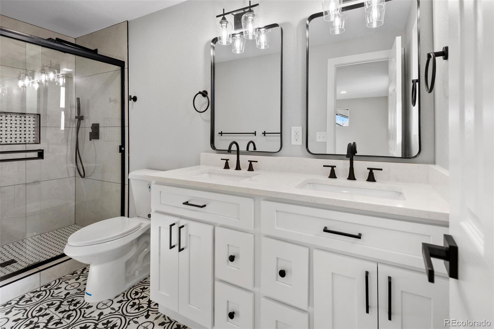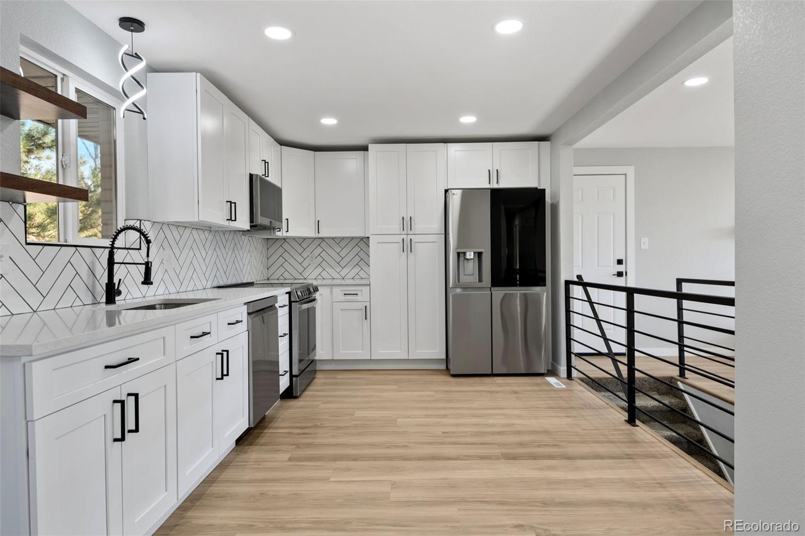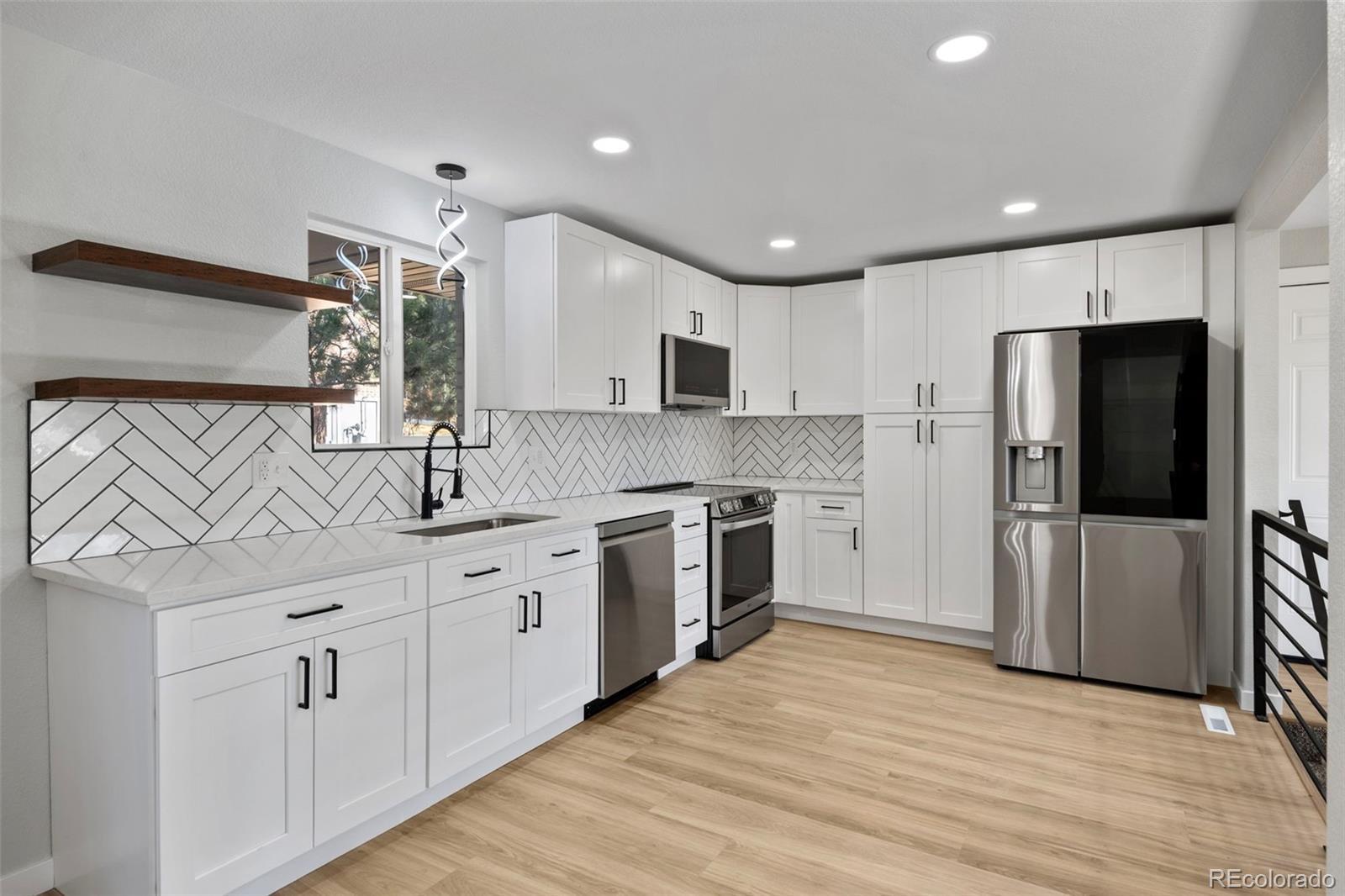 Fully remodeled and truly move-in ready, this 4-bedroom, 4-bath home offers mountain views, flexible multi-generational living spaces, & an exceptional Arvada location close to everything the area has to offer, including just 2 blocks from Majestic View Park & Nature Center! Thoughtfully updated from top to bottom, this home blends modern style with everyday comfort. The open main level features new luxury vinyl flooring, fresh interior finishes, & a spacious great room with a wood burning fireplace, perfect for both daily living and entertaining. The fully renovated kitchen showcases quartz countertops, modern cabinetry, & stainless steel appliances, seamlessly connecting to the main living space. Enjoy breathtaking mountain views from the wraparound covered deck, ideal for morning coffee, evening sunsets, & year-round enjoyment. The main-level primary suite provides easy one-level living with an all new spa-inspired bathroom & generous closet space. The finished walkout basement is perfectly suited for multi-gen living or extended guest space, featuring a large secondary living area, kitchenette space, a private suite with its own new bath, additional bedroom & bath, & direct access to a covered patio & the fully fenced backyard, offering privacy & independence while remaining connected to the home. Recent updates include new windows, flooring, new texture, new interior & exterior paint, new doors & trim, new everything in all 4 bathrooms, updated plumbing, new electrical outlets & light fixtures, a new water heater, newer furnace, new AC, new garage door, new concrete driveway & garage floor, new landscaping, and new fencing. Roof in 2018-Owned solar panels (no lease!) provide energy efficiency & low utility costs. All in a great location close to trails & open space, just minutes from Olde Town Arvada, parks, dining, shopping, commuter routes, this home offers the perfect blend of lifestyle, convenience, and versatility. NO HOA or Metro Tax* Did I mention Views!