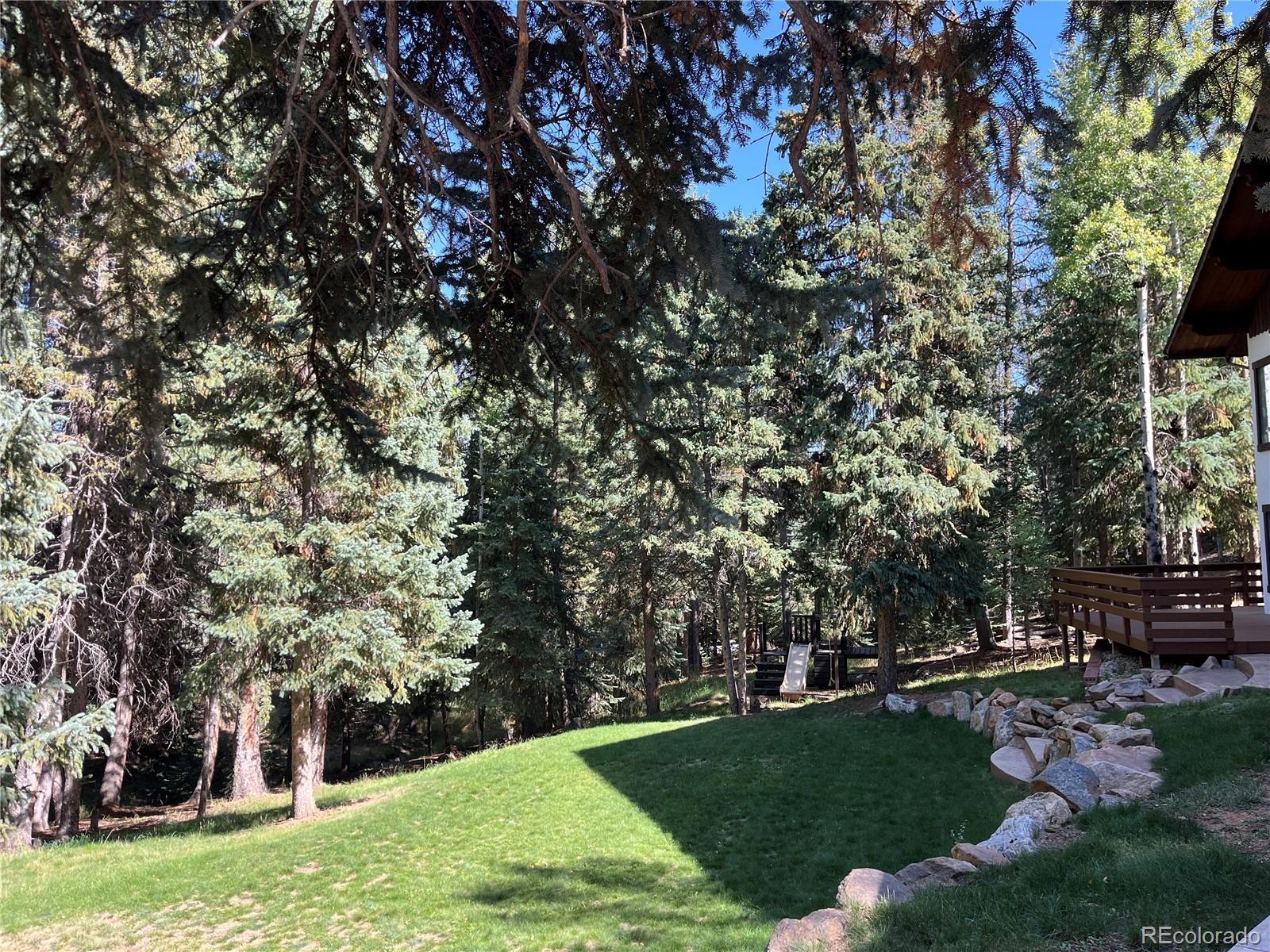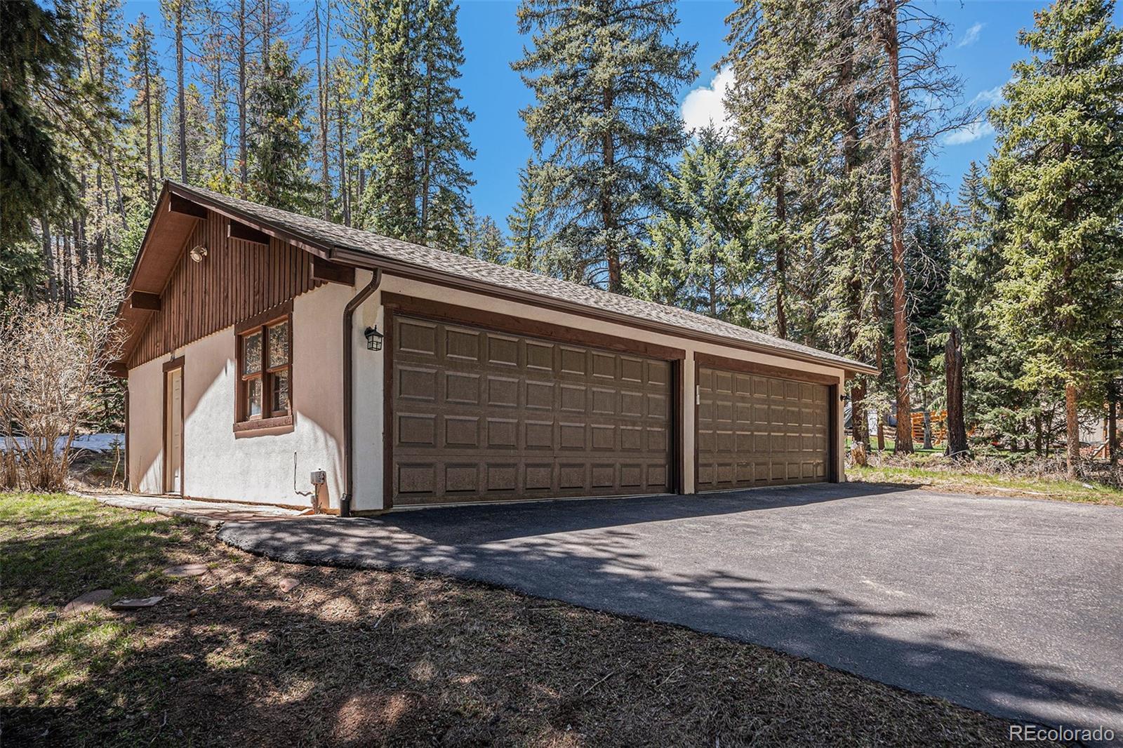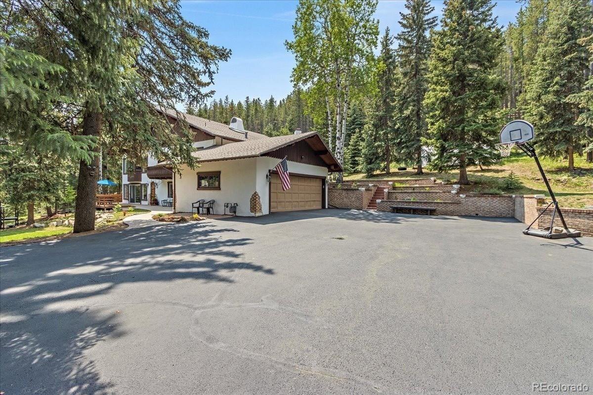 Significant expansion on the lot size! Owners recently absorbed an adjacent 1+ acre lot, bringing the new total property size to a sprawling 3.1+ acres and ensuring your privacy. The home offers nearly 6000 square feet of living space, 6 garage spaces, all on a private lot with blacktopped driveway, public water supply, and a live creek. This three-story, 5 bed, 4.5 bath chalet exudes a delightful blend of charm, character, and contemporary flair. The kitchen features a Bosch 5 burner cooktop, custom maple cabinetry, extensive granite counters, hardwood floors, and stainless steel appliances. The main-level primary suite offers serene views of the forest and features a luxurious master bathroom complete with a deep soaking tub, dual shower heads, and a generously sized walk-in closet. Upstairs, a sizable common area centers two 3/4 baths and four bedrooms, each boasting substantial walk-in closets. Descending to the lower level, you'll discover a welcoming family room, a secluded exercise room and, an additional storage room. Set on 3.1+ private acres, the outdoor amenities include a charming playhouse, playground, extensive decks (freshly refinished and painted), brick and stone patios, and a hot tub that is included in the sale! Ample parking space, including room for boats and RVs, is provided by the blacktopped parking area, alongside a 2-car attached garage and a spacious 4-car detached garage, currently being used as a workshop. Located less than 15 minutes from downtown Evergreen and/or Conifer. Minutes away from Maxwell, Cub Creek and Flying J.