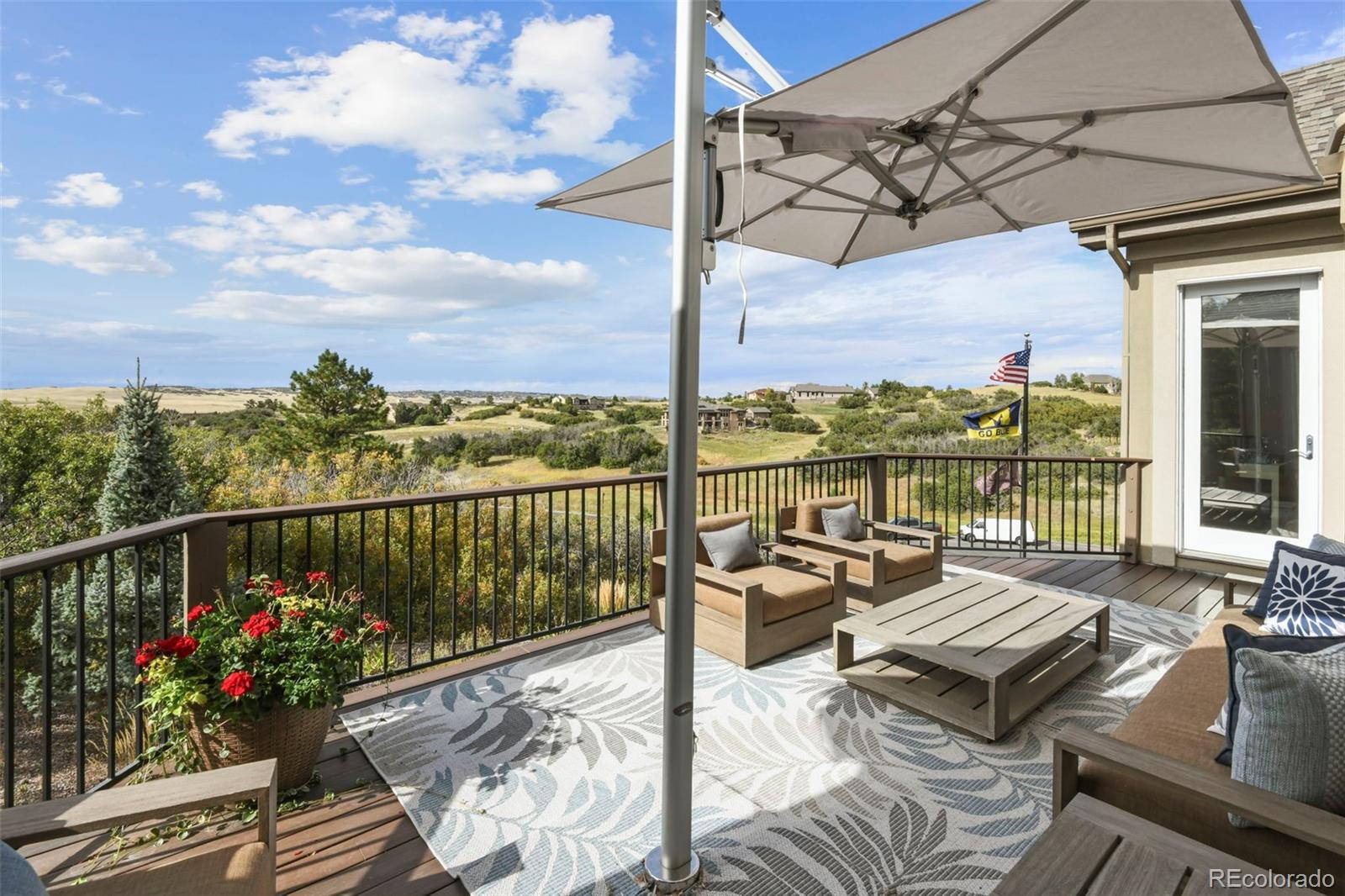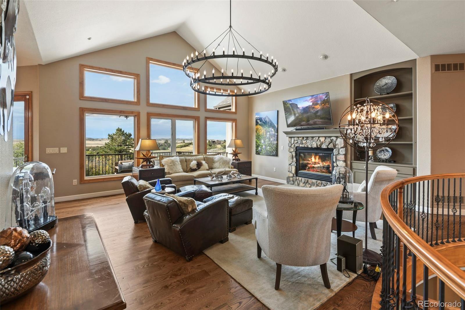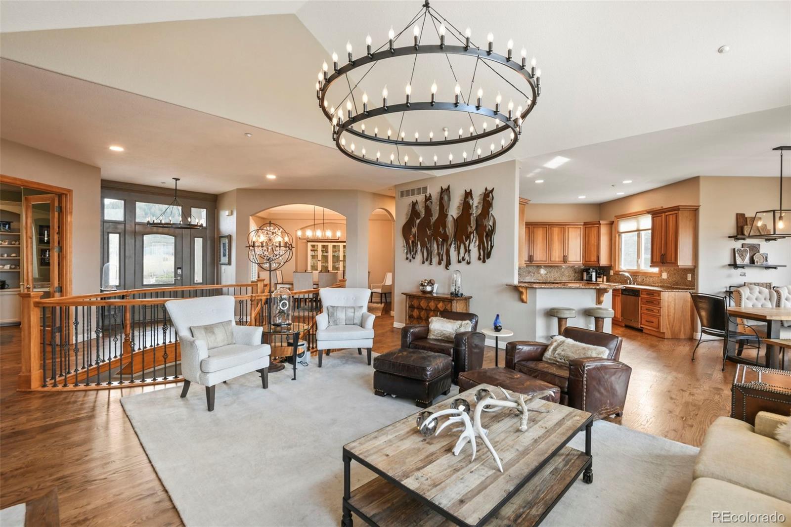 Experience true Colorado living in this custom Bell Mountain Ranch estate designed to blend timeless elegance with modern mountain updates. This thoughtfully designed floorplan offers 4 bedrooms, 4 bathrooms, 2 living spaces, a formal dining, and 2 flex spaces set on a scenic 6.4 acre lot with expansive mountain views. The striking spiral wrought-iron staircase anchors the entry, leading to open living spaces enhanced by three gas fireplaces and custom built-ins throughout. The main level showcases updated 5-inch plank hardwood floors, seamlessly connecting the formal and casual living areas. Indulge in the newly remodeled bathrooms, including a luxurious primary suite with heated floors. Every detail has been thoughtfully customized, from the designer lighting, paint, wood finishes, to the stucco and stone exterior and the oversized 4-car garage not to mention the practical updates such as a new roof, newer HVAC, and AC. Step outside to a large Trex deck and covered patio, perfect for entertaining or enjoying serene sunsets. With trails and open space nearby, plus easy access to I-25, this home balances privacy, recreation, and convenience. This is more than a home — it’s a private retreat where custom craftsmanship meets Colorado beauty.