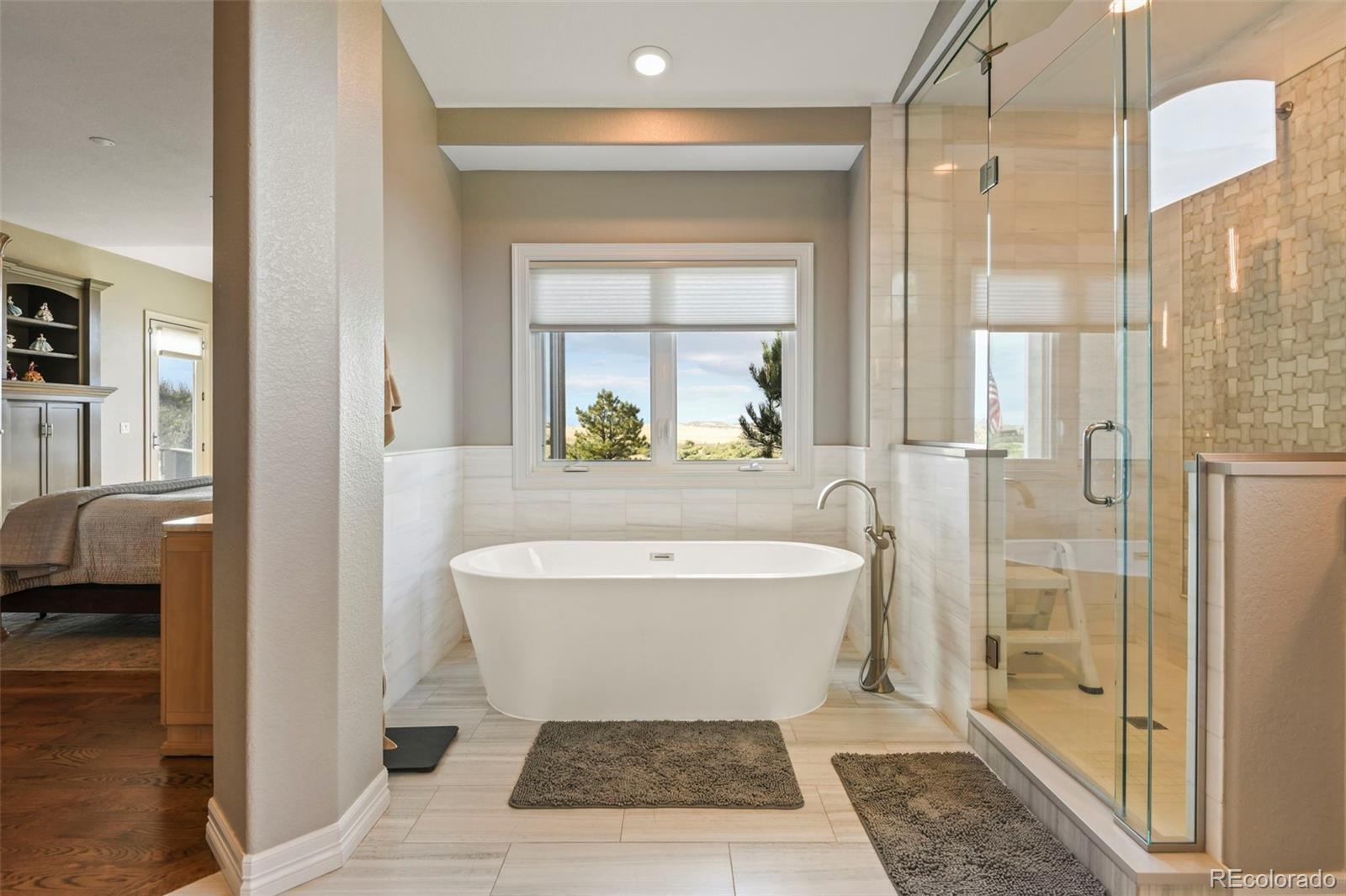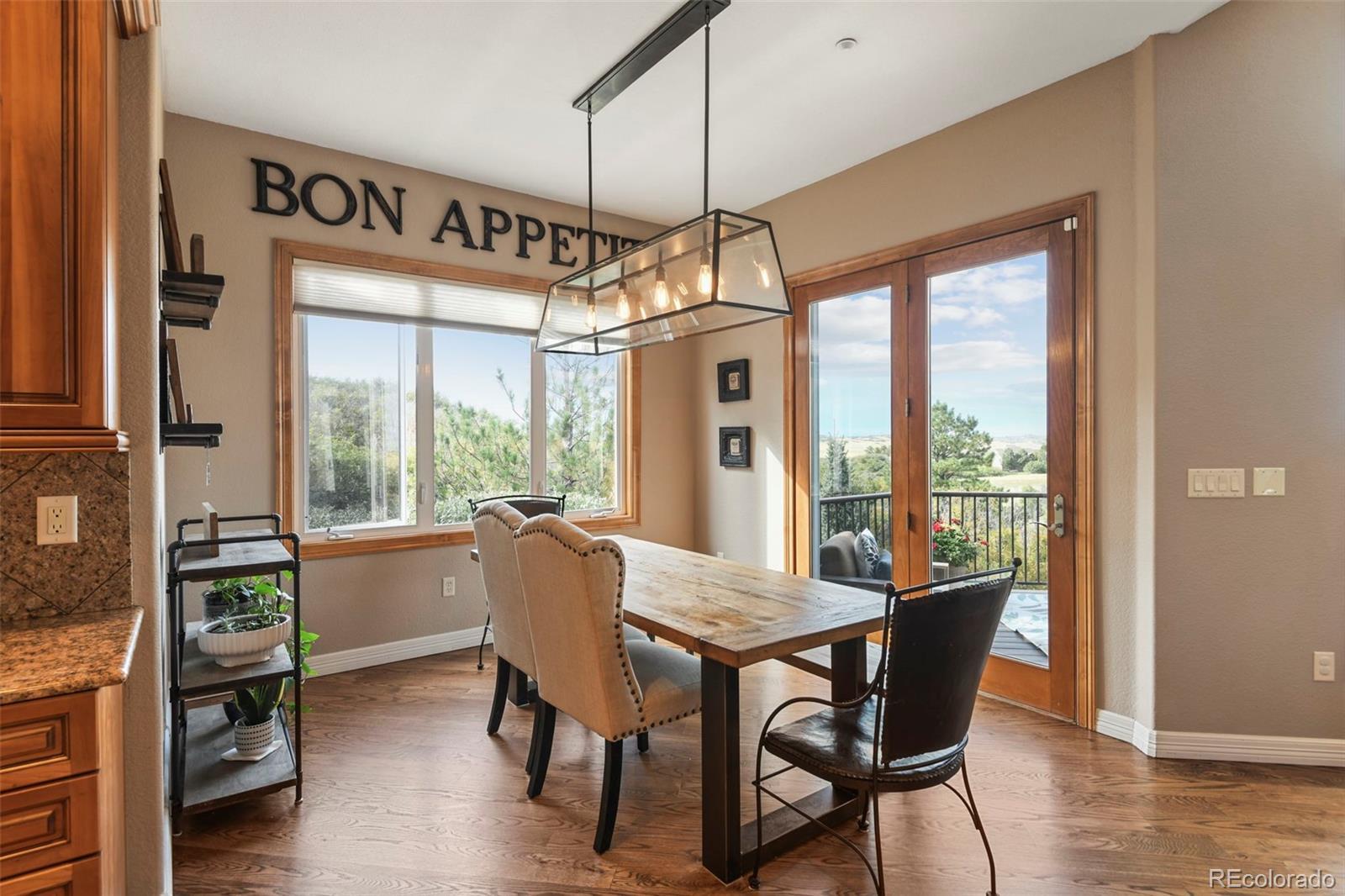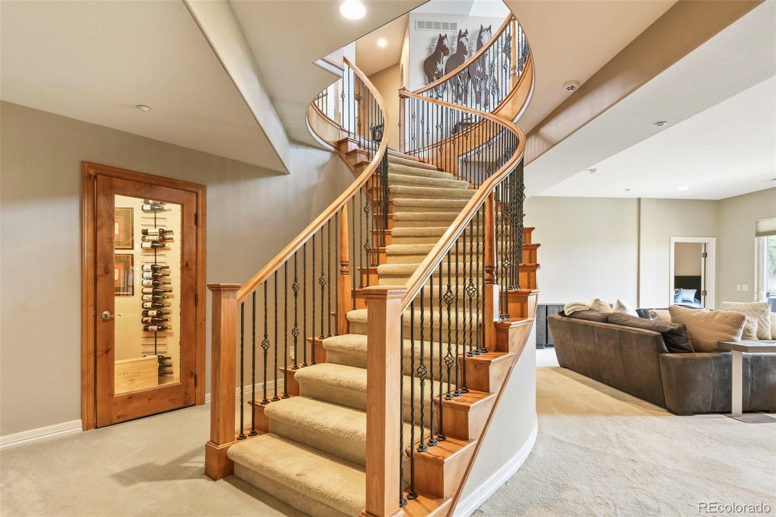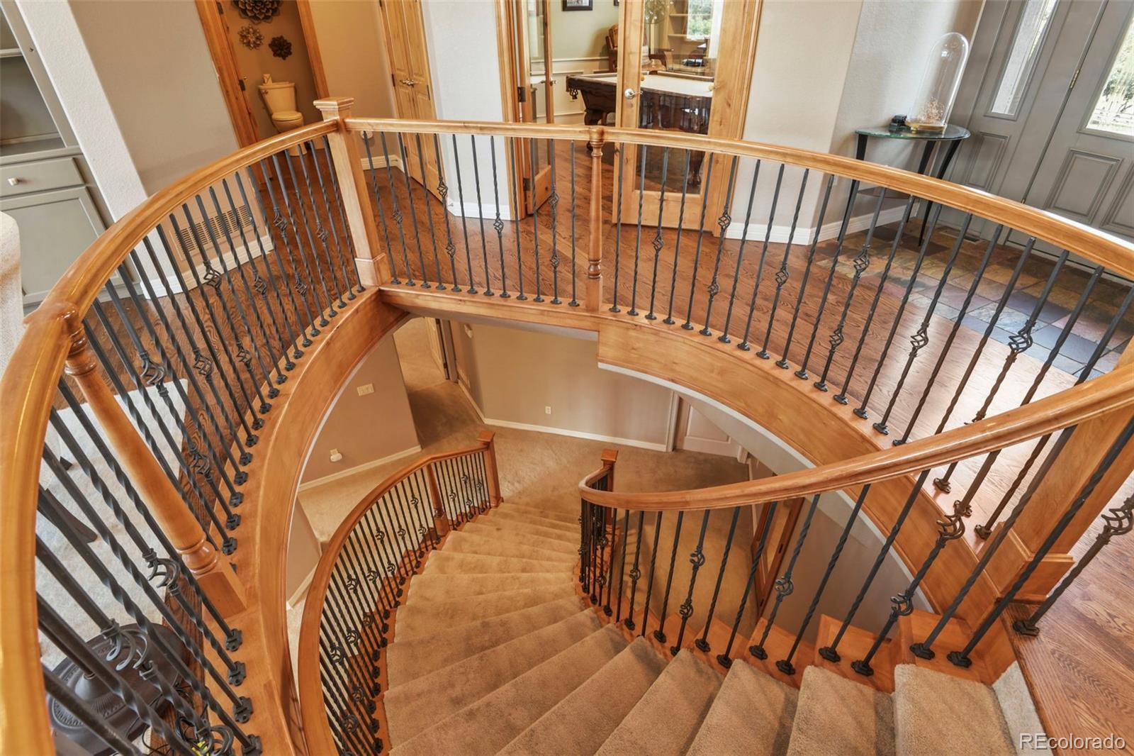 Experience true Colorado living in this custom Bell Mountain Ranch estate designed to blend timeless elegance with modern mountain updates. This thoughtfully designed floorplan offers 4 bedrooms, 4 bathrooms, 2 living spaces, a formal dining, and 2 flex spaces set on a scenic 6.4 acre lot with expansive mountain views. The striking spiral wrought-iron staircase anchors the entry, leading to open living spaces enhanced by three gas fireplaces and custom built-ins throughout. The main level showcases updated 5-inch plank hardwood floors, seamlessly connecting the formal and casual living areas. Indulge in the newly remodeled bathrooms, including a luxurious primary suite with heated floors. Every detail has been thoughtfully customized, from the designer lighting, paint, wood finishes, to the stucco and stone exterior and the oversized 4-car garage not to mention the practical updates such as a new roof, newer HVAC, and AC. Step outside to a large Trex deck and covered patio, perfect for entertaining or enjoying serene sunsets. With trails and open space nearby, plus easy access to I-25, this home balances privacy, recreation, and convenience. This is more than a home — it’s a private retreat where custom craftsmanship meets Colorado beauty.