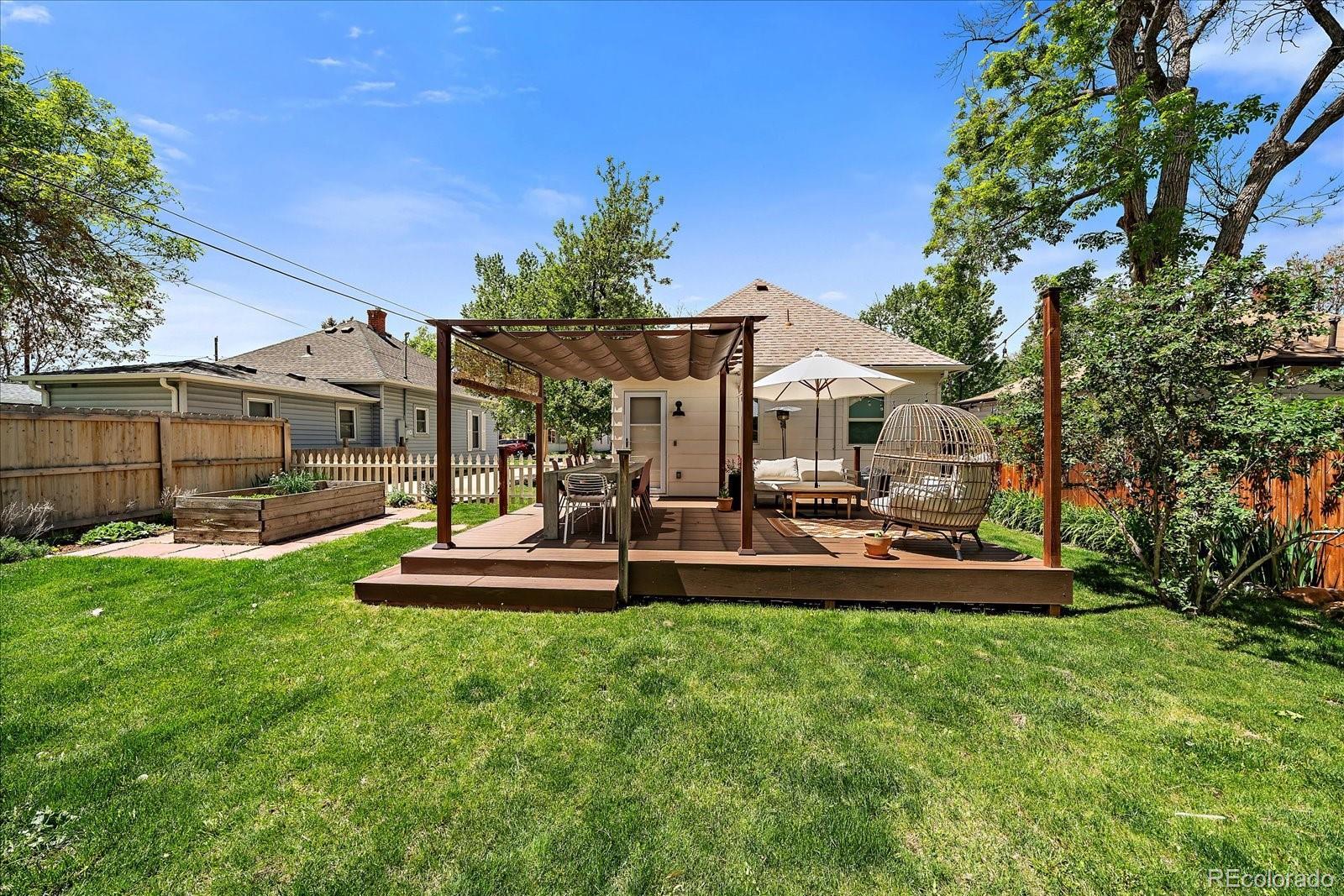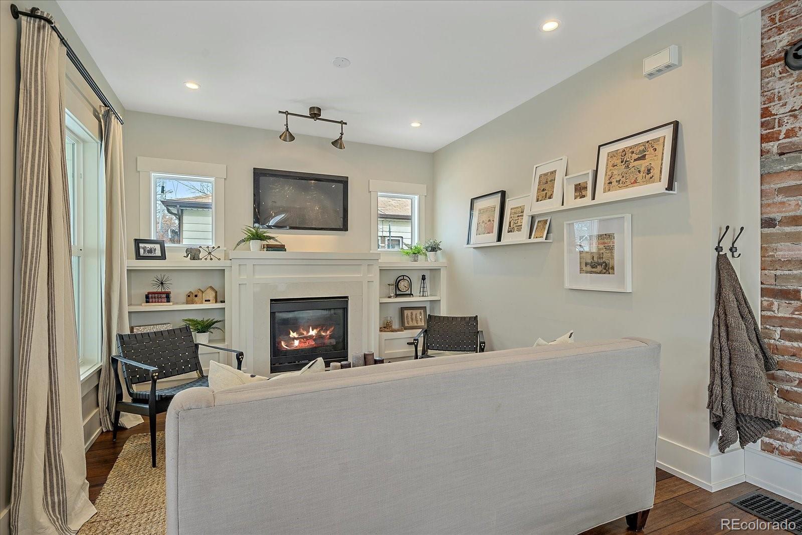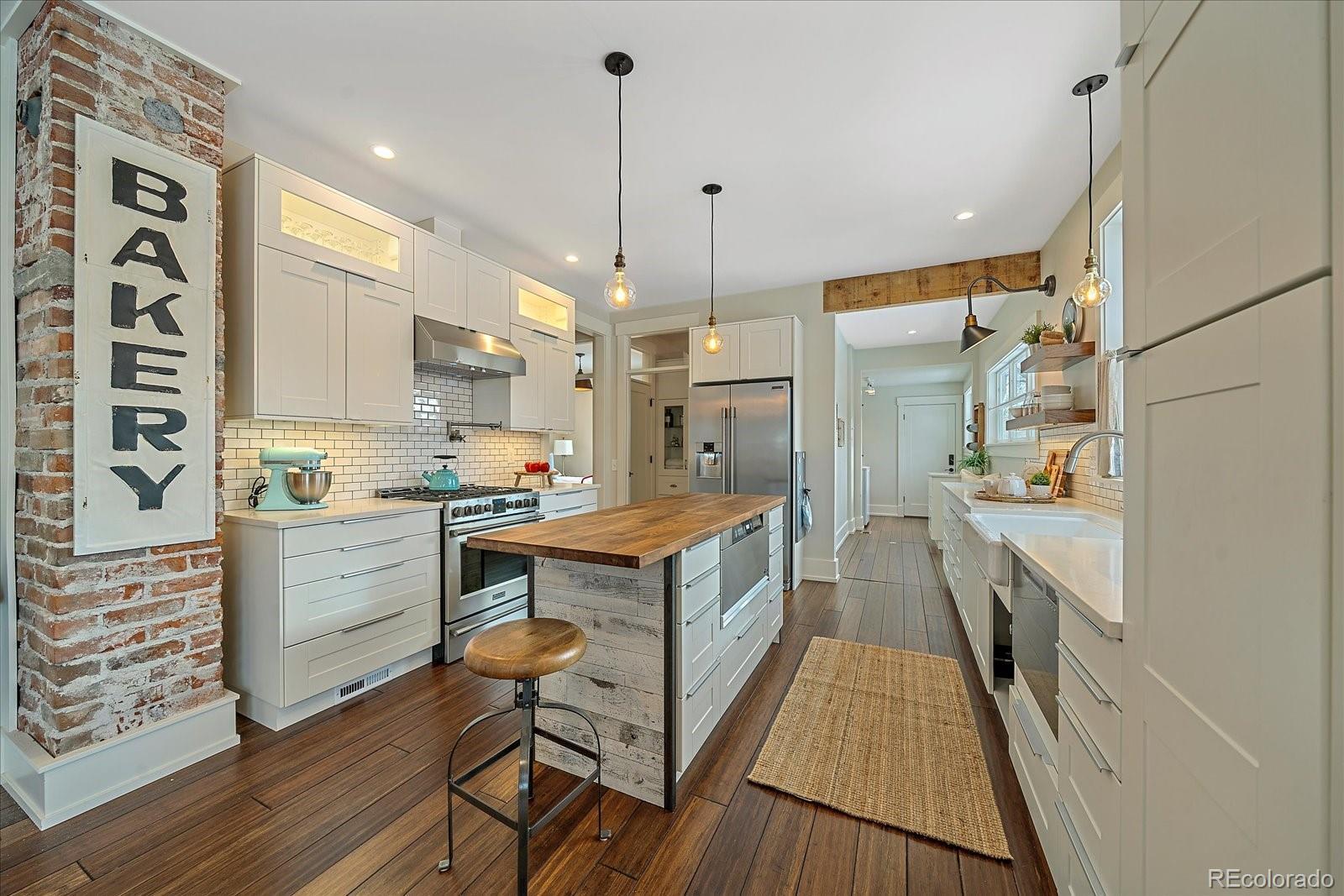 OPEN 3/14 1:30-3:30 This stunning Olde Town Arvada bungalow has been fully renovated from top to bottom, blending historic character with thoughtful modern updates. With nine-foot ceilings, gorgeous pre-finished wood plank floors, and intricate trim throughout, every detail celebrates the home’s original charm. Natural light floods the interior through newer double-pane windows and transom windows above doorways, while an exposed brick column adds warmth and character. The designer-inspired kitchen is a showstopper, featuring ample cabinetry with pull-outs, open shelving, farm sink, under-mount and interior cabinet lighting, quartz counters extending into the laundry/mud area, a butcher block island, and high-end appliances including a Fisher & Paykel dishwasher, Dacor drawer microwave, and gas range. Light fixtures, hardware, and bath finishes are largely Restoration Hardware and were thoughtfully selected with nods to the home’s historic roots. The inviting living space boasts a gas fireplace flanked by custom built-ins with hidden outlets, perfect for media or display. The main bath offers a luxurious subway-tiled shower and custom storage including an inset medicine cabinet. A large, stand-up crawl space with a custom pulley system provides abundant storage. Step outside to a private backyard oasis with a fully sodded and sprinklered lawn, a spacious Trex deck with gazebo, cedar hot tub, garden box, and storage shed. A concrete double driveway accommodates three vehicles. Modern comforts include a high-efficiency furnace, central air, and on-demand tankless water heater. Located in a quiet, well-kept neighborhood just a block to downtown Arvada, Light Rail station, dining, shopping, wineries, and loads of local events. Proximity to Downtown Denver, Boulder, and I-70 makes this home ideal for city access or mountain getaways. Perfect as a primary residence or even as an STR, this home combines historic charm, luxury finishes, and unmatched location.