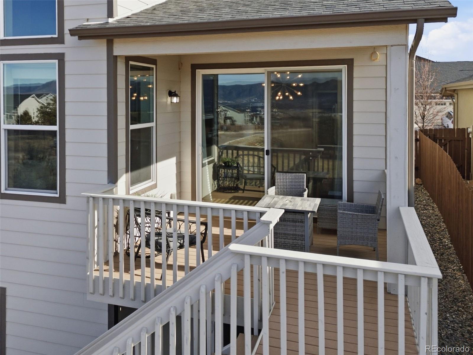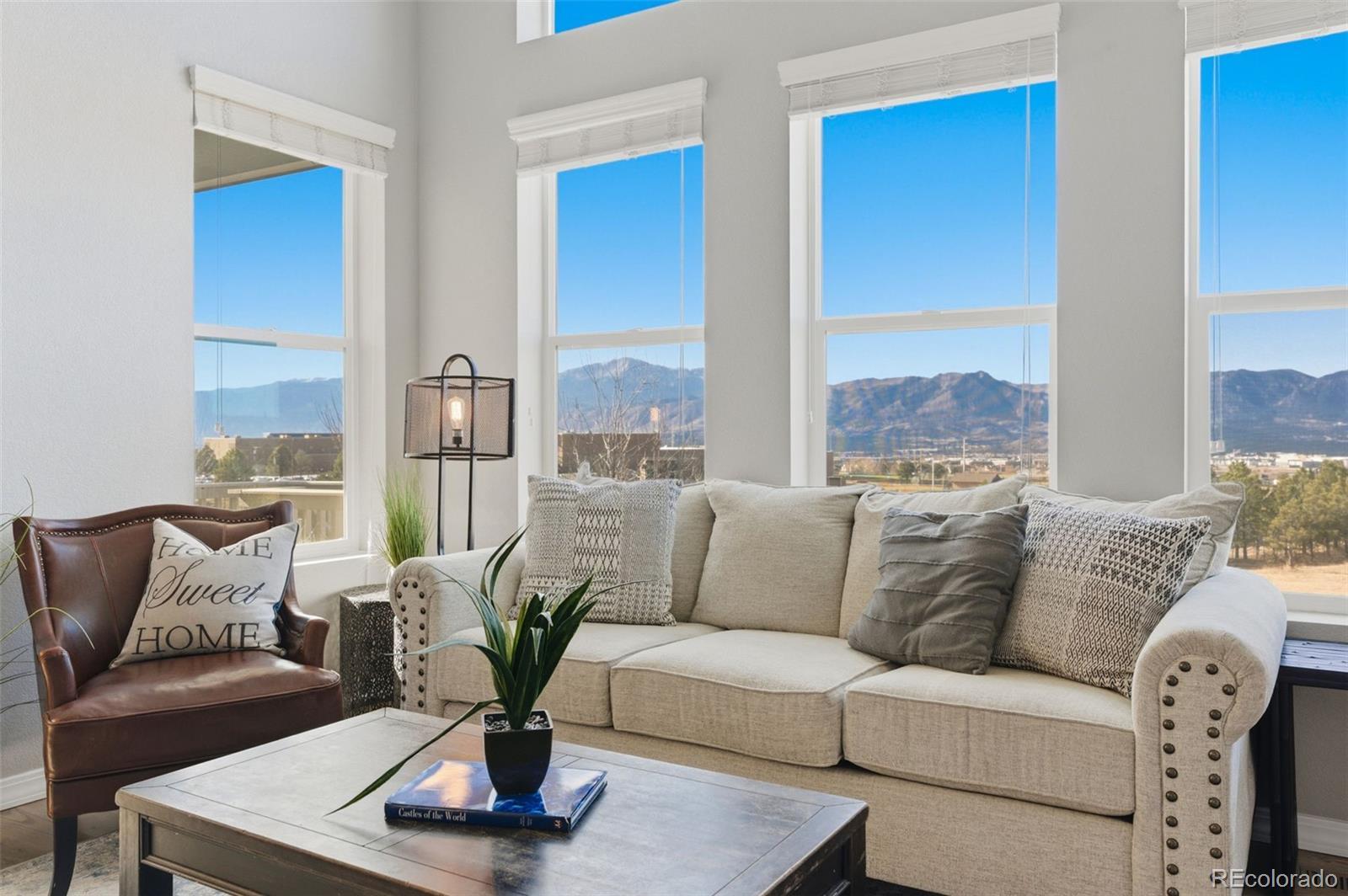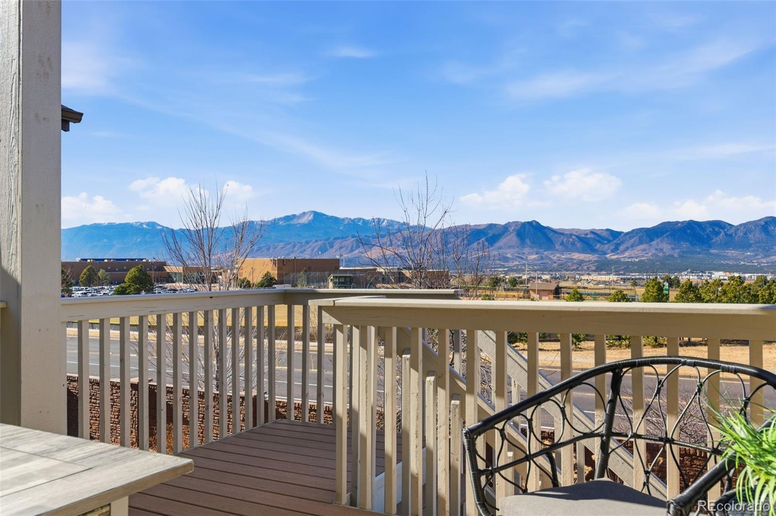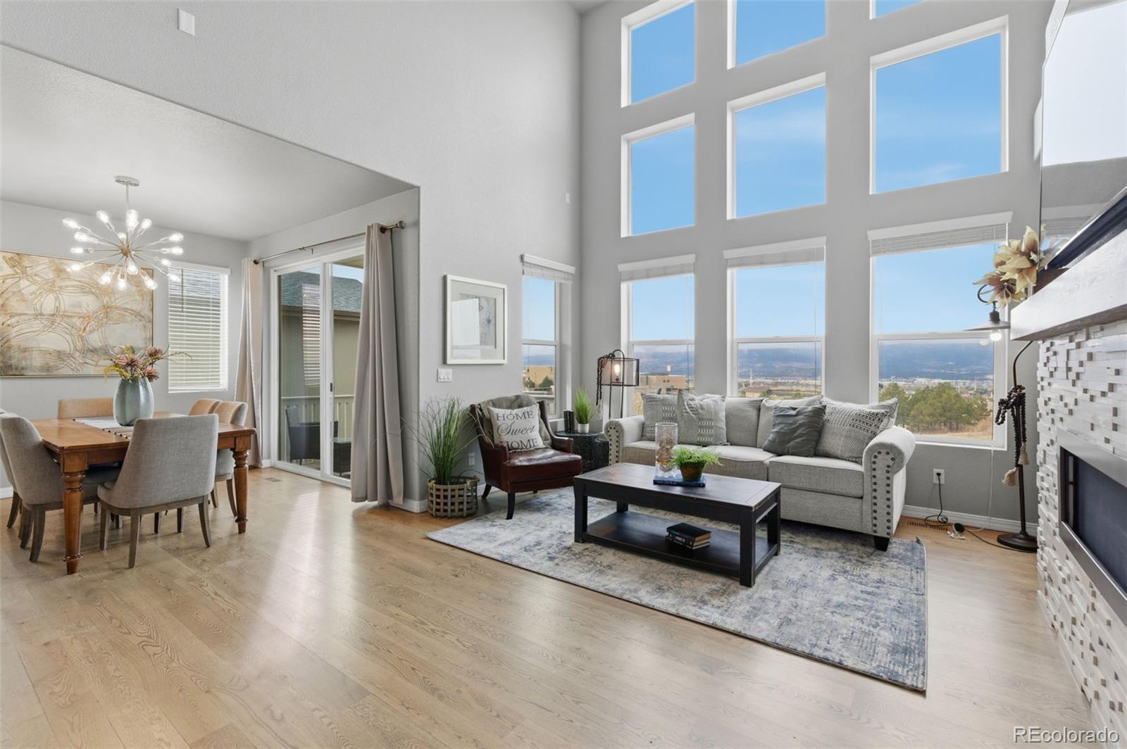 Enjoy unobstructed Pikes Peak and sweeping Front Range views from this beautifully upgraded home featuring a main-level primary suite and no rear neighbors. Designed with an open, light-filled floor plan, the home offers new carpet (2023), oak hardwood flooring on the main level, custom lighting, and a finished walk-out basement with 9-foot ceilings. The kitchen gray soft-close cabinetry with under-cabinet lighting, granite countertops, a large island, pantry, stainless steel appliances, and a 5-burner gas range—perfect for entertaining. The great room stuns with vaulted ceilings, two-story windows, and a modern stacked-stone fireplace. The adjacent dining area opens to a covered deck, ideal for sunsets. The main-floor primary suite features spectacular views, a spacious walk-in closet, and an upgraded bath with tiled floors and upgraded shower. Also on the main level: a private office with French doors and a convenient laundry room with included washer and dryer, plus a second upper-level laundry hookup. Upstairs offers three bedrooms, a full bath, a second laundry room, and an open loft overlooking the great room with incredible mountain views. The fully finished walk-out basement includes two additional bedrooms, a full bath, a large recreation room with surround sound, and walk-out access to a private patio. A generous storage room offers the potential for a seventh bedroom. Located in the desirable North Fork community in Academy School District 20, just a short walk to Encompass Heights Elementary STEM Academy and Pine Creek High School. Additional features include security cameras, a smart doorbell, a whole-home humidifier, washer/dryer, a refrigerator, a 65-inch TV in the family room, new roof 2022, an additional water hookup for a refrigerator in the utility room and pre-wiring for a hot tub.