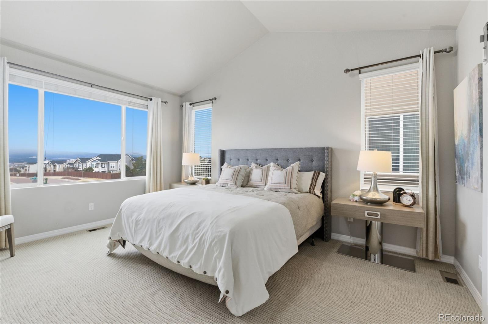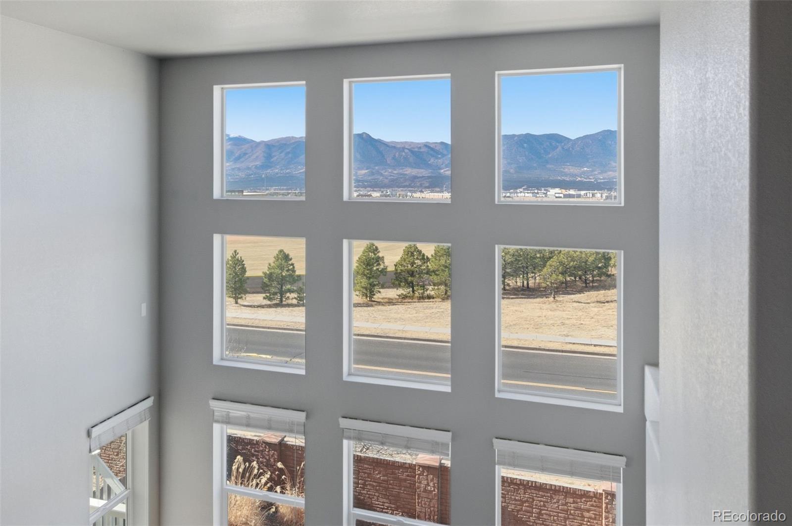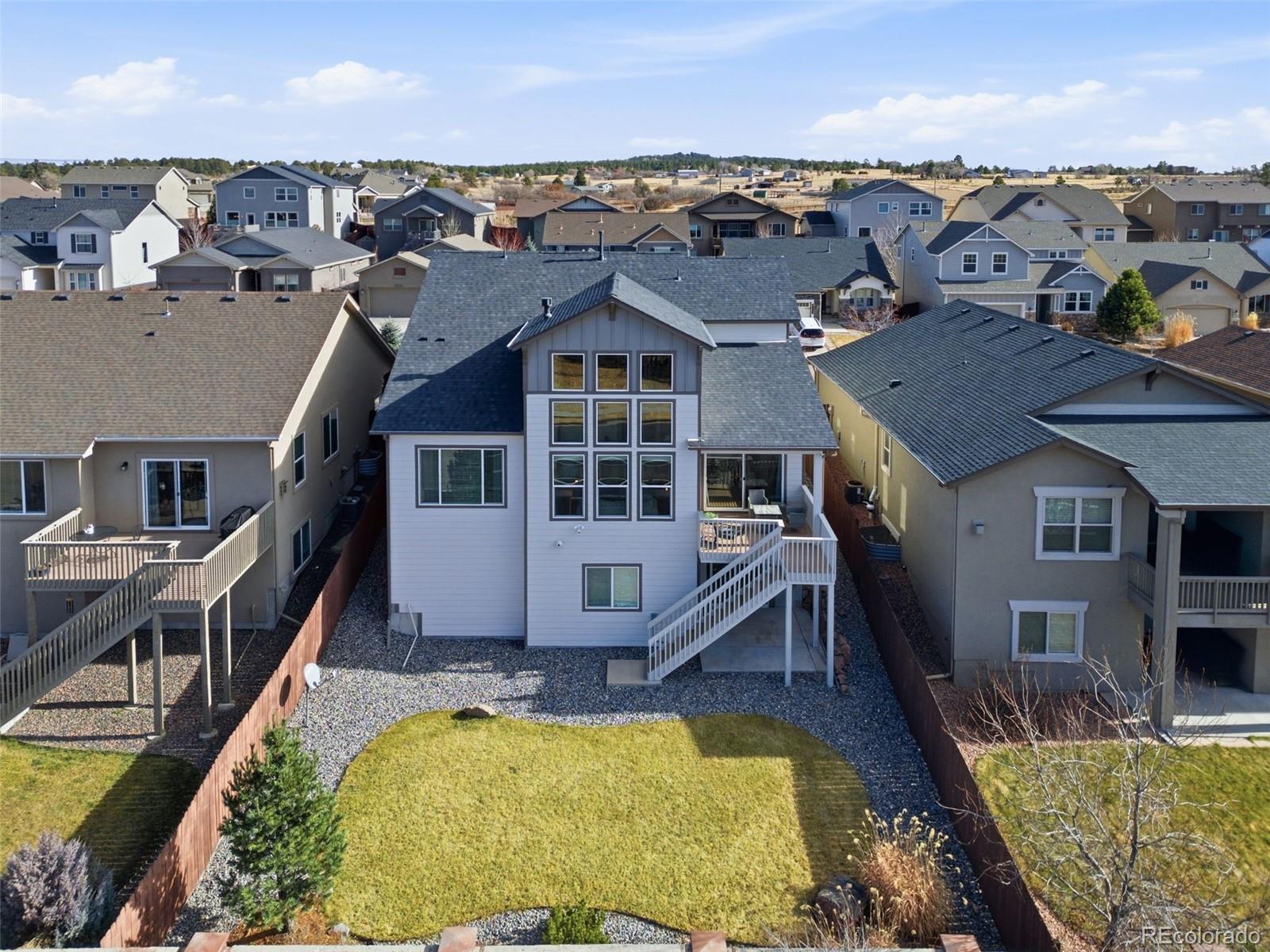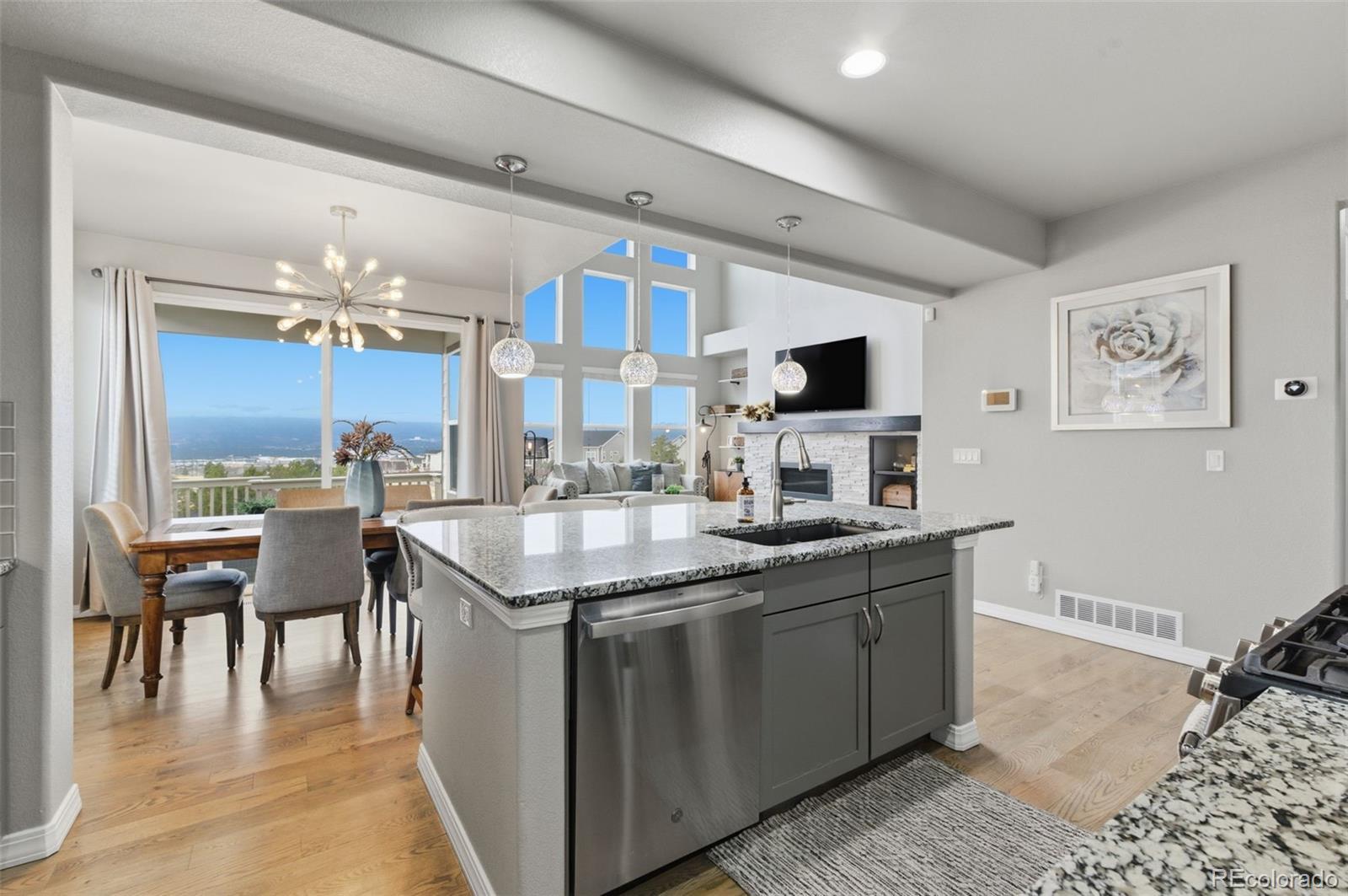 Enjoy unobstructed Pikes Peak and sweeping Front Range views from this beautifully upgraded home featuring a main-level primary suite and no rear neighbors. Designed with an open, light-filled floor plan, the home offers new carpet (2023), oak hardwood flooring on the main level, custom lighting, and a finished walk-out basement with 9-foot ceilings. The kitchen gray soft-close cabinetry with under-cabinet lighting, granite countertops, a large island, pantry, stainless steel appliances, and a 5-burner gas range—perfect for entertaining. The great room stuns with vaulted ceilings, two-story windows, and a modern stacked-stone fireplace. The adjacent dining area opens to a covered deck, ideal for sunsets. The main-floor primary suite features spectacular views, a spacious walk-in closet, and an upgraded bath with tiled floors and upgraded shower. Also on the main level: a private office with French doors and a convenient laundry room with included washer and dryer, plus a second upper-level laundry hookup. Upstairs offers three bedrooms, a full bath, a second laundry room, and an open loft overlooking the great room with incredible mountain views. The fully finished walk-out basement includes two additional bedrooms, a full bath, a large recreation room with surround sound, and walk-out access to a private patio. A generous storage room offers the potential for a seventh bedroom. Located in the desirable North Fork community in Academy School District 20, just a short walk to Encompass Heights Elementary STEM Academy and Pine Creek High School. Additional features include security cameras, a smart doorbell, a whole-home humidifier, washer/dryer, a refrigerator, a 65-inch TV in the family room, new roof 2022, an additional water hookup for a refrigerator in the utility room and pre-wiring for a hot tub.