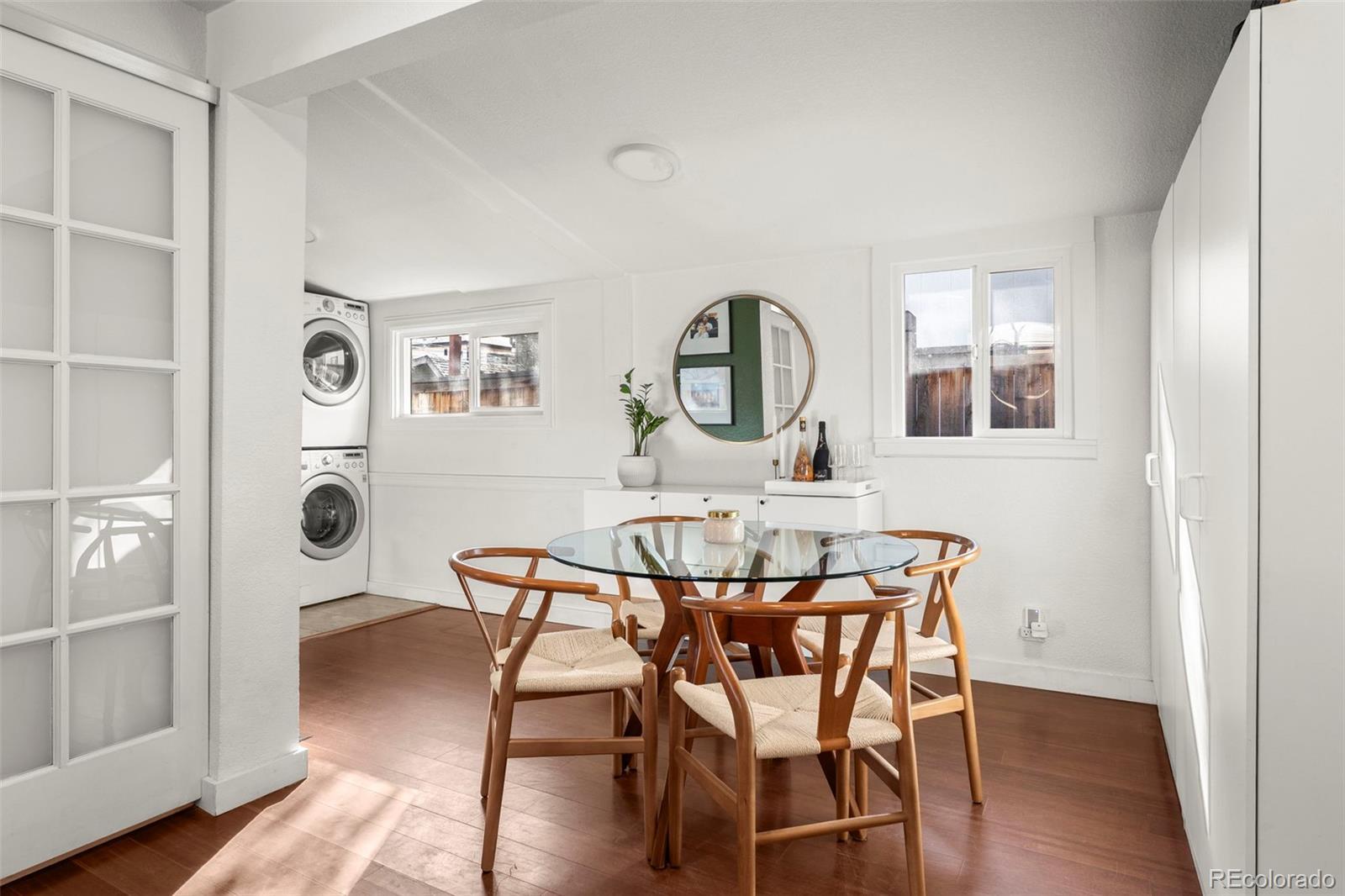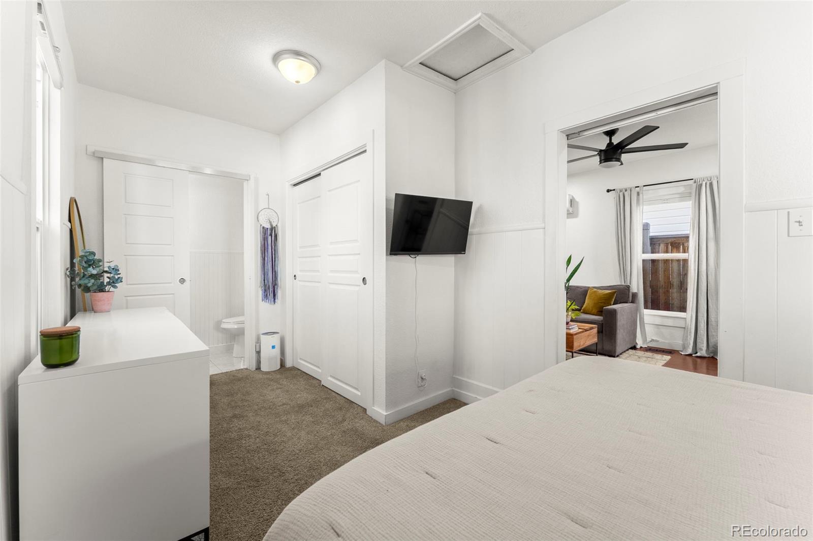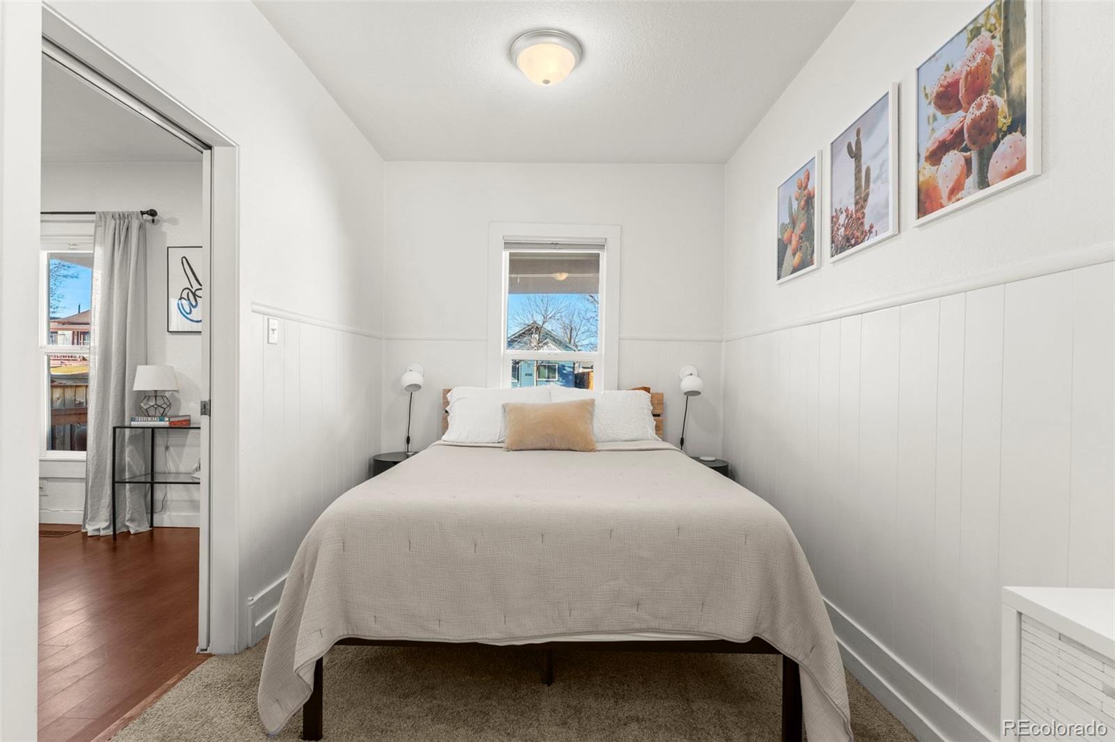Sleek turn-of-the-century home in Berkeley, one of Denver’s most sought-after neighborhoods. This highly desirable location offers easy access to I-70 for commuters, and exceptional walkability to parks and recreation. Just steps from Berkeley Park with a dog park, lake, trails, and recreation center, and only a few blocks from the shops and restaurants along the Tennyson Street corridor. The primary bedroom includes a private half bath. An oversized two-car garage, adds valuable storage, parking, and work bench area. The spacious kitchen features quartz countertops, a gas range, stainless steel appliances, ample cabinetry, and generous prep space, making it well suited for both everyday living and entertaining. Numerous windows throughout the main living areas provide excellent natural light from morning through late afternoon, enhancing the home’s classic character. Comfort is supported by a mini-split A/C system, and the interior has been refreshed with new paint, creating a clean, move-in-ready feel while preserving the original charm. Outdoor spaces are thoughtfully designed with raised garden beds for vegetables and perennials, a sandstone patio, paver walkway, new crushed granite, and shade trees. Covered front and rear patios overlook a private, fenced yard ideal for sunsets.