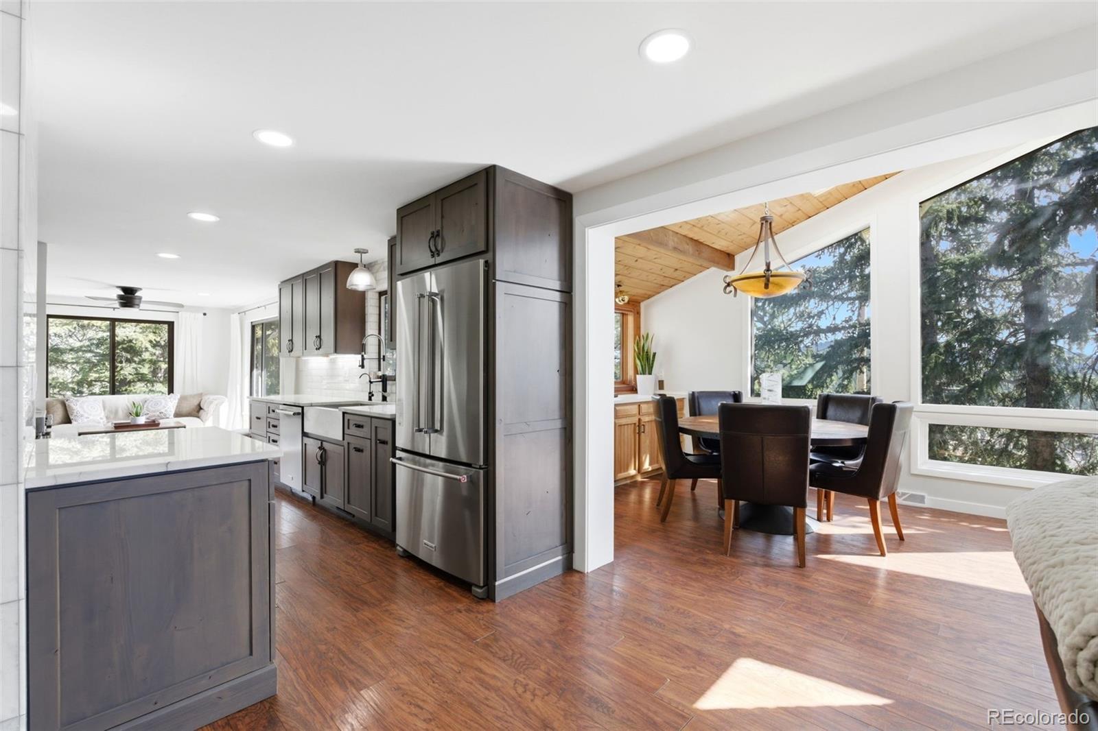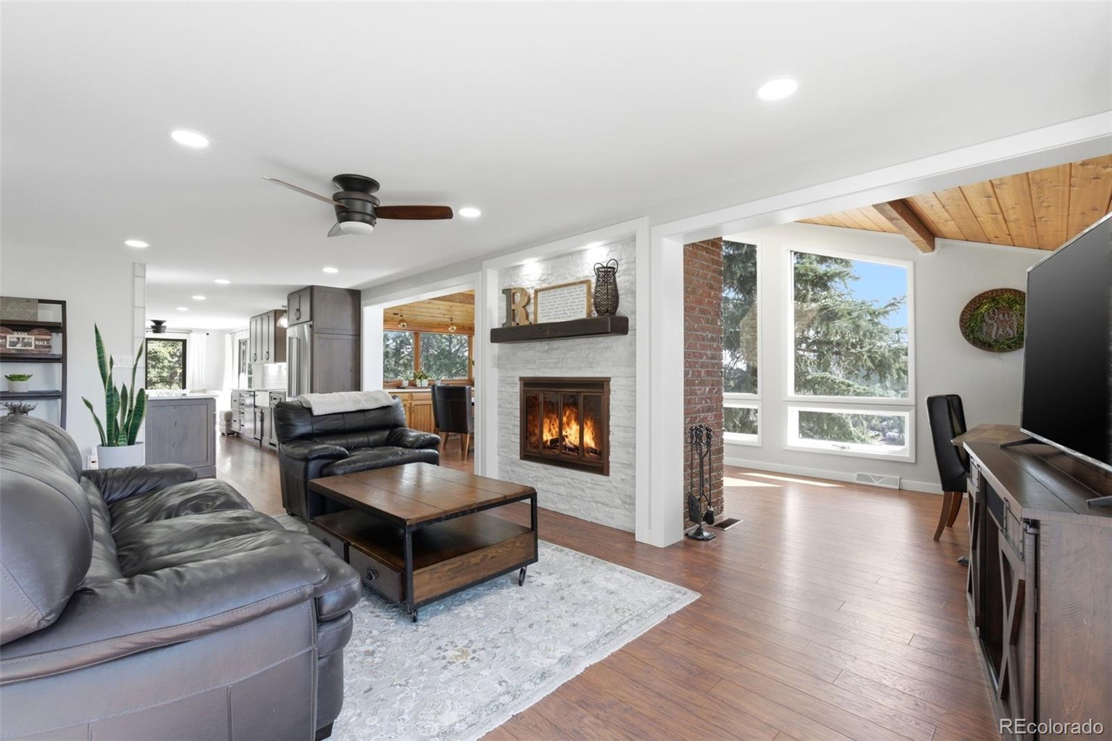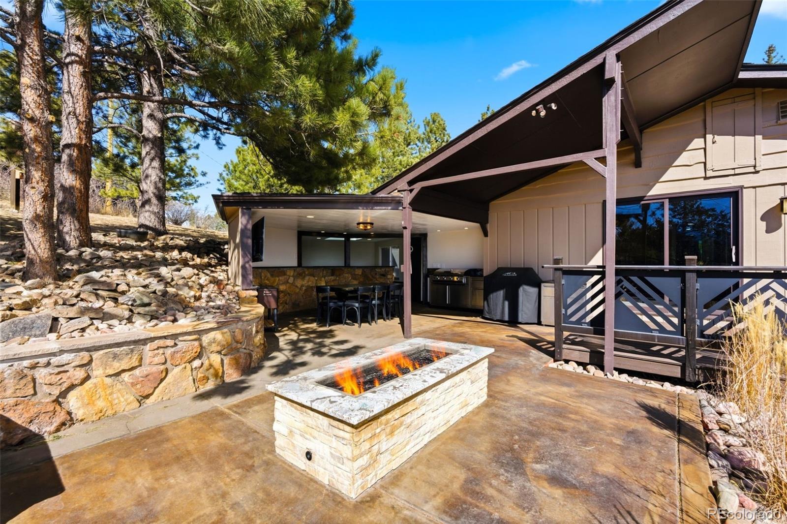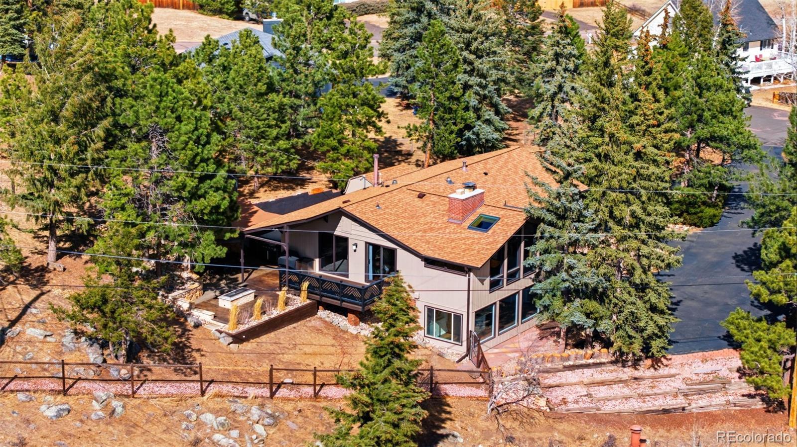 Experience refined mountain living in this beautifully updated walkout ranch that offers highly desirable main-level living. Bathed in natural light and framed by captivating views, this home blends timeless style with modern comfort. The main level offers 3 beds, 2 baths, multiple living and dining space options, wood-burning fireplace, and laundry closet. A rare and standout feature, the fully appointed basement “apartment” includes its own kitchen, living, dining, and separate laundry access - ideal for guests, multigenerational living, or income potential. There’s also a fully finished sunroom with wet bar. Outdoor living is nothing short of exceptional. Entertain beneath the large, covered patio complete with bar-top seating and dedicated dining space, gather around the stone natural gas fire pit, or relax on the TREX deck with custom-designed metal railing. Raised planter beds add functionality, creating a true haven designed for year-round enjoyment. Newer roof, gutters, and exterior paint, plus the bonus of central AC and public water/sewer. Perfectly positioned close to all that Evergreen has to offer - dining, shopping, trails, and recreation. Positioned on a quiet cul-de-sac, this home provides both privacy and convenience that’s sure to impress.