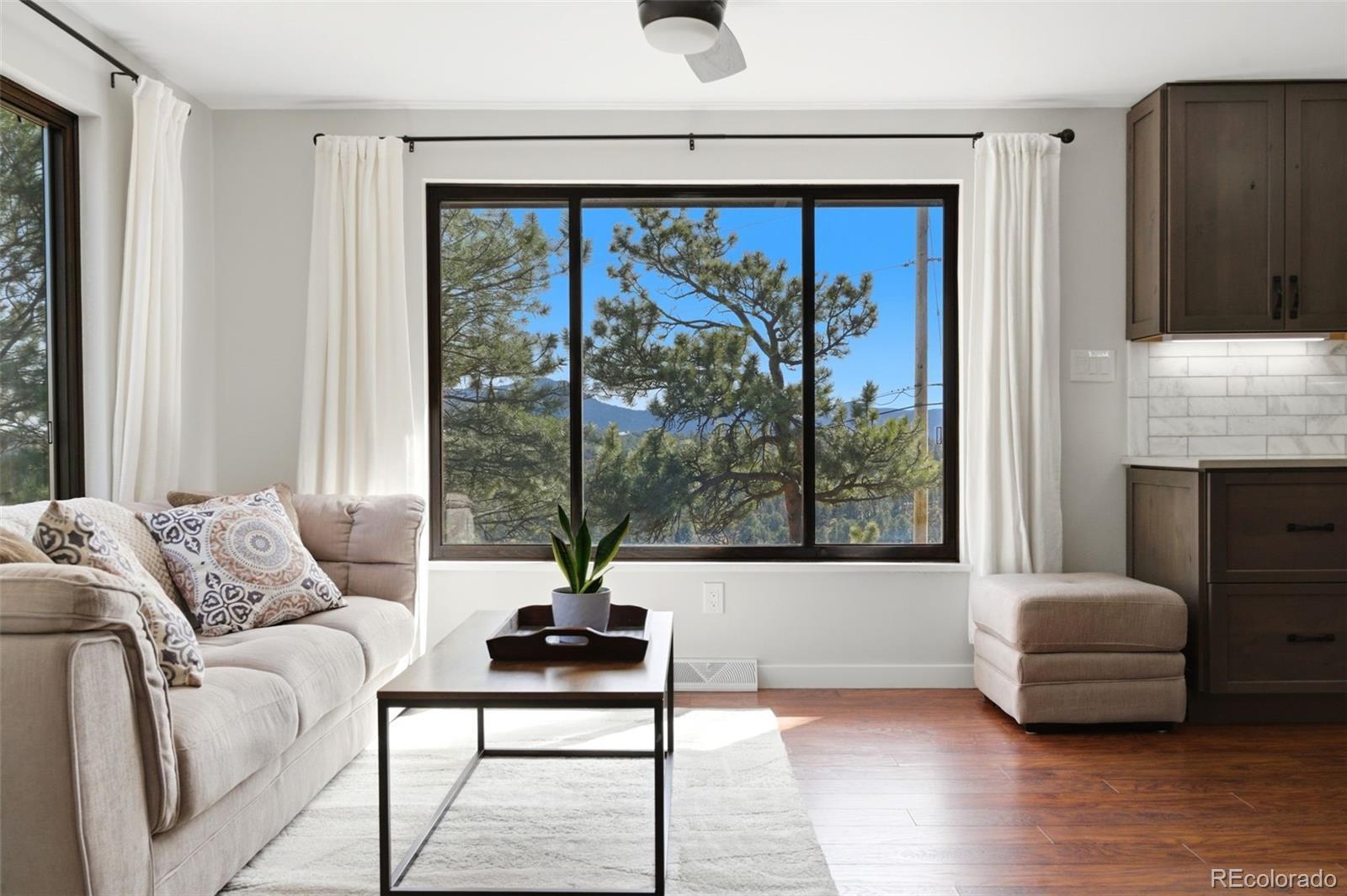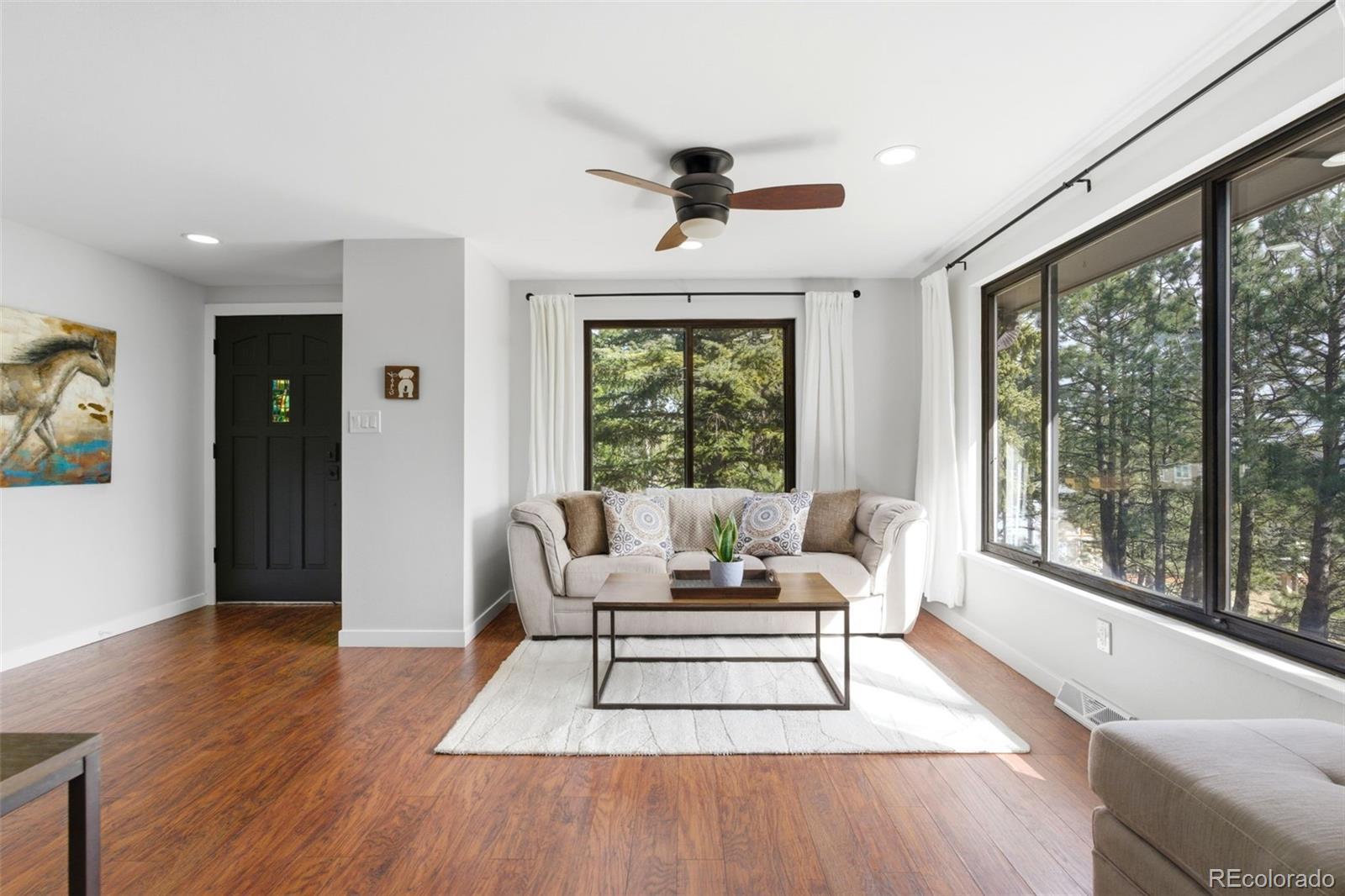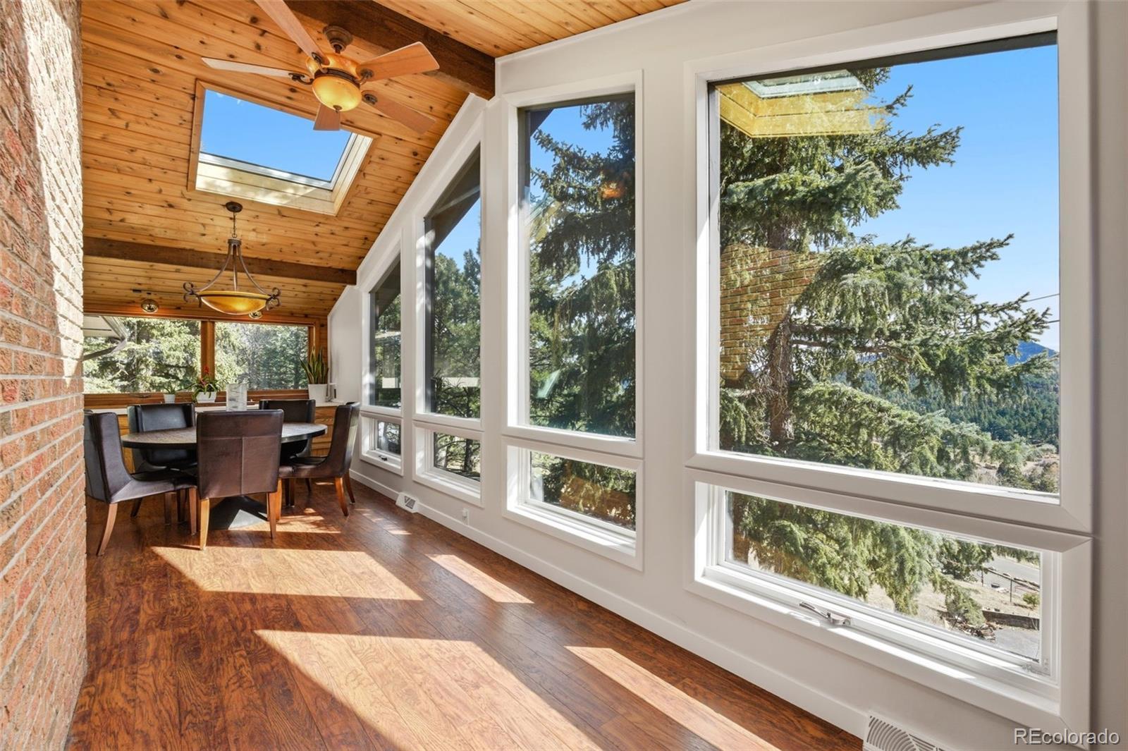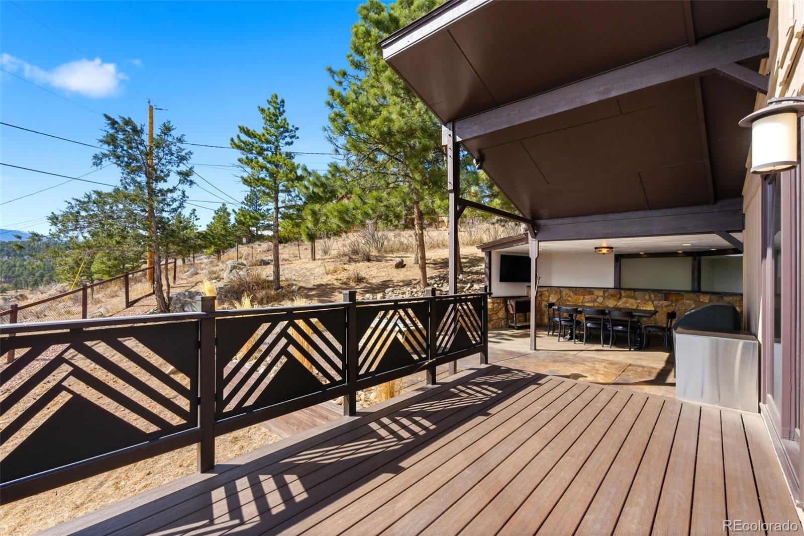 Experience refined mountain living in this beautifully updated walkout ranch that offers highly desirable main-level living. Bathed in natural light and framed by captivating views, this home blends timeless style with modern comfort. The main level offers 3 beds, 2 baths, multiple living and dining space options, wood-burning fireplace, and laundry closet. A rare and standout feature, the fully appointed basement “apartment” includes its own kitchen, living, dining, and separate laundry access - ideal for guests, multigenerational living, or income potential. There’s also a fully finished sunroom with wet bar. Outdoor living is nothing short of exceptional. Entertain beneath the large, covered patio complete with bar-top seating and dedicated dining space, gather around the stone natural gas fire pit, or relax on the TREX deck with custom-designed metal railing. Raised planter beds add functionality, creating a true haven designed for year-round enjoyment. Newer roof, gutters, and exterior paint, plus the bonus of central AC and public water/sewer. Perfectly positioned close to all that Evergreen has to offer - dining, shopping, trails, and recreation. Positioned on a quiet cul-de-sac, this home provides both privacy and convenience that’s sure to impress.