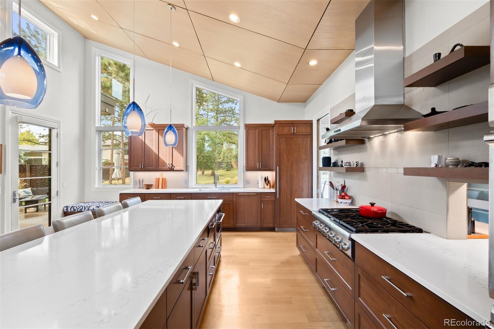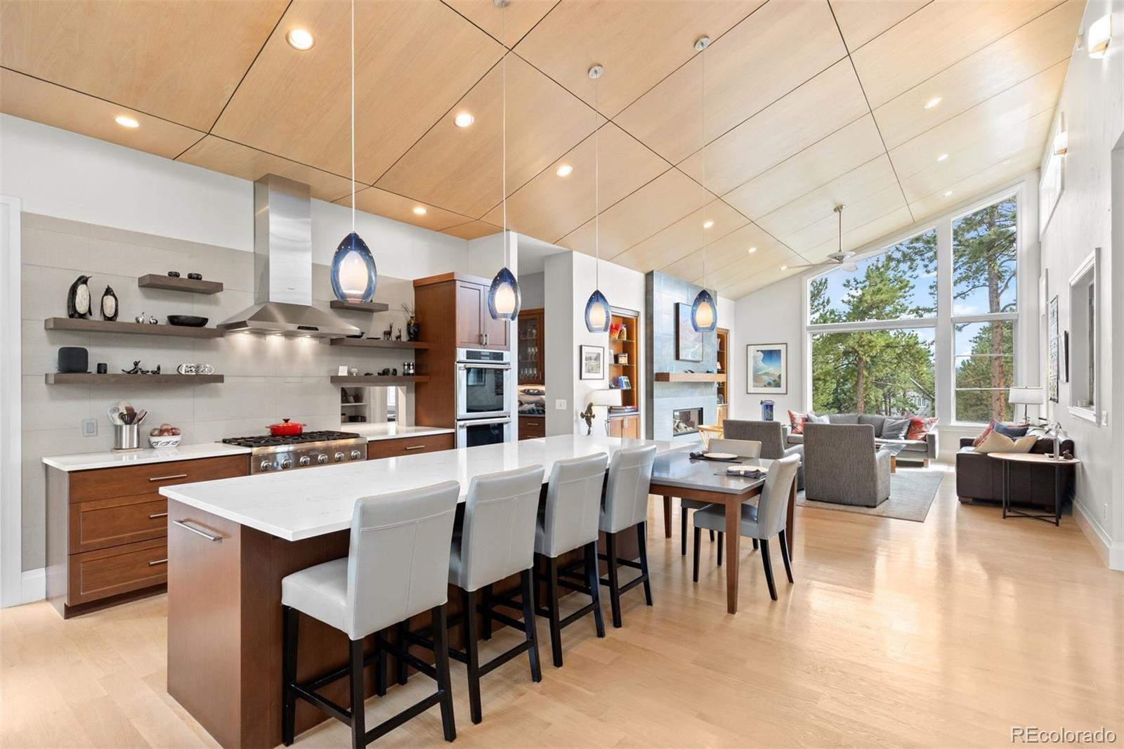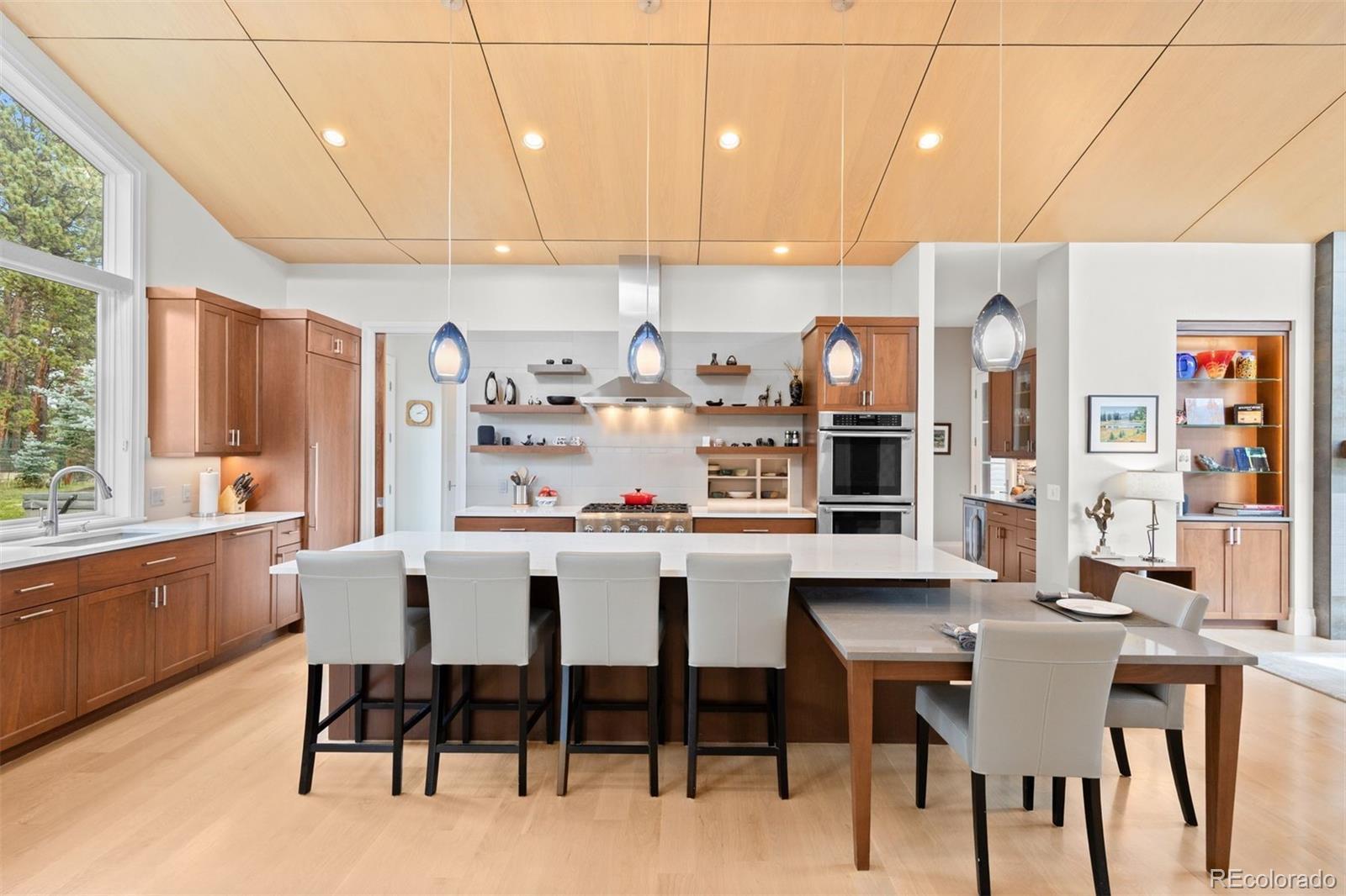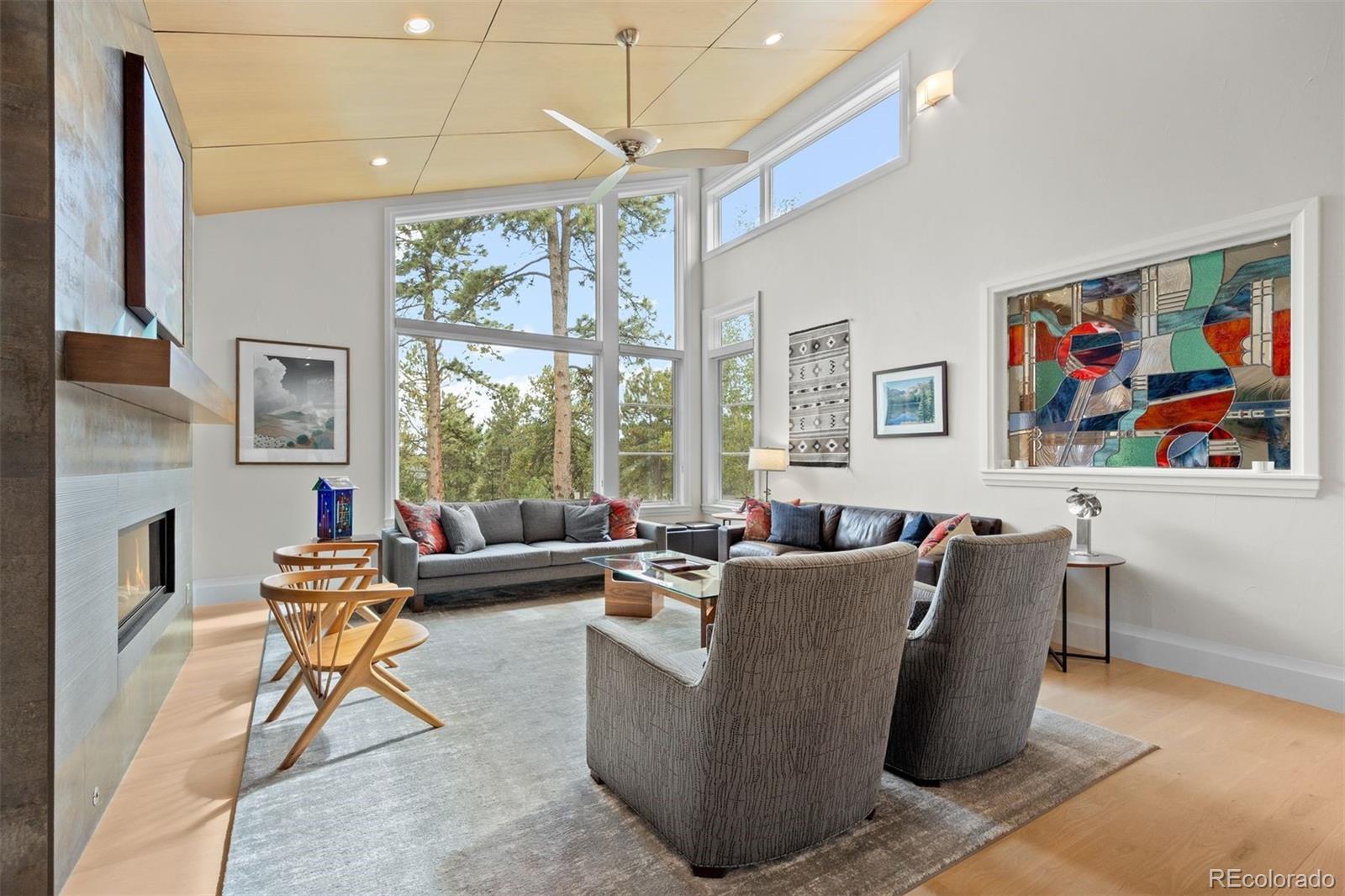 Architectural harmony in Evergreen's coveted Hiwan community. Set along one of Evergreen’s most peaceful streets, 29574 Canterbury Circle captures the essence of contemporary mountain living, where clean lines, natural textures, and expansive glass meet the quiet majesty of the Rockies. The exterior’s stone and stucco façade anchors the home within its landscape, while precise rooflines, broad windows, and meticulous hardscaping express architectural confidence without excess. Inside, volume, light, and craftsmanship define the experience. The vaulted great room rises beneath a white-oak-paneled ceiling, balancing modern geometry with organic warmth. Throughout, custom walnut doors and cabinetry contrast beautifully against quartz countertops and white-oak flooring, creating a calm, continuous palette that highlights the southern exposure and panoramic mountain views. An open floor plan invites movement between the chef’s kitchen, two-level entertaining island, wine and coffee bar, and spacious living areas. The kitchen pairs sculptural beauty with professional functionality, featuring Thermador appliances, separate 30-inch refrigerator and freezer units, and a large working pantry—a discreet complement to the home’s main culinary stage. The finished walkout lower level adds exceptional livability, offering three bedrooms, three bathrooms, a bar and lounge area, secondary laundry, and multiple spaces for recreation or guests. The covered rear patio is a peaceful all-season haven, complemented by a private hot-tub terrace tucked beneath mature trees. More than a residence, 29574 Canterbury Circle is a statement of balance—where architectural precision meets mountain tranquility. A true modern mountain masterpiece designed for those who value design integrity, quiet luxury, and the enduring beauty of Colorado.
