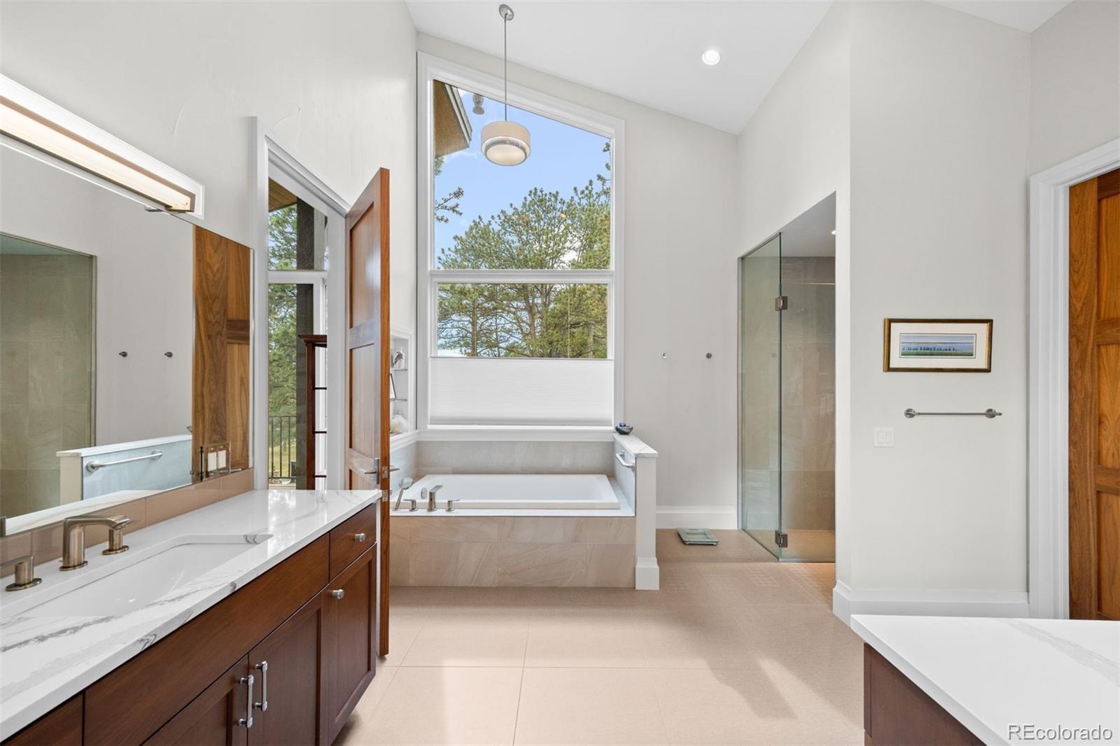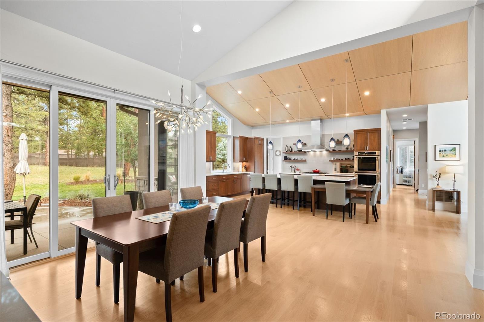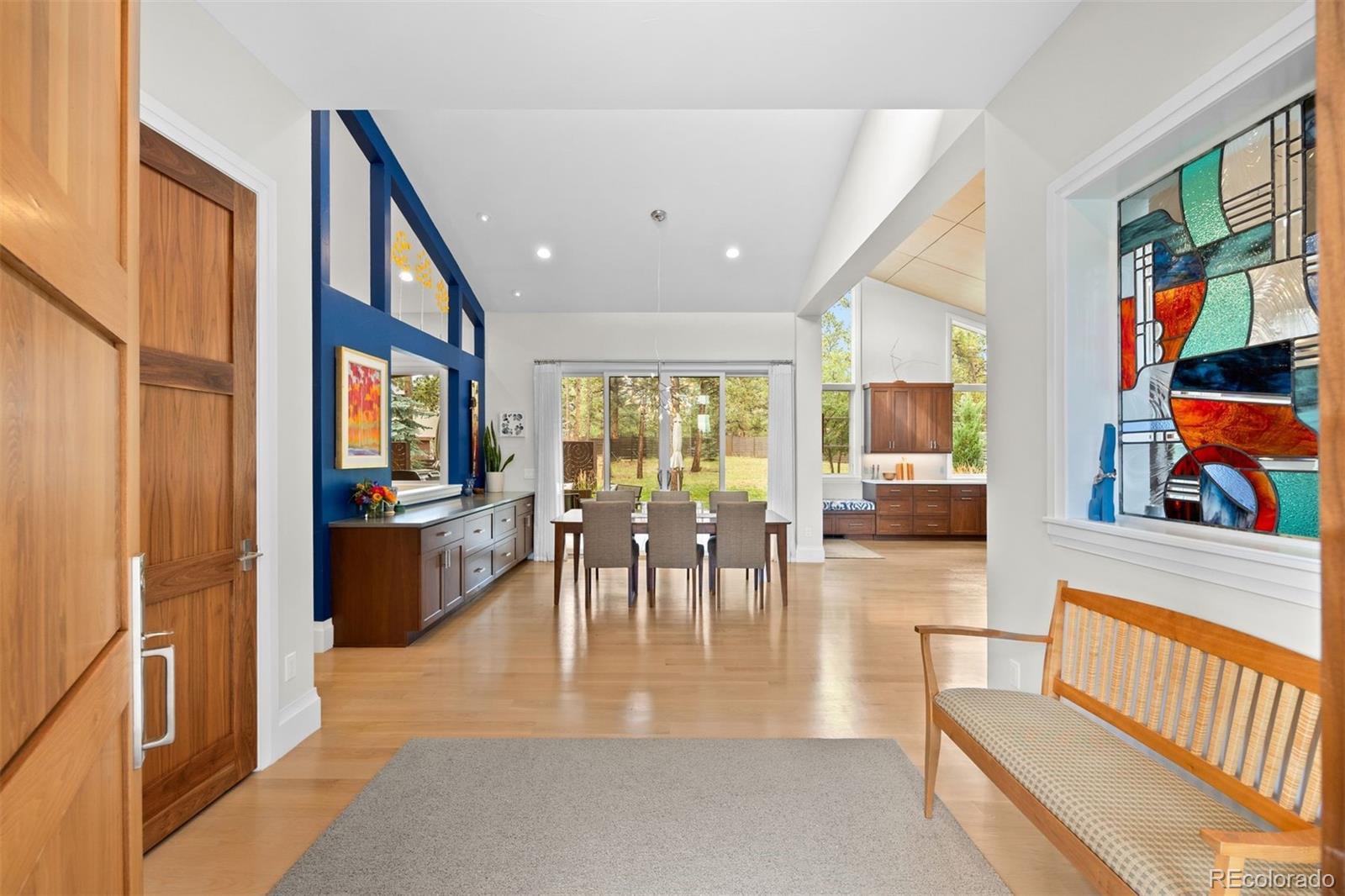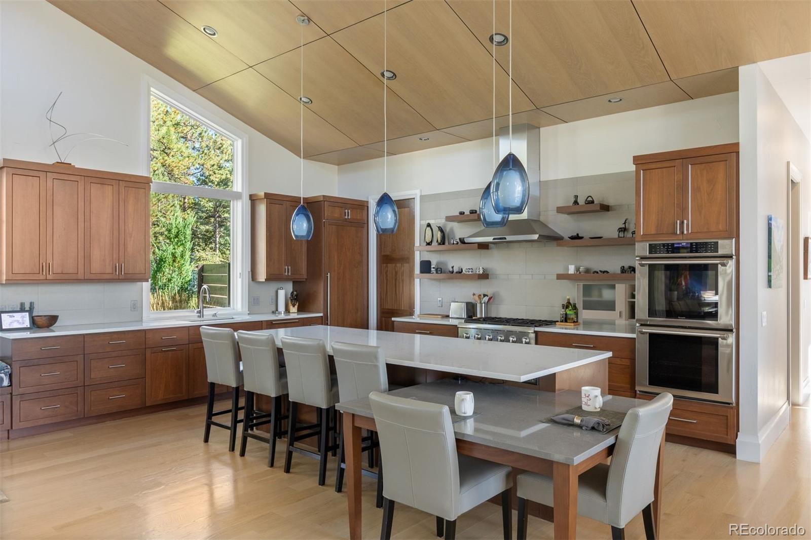 Architectural harmony in Evergreen's coveted Hiwan community. Set along one of Evergreen’s most peaceful streets, 29574 Canterbury Circle captures the essence of contemporary mountain living, where clean lines, natural textures, and expansive glass meet the quiet majesty of the Rockies. The exterior’s stone and stucco façade anchors the home within its landscape, while precise rooflines, broad windows, and meticulous hardscaping express architectural confidence without excess. Inside, volume, light, and craftsmanship define the experience. The vaulted great room rises beneath a white-oak-paneled ceiling, balancing modern geometry with organic warmth. Throughout, custom walnut doors and cabinetry contrast beautifully against quartz countertops and white-oak flooring, creating a calm, continuous palette that highlights the southern exposure and panoramic mountain views. An open floor plan invites movement between the chef’s kitchen, two-level entertaining island, wine and coffee bar, and spacious living areas. The kitchen pairs sculptural beauty with professional functionality, featuring Thermador appliances, separate 30-inch refrigerator and freezer units, and a large working pantry—a discreet complement to the home’s main culinary stage. The finished walkout lower level adds exceptional livability, offering three bedrooms, three bathrooms, a bar and lounge area, secondary laundry, and multiple spaces for recreation or guests. The covered rear patio is a peaceful all-season haven, complemented by a private hot-tub terrace tucked beneath mature trees. More than a residence, 29574 Canterbury Circle is a statement of balance—where architectural precision meets mountain tranquility. A true modern mountain masterpiece designed for those who value design integrity, quiet luxury, and the enduring beauty of Colorado.