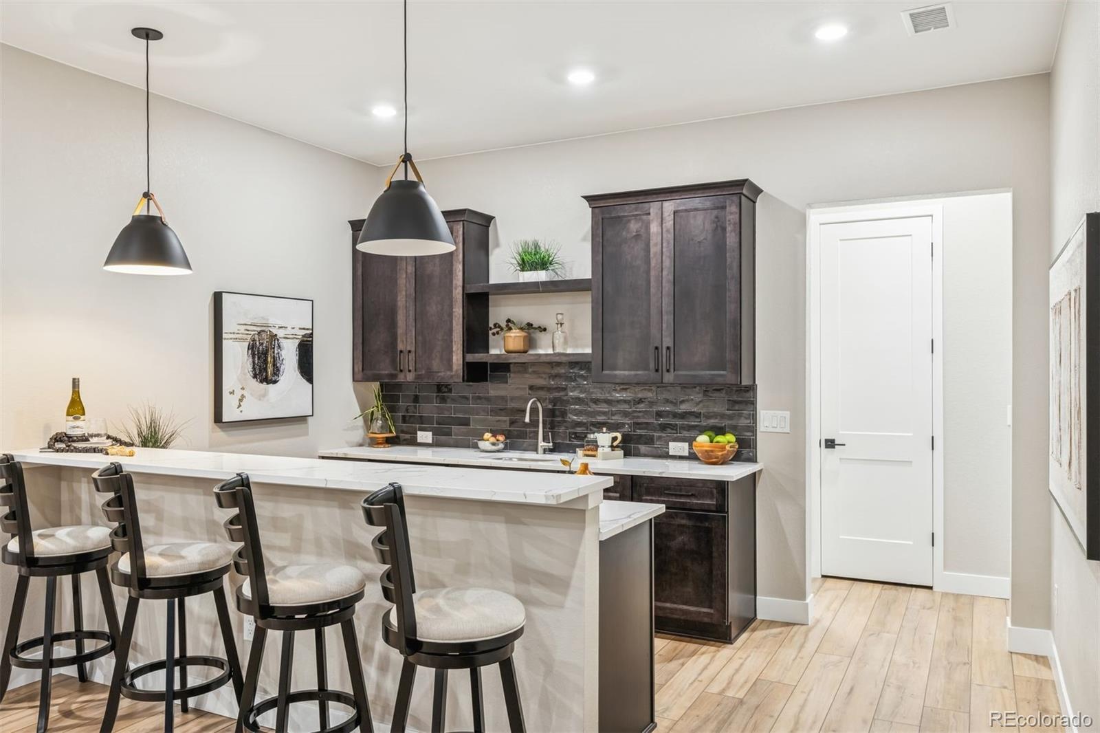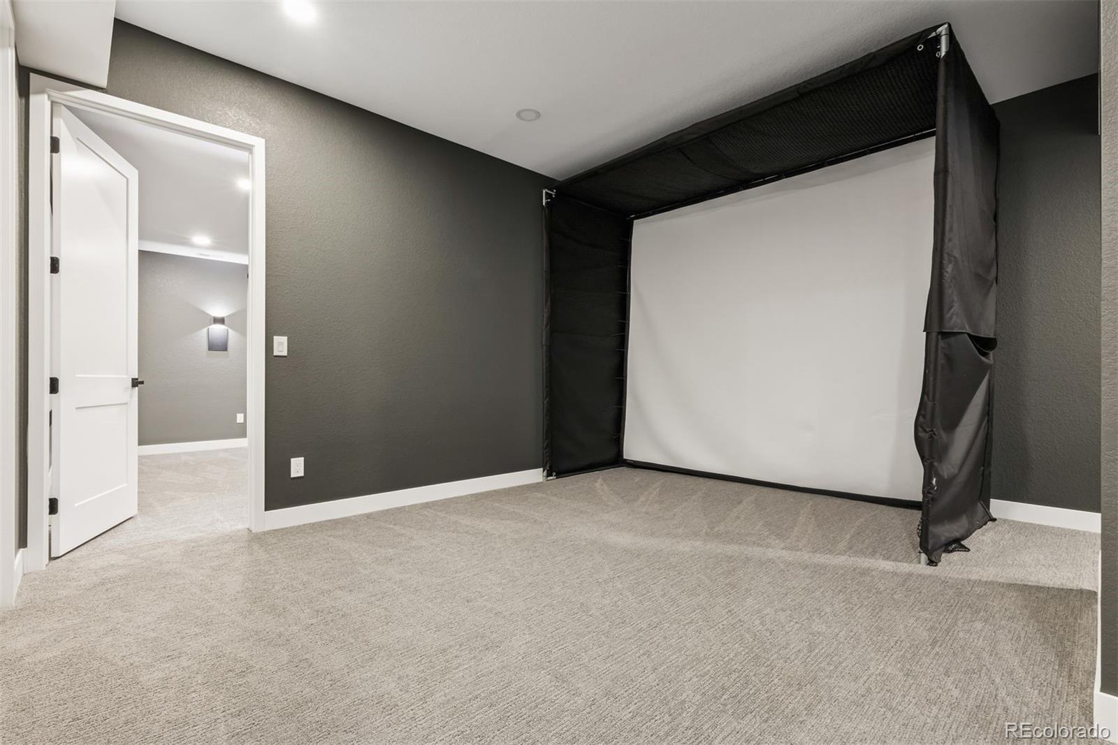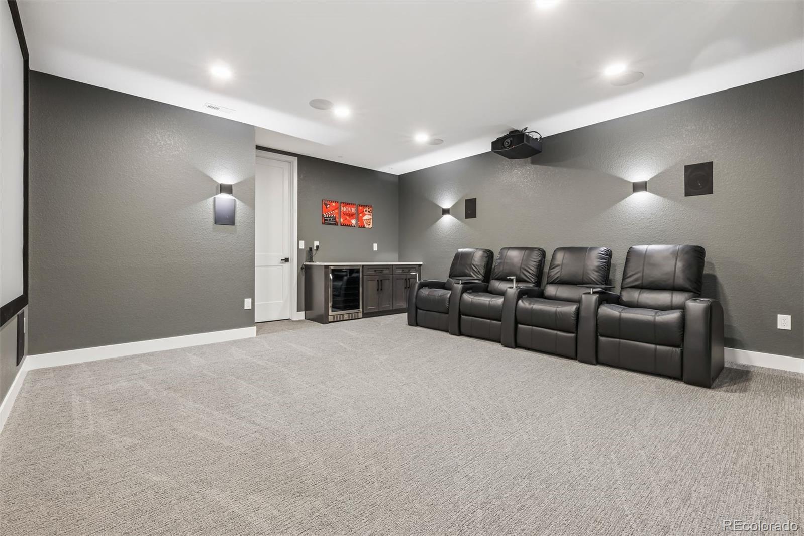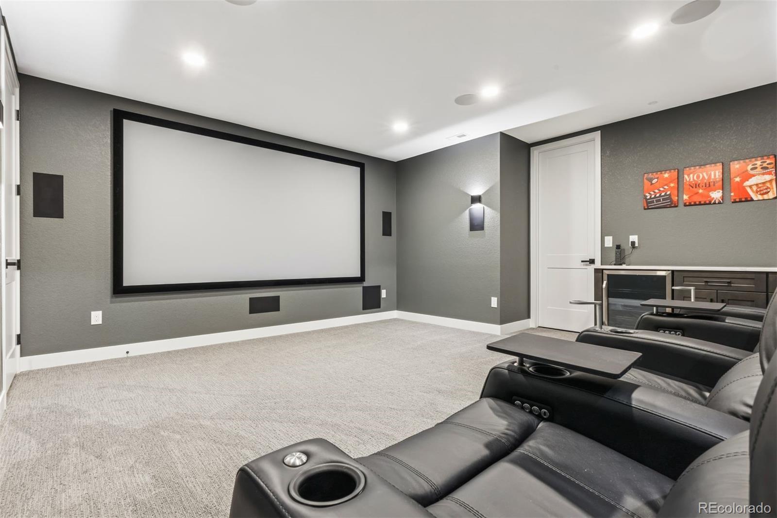 INCREDIBLE NEW PRICE! This exceptional property in the highly desirable Solstice community is truly better than new—featuring over $450,000 in upgrades, including $50,000 in professional landscaping, fencing, lighting and two-tier upscale tile outdoor entertainment areas. Recent additions include an extended basement finish with golf simulator room, bonus room and theater; new custom gym doors, garage epoxy flooring and whole house humidifier. The main level showcases luxury vinyl plank flooring, plantation shutters, upgraded light fixtures, and integrated smart home features. The open floor plan includes a gourmet kitchen with a Bosch refrigerator, Jenn-aire microwave, dishwasher, gas range, double ovens, quartz countertops, under-cabinet lighting, a large center island and a spacious walk-in pantry. The kitchen flows seamlessly into a bright and inviting Great Room centered around a gas fireplace with floor-to-ceiling stonework and built-in in-ceiling speakers. Large 3-panel sliding glass doors open to a beautifully designed backyard, where motorized Hunter Douglas shades allow for comfortable indoor-outdoor living. An elegant primary suite offers a spa-style bathroom with high-end finishes, custom tilework, and a professionally designed walk-in closet. Two additional en-suite bedrooms provide comfort for family or guests, while a private home office offers the perfect space for remote work. A finished basement takes this home to the next level with a spacious rec room, wet bar complete with a beverage cooler and dishwasher, a glass-enclosed workout room, golf simulator room, craft room, guest suite and home theater with components and theater seating included. Solstice residents enjoy premium amenities, including clubhouse, resort-style pool and Chatfield Lake and State Park, trails, parks and scenic open spaces. High end RH, Pottery Barn, Crate and Barrel and Love Sac furniture included. See supplements for full list. Staging furniture excluded. STUNNING!