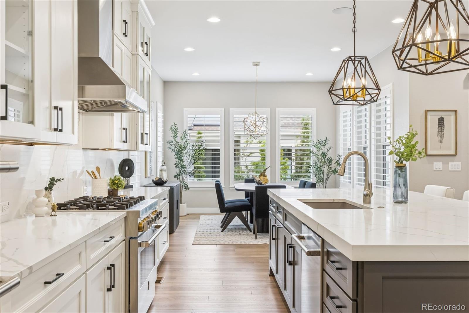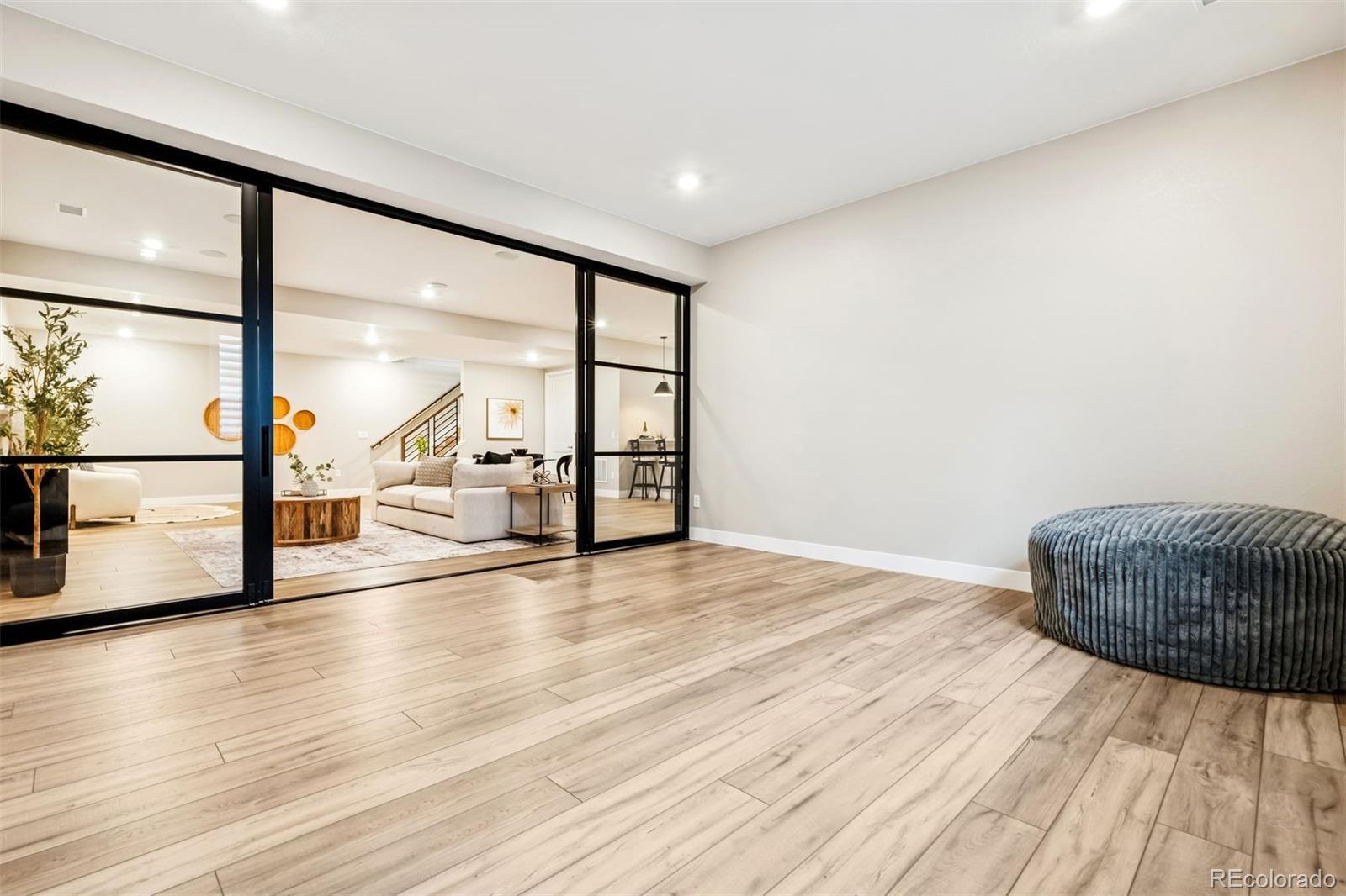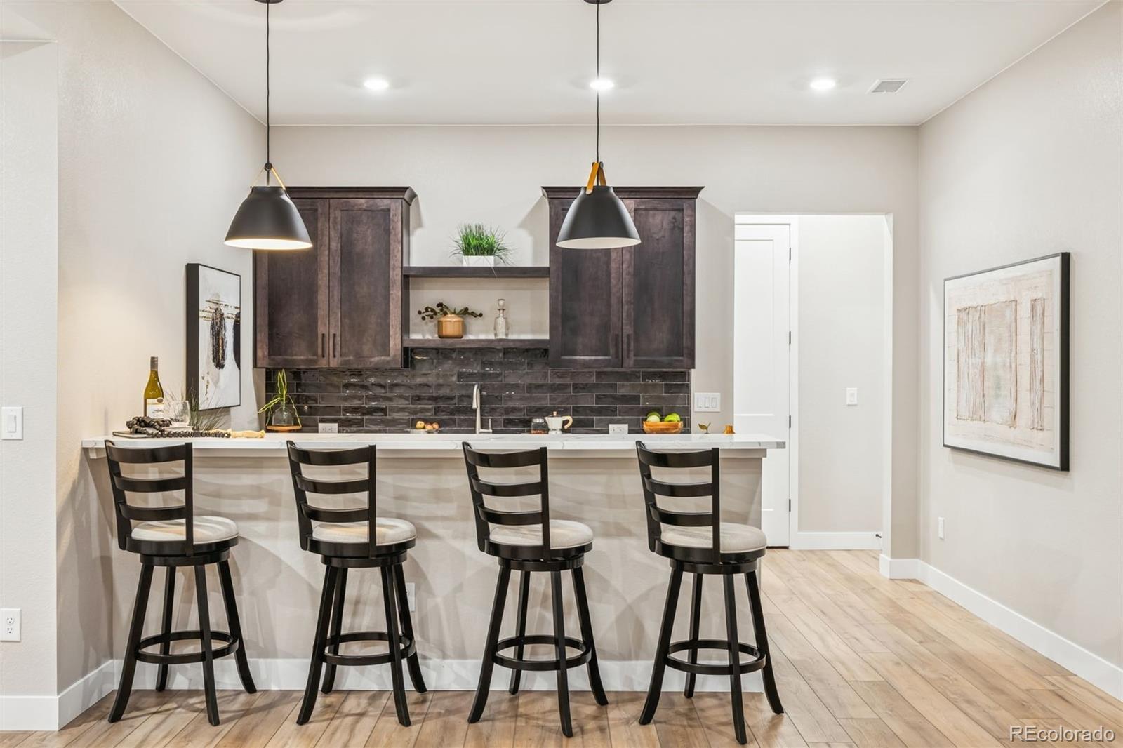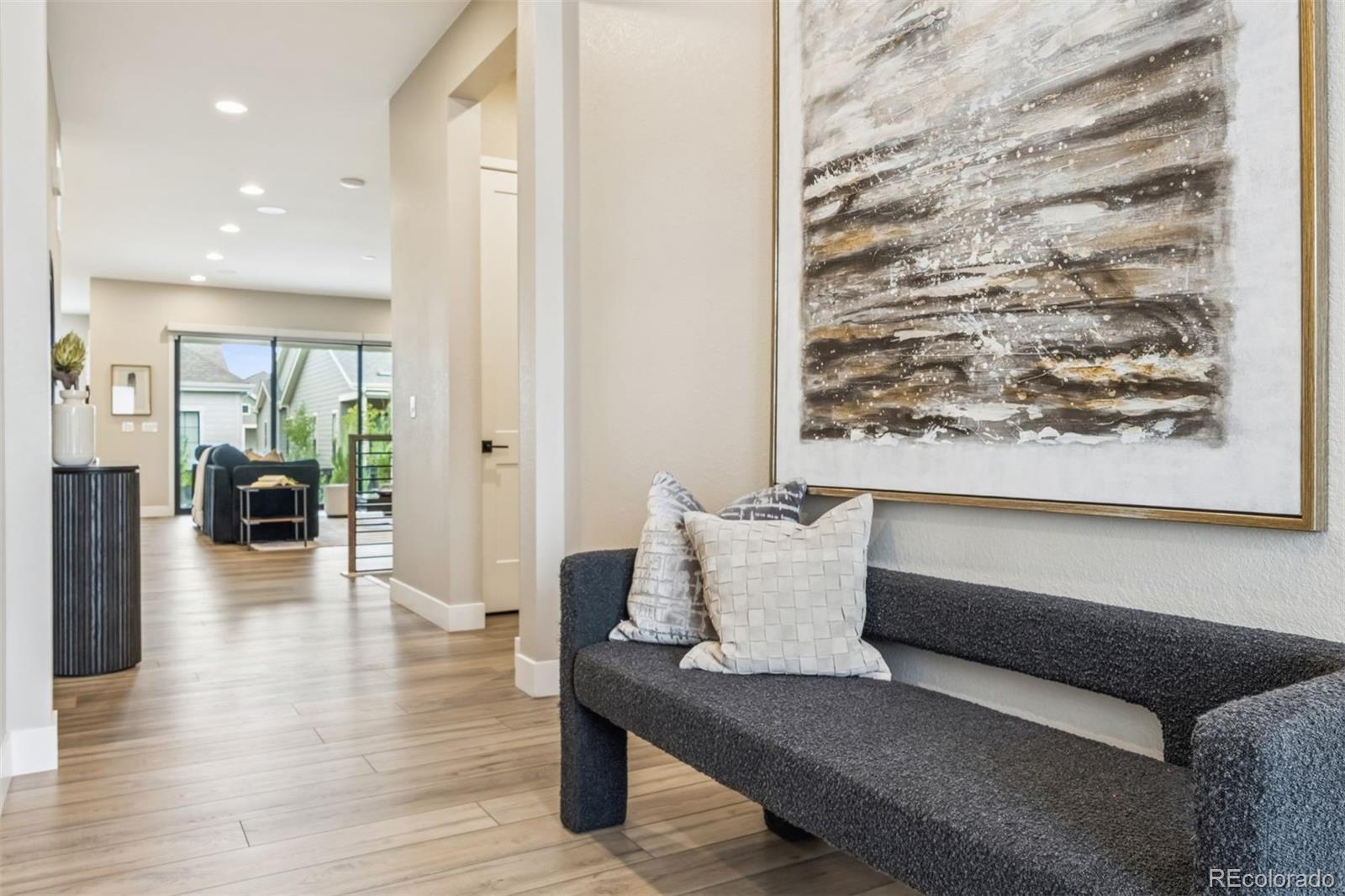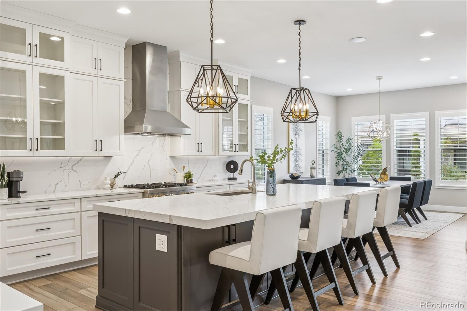 INCREDIBLE NEW PRICE! This exceptional property in the highly desirable Solstice community is truly better than new—featuring over $450,000 in upgrades, including $50,000 in professional landscaping, fencing, lighting and two-tier upscale tile outdoor entertainment areas. Recent additions include an extended basement finish with golf simulator room, bonus room and theater; new custom gym doors, garage epoxy flooring and whole house humidifier. The main level showcases luxury vinyl plank flooring, plantation shutters, upgraded light fixtures, and integrated smart home features. The open floor plan includes a gourmet kitchen with a Bosch refrigerator, Jenn-aire microwave, dishwasher, gas range, double ovens, quartz countertops, under-cabinet lighting, a large center island and a spacious walk-in pantry. The kitchen flows seamlessly into a bright and inviting Great Room centered around a gas fireplace with floor-to-ceiling stonework and built-in in-ceiling speakers. Large 3-panel sliding glass doors open to a beautifully designed backyard, where motorized Hunter Douglas shades allow for comfortable indoor-outdoor living. An elegant primary suite offers a spa-style bathroom with high-end finishes, custom tilework, and a professionally designed walk-in closet. Two additional en-suite bedrooms provide comfort for family or guests, while a private home office offers the perfect space for remote work. A finished basement takes this home to the next level with a spacious rec room, wet bar complete with a beverage cooler and dishwasher, a glass-enclosed workout room, golf simulator room, craft room, guest suite and home theater with components and theater seating included. Solstice residents enjoy premium amenities, including clubhouse, resort-style pool and Chatfield Lake and State Park, trails, parks and scenic open spaces. High end RH, Pottery Barn, Crate and Barrel and Love Sac furniture included. See supplements for full list. Staging furniture excluded. STUNNING!