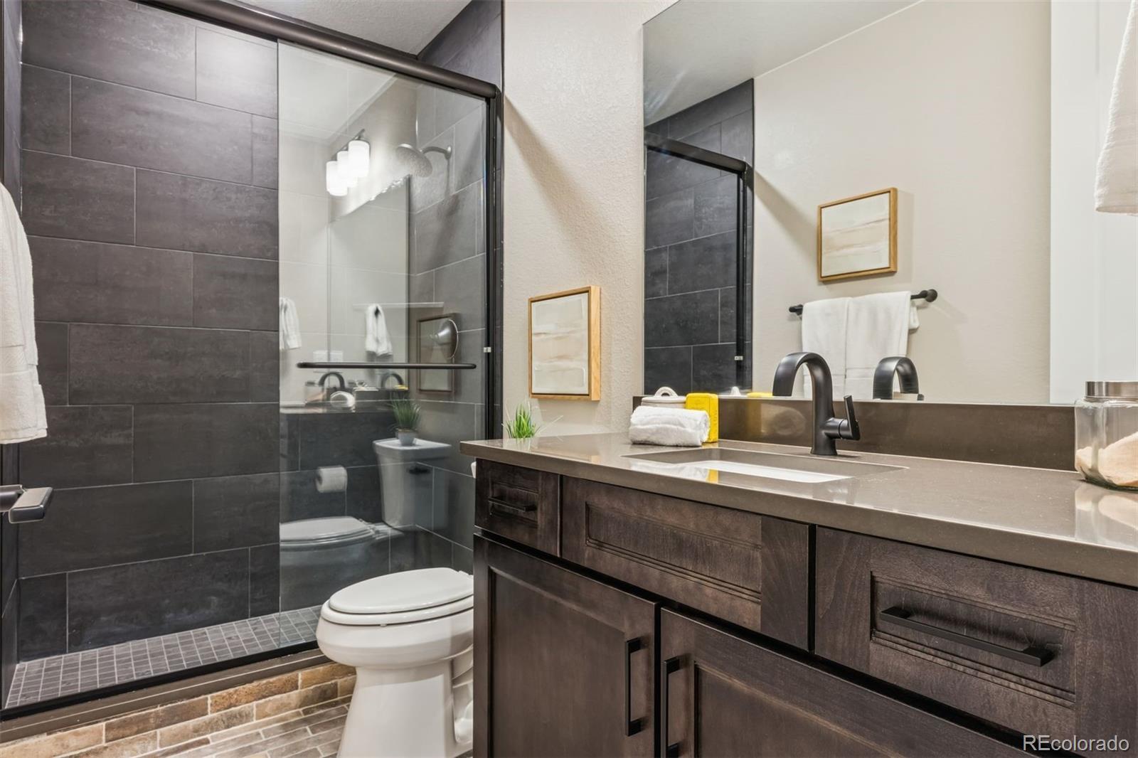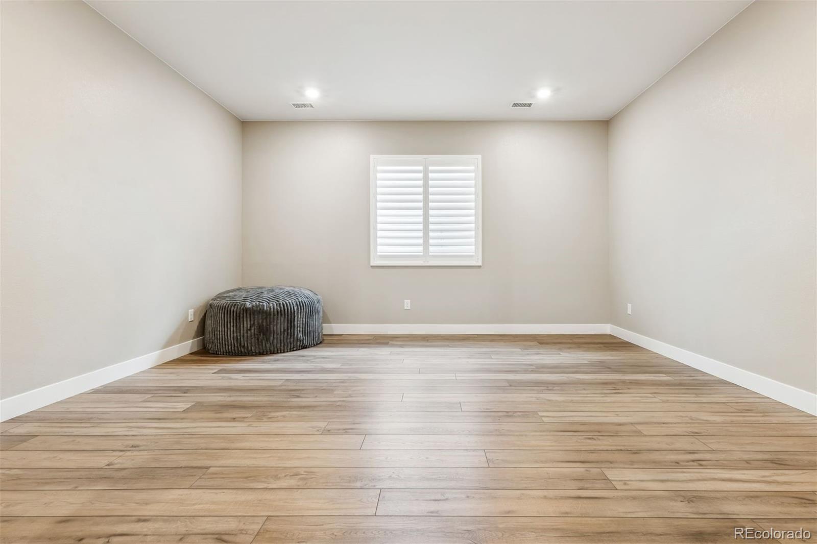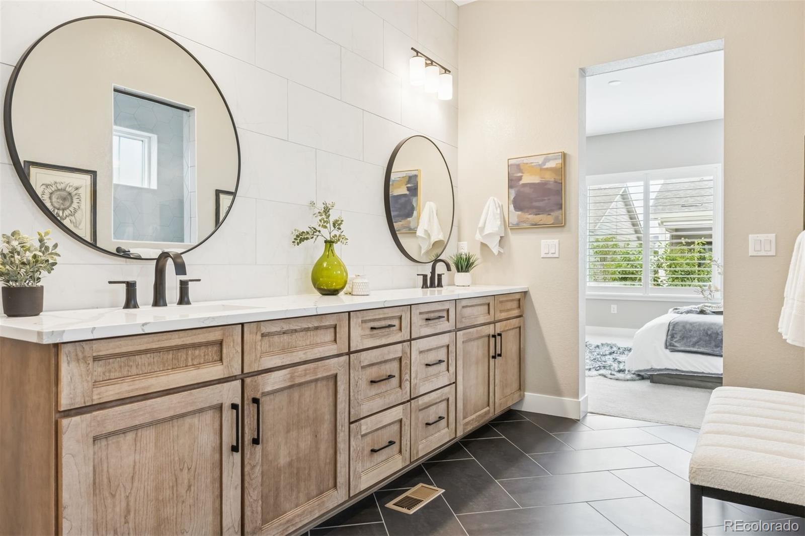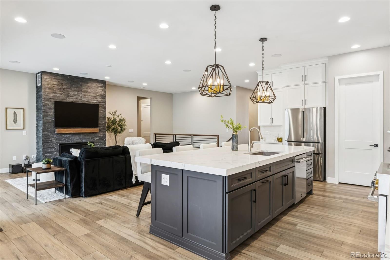 INCREDIBLE NEW PRICE! This exceptional property in the highly desirable Solstice community is truly better than new—featuring over $450,000 in upgrades, including $50,000 in professional landscaping, fencing, lighting and two-tier upscale tile outdoor entertainment areas. Recent additions include an extended basement finish with golf simulator room, bonus room and theater; new custom gym doors, garage epoxy flooring and whole house humidifier. The main level showcases luxury vinyl plank flooring, plantation shutters, upgraded light fixtures, and integrated smart home features. The open floor plan includes a gourmet kitchen with a Bosch refrigerator, Jenn-aire microwave, dishwasher, gas range, double ovens, quartz countertops, under-cabinet lighting, a large center island and a spacious walk-in pantry. The kitchen flows seamlessly into a bright and inviting Great Room centered around a gas fireplace with floor-to-ceiling stonework and built-in in-ceiling speakers. Large 3-panel sliding glass doors open to a beautifully designed backyard, where motorized Hunter Douglas shades allow for comfortable indoor-outdoor living. An elegant primary suite offers a spa-style bathroom with high-end finishes, custom tilework, and a professionally designed walk-in closet. Two additional en-suite bedrooms provide comfort for family or guests, while a private home office offers the perfect space for remote work. A finished basement takes this home to the next level with a spacious rec room, wet bar complete with a beverage cooler and dishwasher, a glass-enclosed workout room, golf simulator room, craft room, guest suite and home theater with components and theater seating included. Solstice residents enjoy premium amenities, including clubhouse, resort-style pool and Chatfield Lake and State Park, trails, parks and scenic open spaces. High end RH, Pottery Barn, Crate and Barrel and Love Sac furniture included. See supplements for full list. Staging furniture excluded. STUNNING!