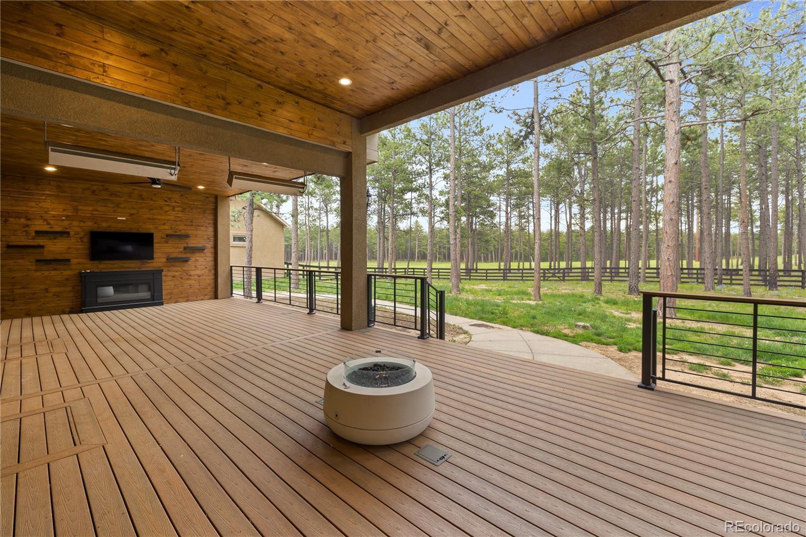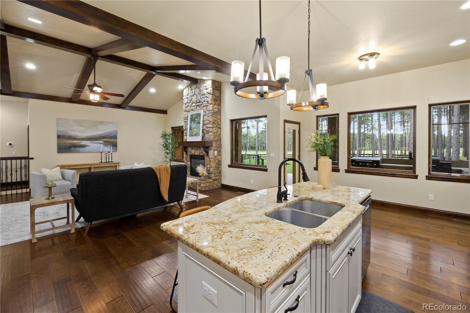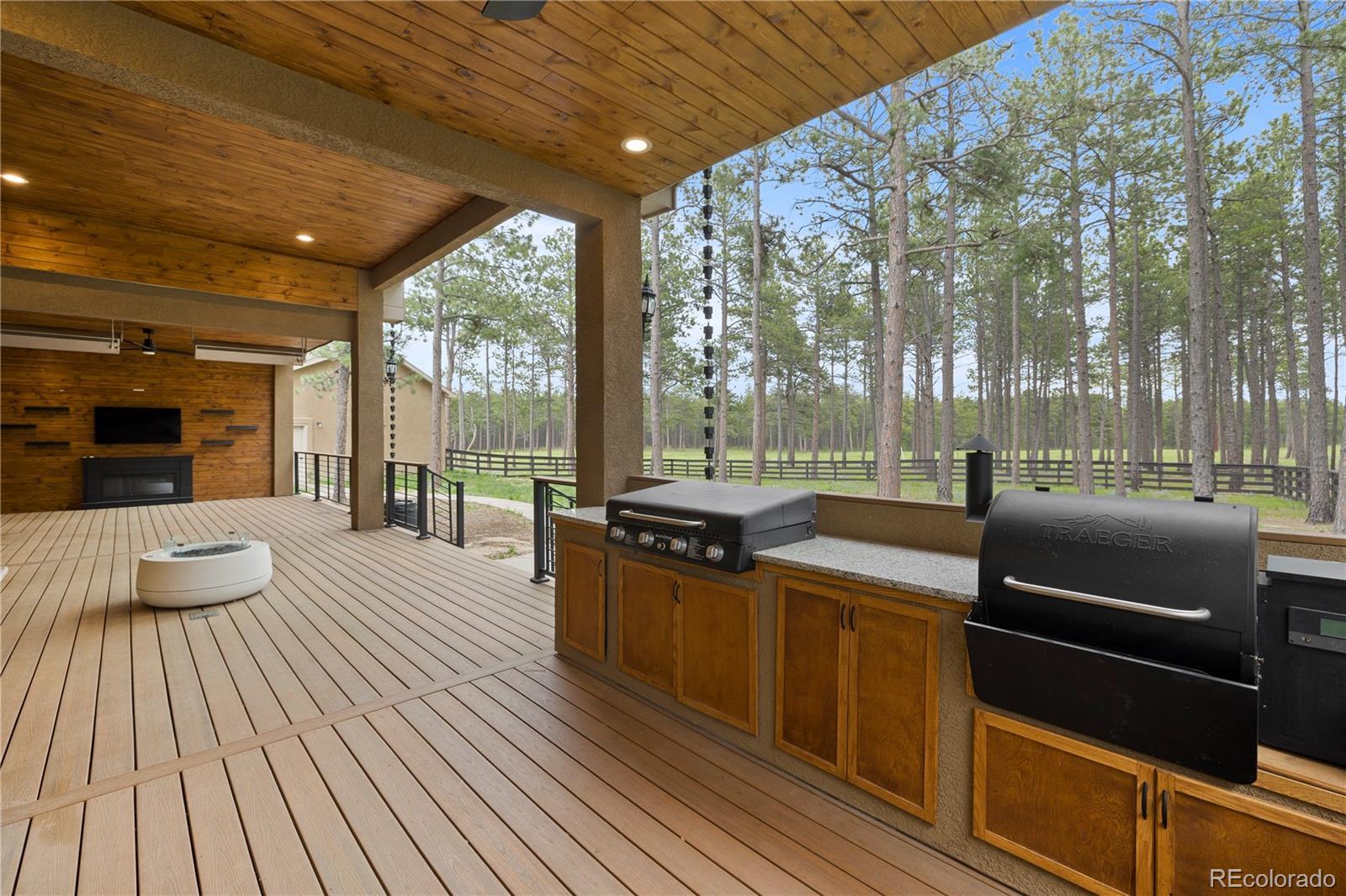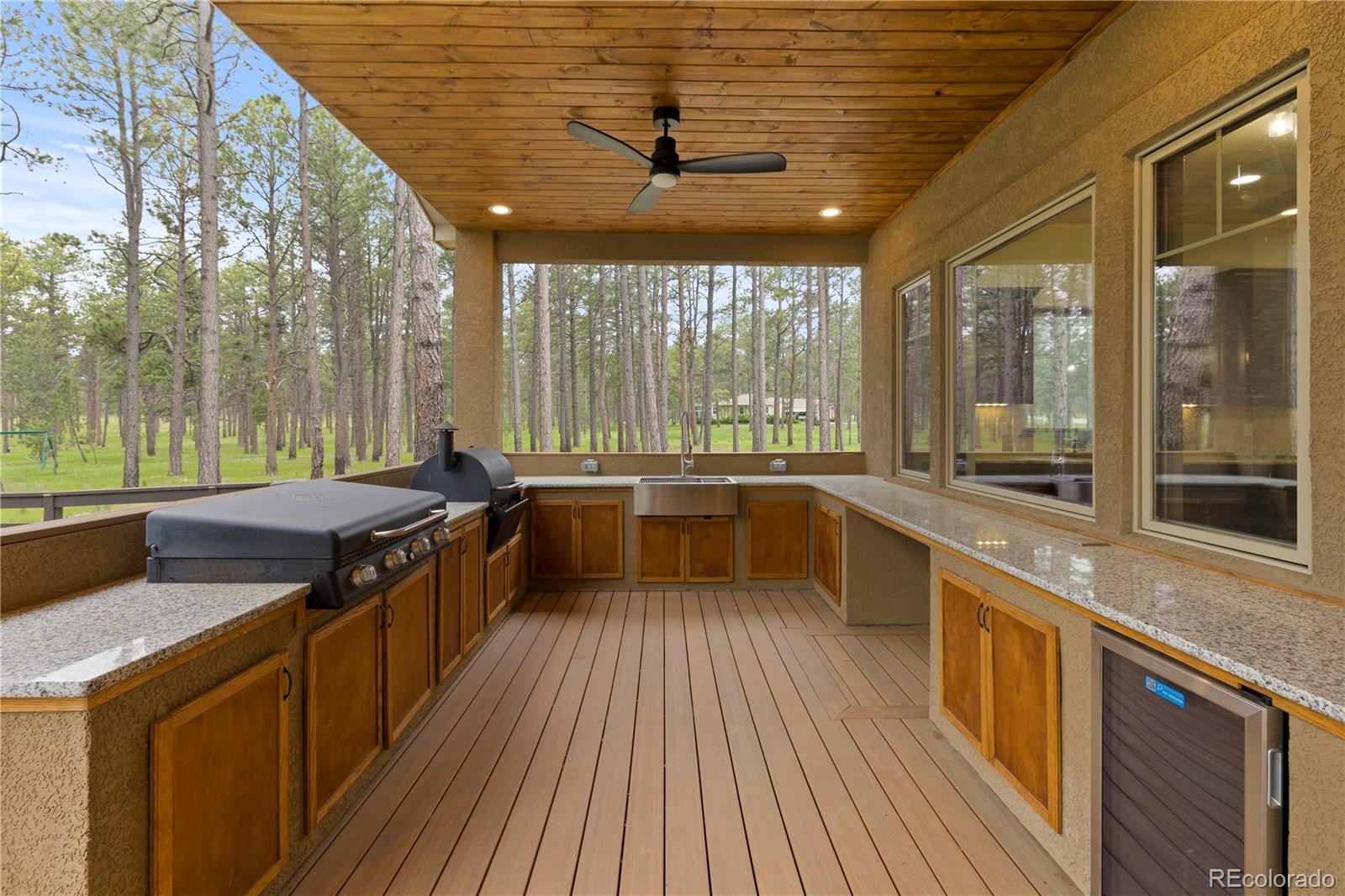 Privately situated on 2.75 acres in the gated Black Forest Reserve, this custom ranch-style home blends refined design with peaceful, wooded surroundings. The main level welcomes you with a spacious great room featuring vaulted, beamed ceilings and a striking floor-to-ceiling stone fireplace. The gourmet kitchen offers high-end GE Café appliances, a 6-burner gas range with griddle, double ovens, butler’s pantry with wine cooler, granite countertops, and custom cabinetry with soft-close drawers and elegant crown molding. The primary suite is a serene escape with a spa-inspired five-piece bath, shower w/ dual shower heads, an oversized walk-in closet with built-ins, and a separate sitting area. Two spacious bedrooms with built-in shelving & a full bathroom complete the main level. The finished basement expands the living space with a full wet bar, large family room with fireplace, theater space, and two additional bedrooms—one featuring a junior suite with jetted tub and walk-in closet, plus a full bath shared by the others. Rich knotty alder doors, curved iron staircase, hand-selected stone tile, and designer lighting add warmth and character throughout. Step outside to the expansive covered deck designed for year-round outdoor living, complete with tongue and groove wood ceiling, built in gas fire-pit, heaters, & outdoor TV. Surrounded by forest views and backing to open space you can enjoy the full outdoor kitchen w/ built-in Traeger pellet smoking grill, Blackstone cooktop, stainless steel sink, & granite countertops. A finished attached garage is complemented by a detached heated oversized 3-car garage with workshop space. Recent updates include a new roof in 2020, water heater in 2022, & Tesla car charger installed in the garage. A rare blend of luxury, privacy, and nature — minutes from schools, shopping, parks, and the best of Colorado Springs.
