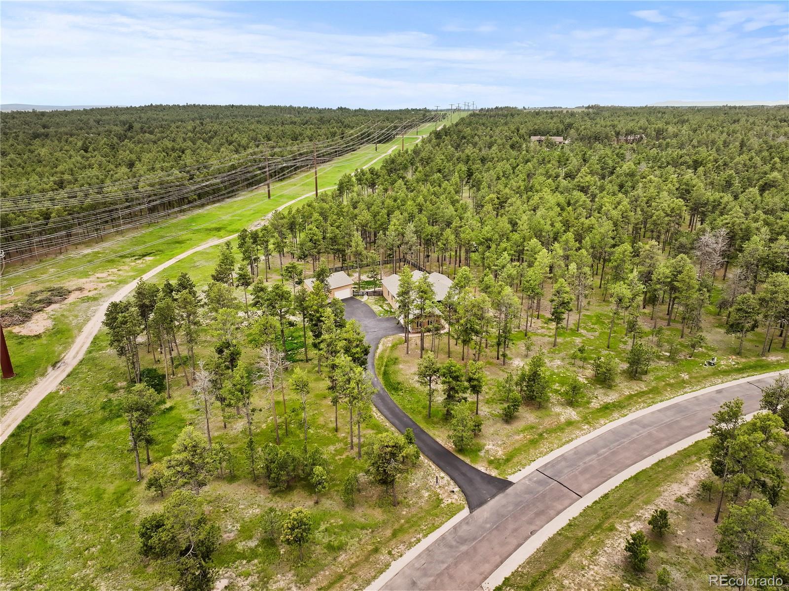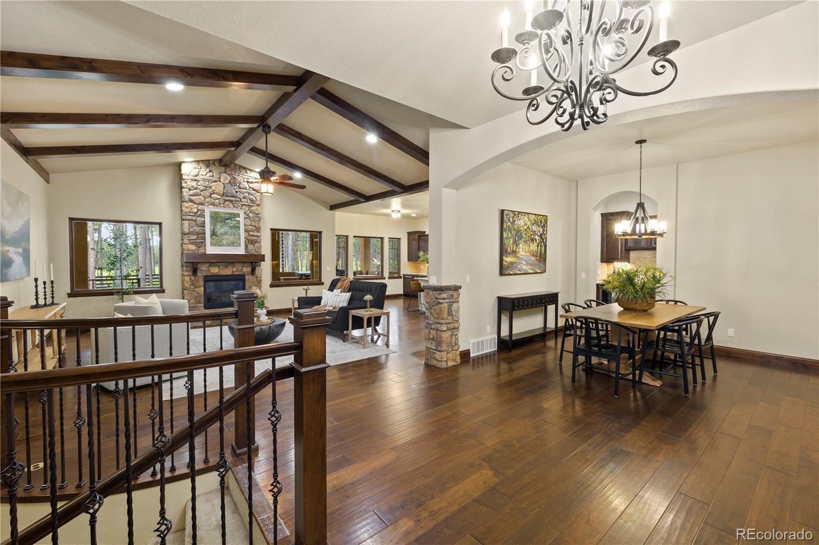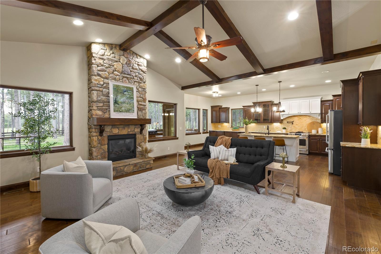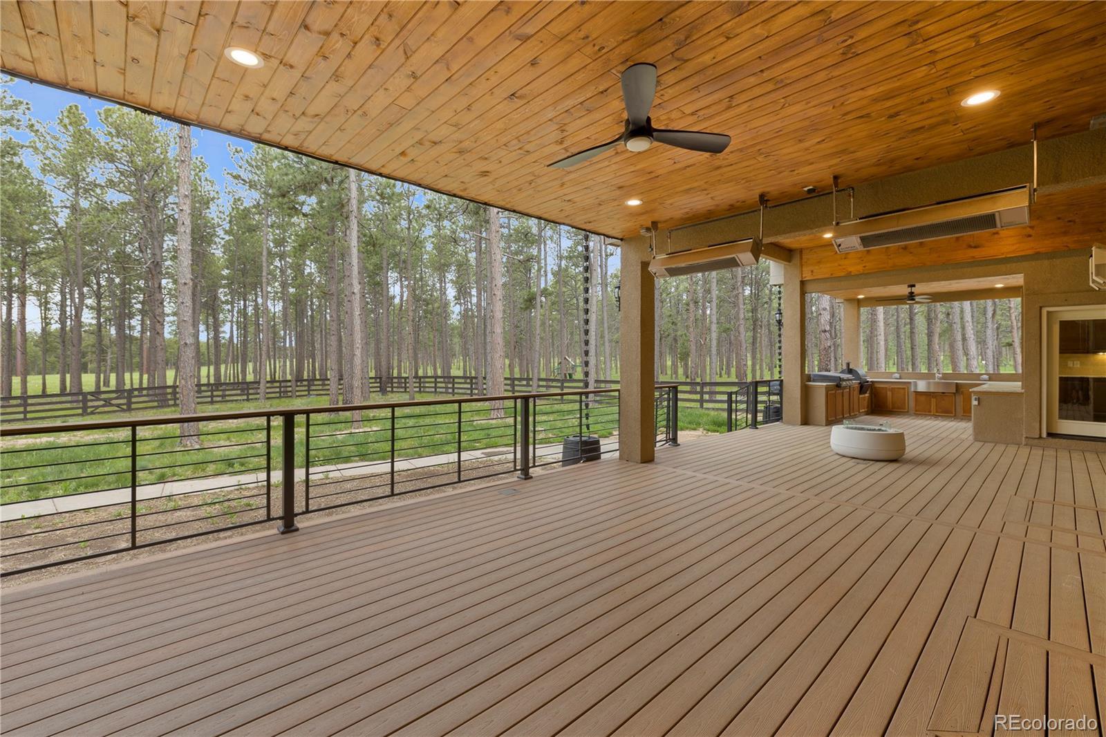 Privately situated on 2.75 acres in the gated Black Forest Reserve, this custom ranch-style home blends refined design with peaceful, wooded surroundings. The main level welcomes you with a spacious great room featuring vaulted, beamed ceilings and a striking floor-to-ceiling stone fireplace. The gourmet kitchen offers high-end GE Café appliances, a 6-burner gas range with griddle, double ovens, butler’s pantry with wine cooler, granite countertops, and custom cabinetry with soft-close drawers and elegant crown molding. The primary suite is a serene escape with a spa-inspired five-piece bath, shower w/ dual shower heads, an oversized walk-in closet with built-ins, and a separate sitting area. Two spacious bedrooms with built-in shelving & a full bathroom complete the main level. The finished basement expands the living space with a full wet bar, large family room with fireplace, theater space, and two additional bedrooms—one featuring a junior suite with jetted tub and walk-in closet, plus a full bath shared by the others. Rich knotty alder doors, curved iron staircase, hand-selected stone tile, and designer lighting add warmth and character throughout. Step outside to the expansive covered deck designed for year-round outdoor living, complete with tongue and groove wood ceiling, built in gas fire-pit, heaters, & outdoor TV. Surrounded by forest views and backing to open space you can enjoy the full outdoor kitchen w/ built-in Traeger pellet smoking grill, Blackstone cooktop, stainless steel sink, & granite countertops. A finished attached garage is complemented by a detached heated oversized 3-car garage with workshop space. Recent updates include a new roof in 2020, water heater in 2022, & Tesla car charger installed in the garage. A rare blend of luxury, privacy, and nature — minutes from schools, shopping, parks, and the best of Colorado Springs.
