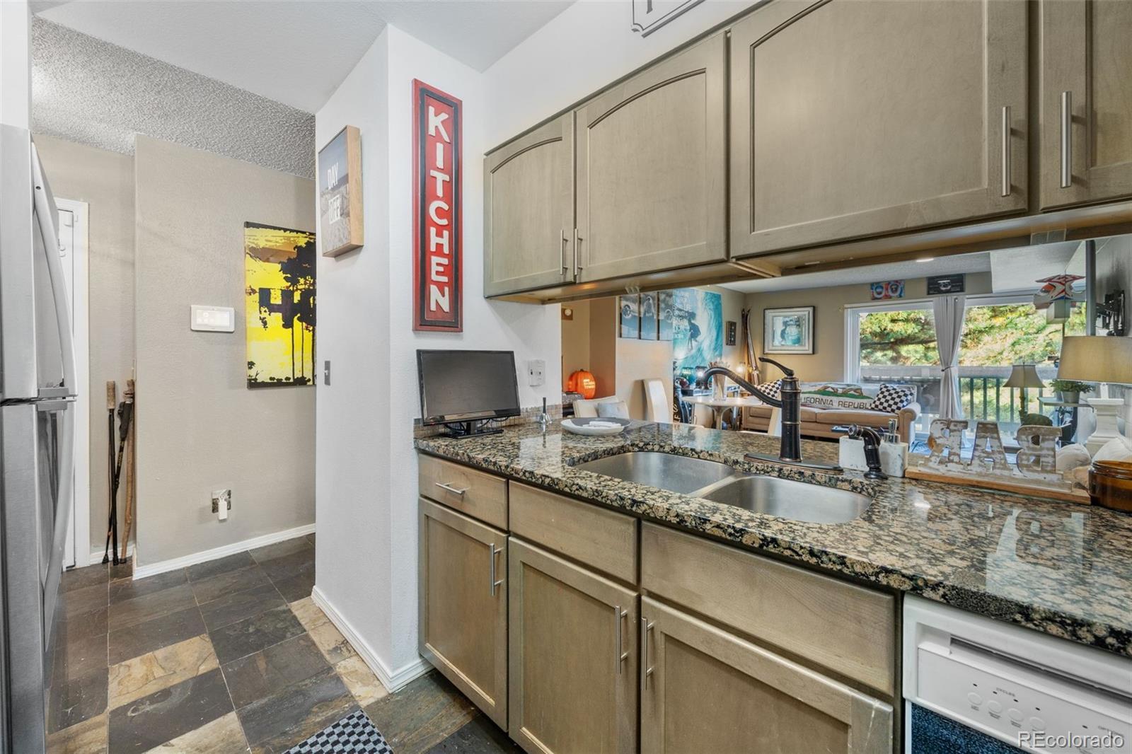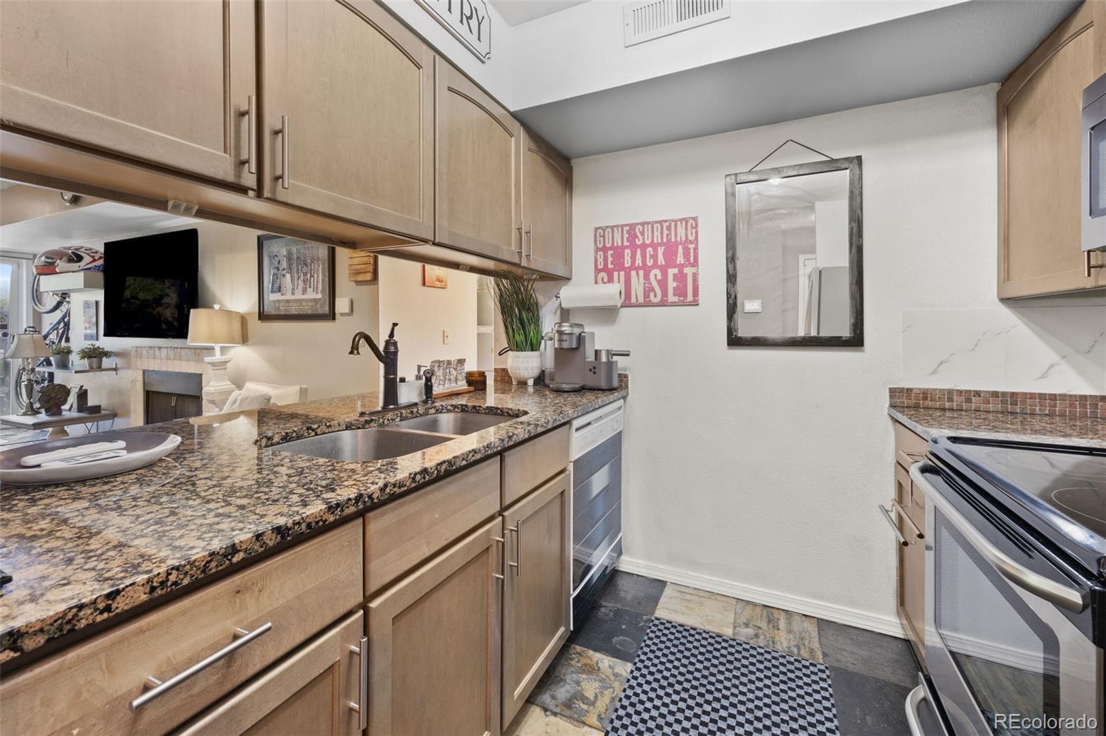 ASSUMABLE VA loan at 3.25%!! Updated two bed two bath in prime DTC location! Beautiful kitchen remodeled with slate tile floors, granite counters, newer cabinets and handles, Stainless fridge, microwave, oven. Bathrooms have been updated with attractive tile, glass shower door, fixtures, mirrors, and lighting. Upgraded 6 panel doors, newer lighting, and fresh paint compliment the cosmetics, plus newer Goodman furnace and 2 year old water heater for low maintenance living. The bedrooms have great closet space and the primary fits a king sized bed easily! W/D included! Gas fireplace, and a balcony shaded by tress for enjoying outside seating! Top floor unit - no noise from above you! Underground heated garage parking secures your vehicle, and the community features a wonderful pool and playground for outdoor fun! Elevator access from garage to unit floor. The HOA has a new management company and is much improved with maintenance and cosmetic updating underway in the community. The unit has TWO parking spaces side by side - rare! The location couldn't be better, surrounded by shopping and dining on Arapahoe Road, and perfectly situated between DTC and Park Meadows, blocks from the highway for easy access to downtown or DIA. Assumable balance on the loan is high, thereby reducing cash needed from a buyer, making this a great opportunity to buy at today's reduced prices with 2021's lower interest rates! Call for details!