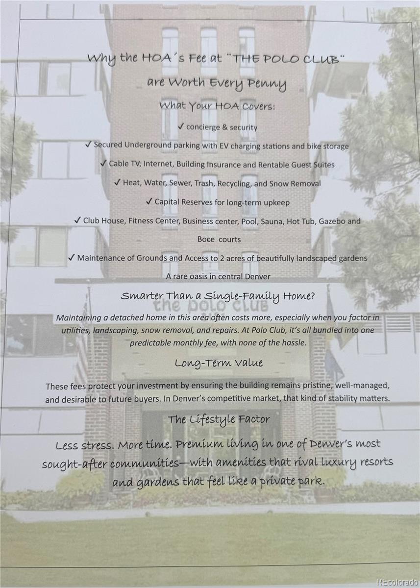 This upper floor condo in one of Denver’s most historic condo buildings features 1,488 square feet of living space, two bedrooms, two bathrooms, a large great room, and an enclosed lanai that provides unobstructed views of the mountains and downtown Denver. The kitchen is equipped with a newer refrigerator, stove, microwave and dishwasher, ensuring convenience and functionality, while the large primary bedroom includes a double vanity. Recent upgrades include a new air conditioning system and new light fixtures, enhancing the modern and comfortable living experience. The property provides ample storage space and easy access to the Cherry Creek Trail, offering residents the opportunity to enjoy the outdoors and explore the nearby wonderful restaurants, entertainment, and shopping options in the Cherry Creek/Belcaro neighborhood. The community amenities are impressive, including an expansive multi-acre enclosed backyard that includes a patio, gazebo, and putting green, as well as beautiful gardens and paths. Inside amenities include an indoor swimming pool, hot tub, newly updated workout/exercise room, 6am to 10pm onsite security and underground parking. Residents can also take advantage of the recently remodeled meeting and community rooms, fostering a sense of community and providing opportunities for social engagement. In addition, the building is about to begin a complete renovation of the impressive atrium area. With the growth of Cherry Creek North, development of the nearby Glendale entertainment complex, and continued updates to the building, now is the perfect time to invest in a home in the Polo Club. Whether as your primary home or as a second home for out of state residents, the Polo Club offers the best in safe, accessible, urban living.