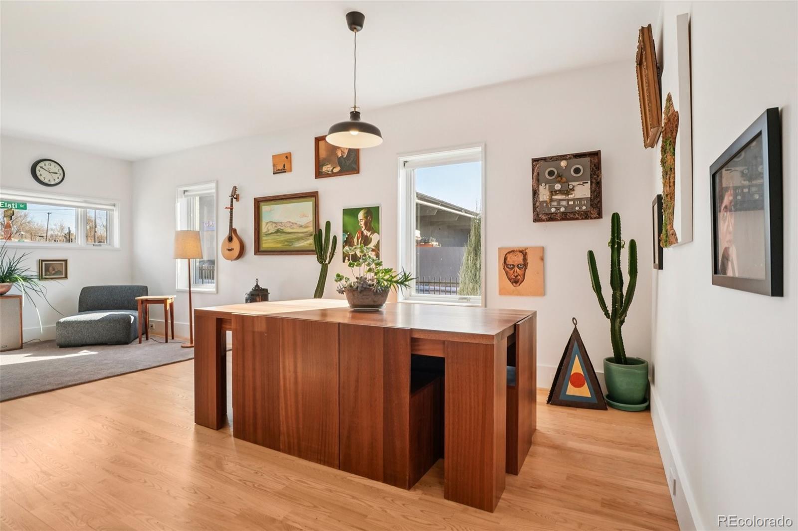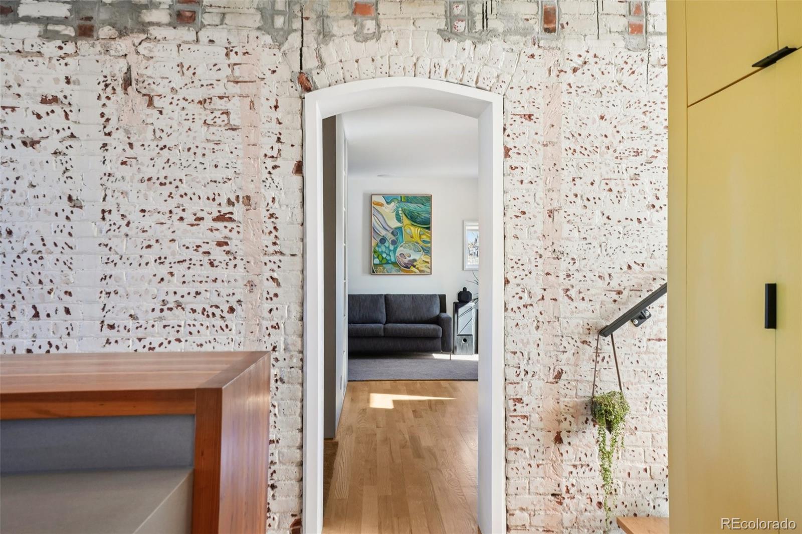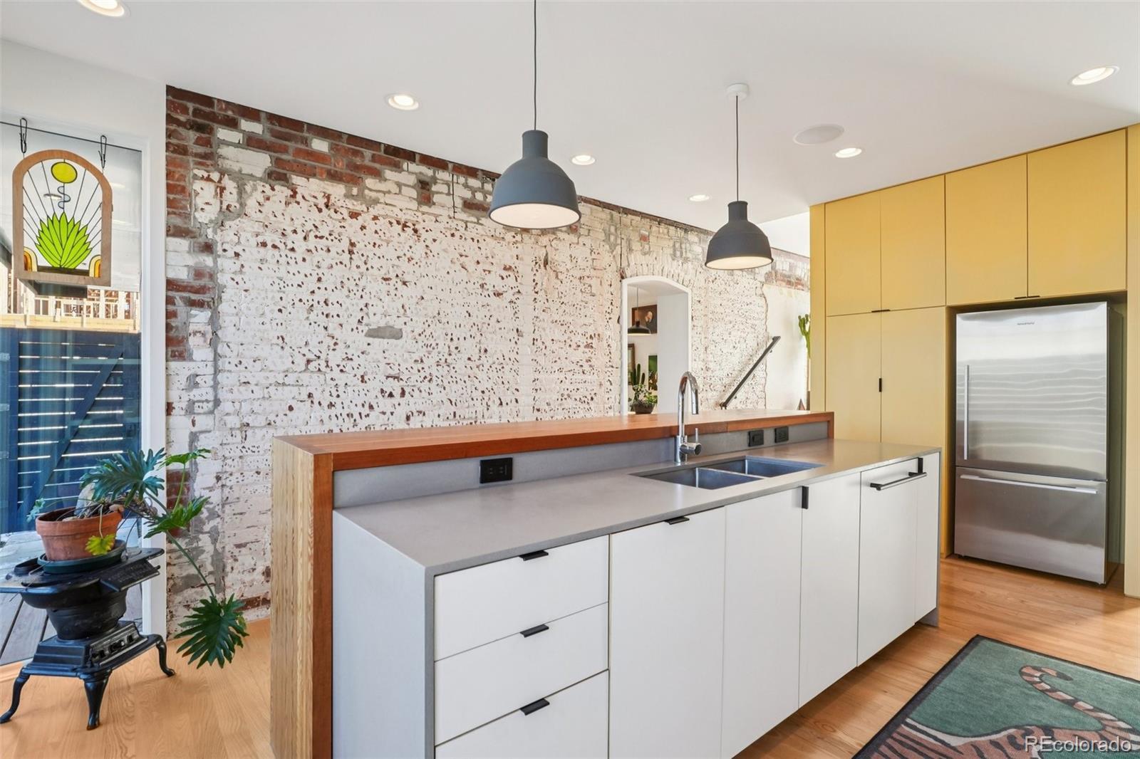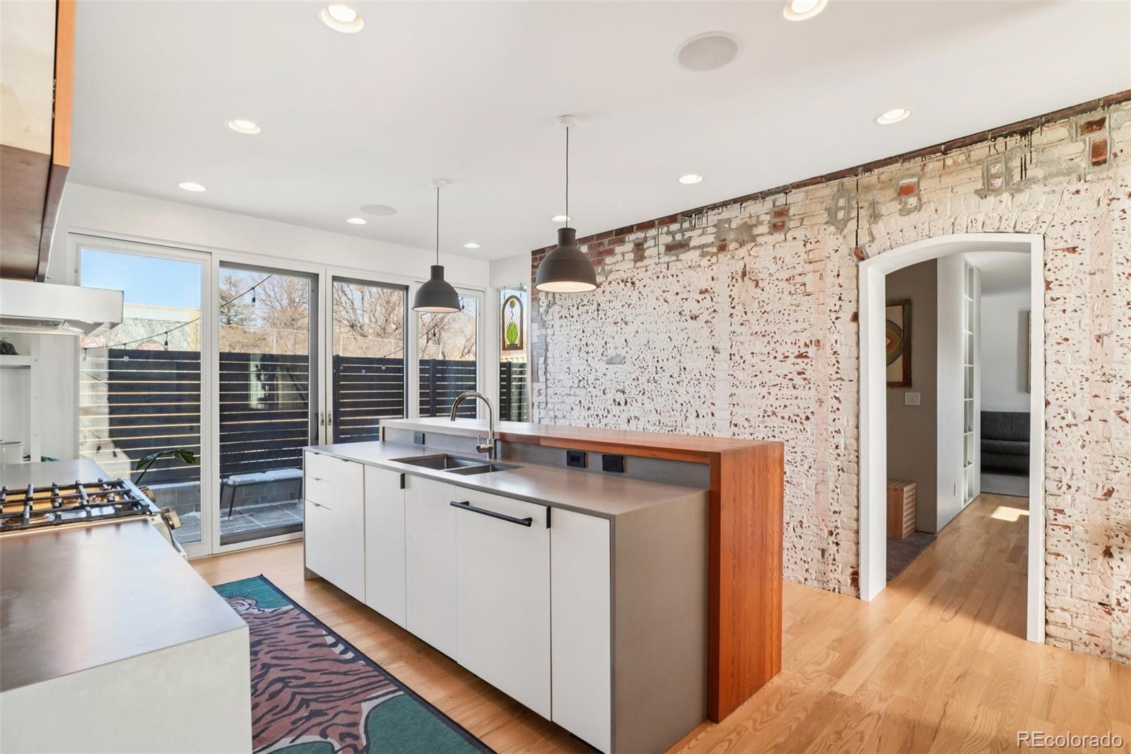 Designed by acclaimed architects Tabula Studio, this two-story Baker showstopper seamlessly blends historic roots with striking modern architecture. Originally built on its 1895 foundation, the home was completely reimagined in 2016 with the addition of a second story and a full contemporary remodel, resulting in a one-of-a-kind residence that feels as much like an art gallery as it does a home. Enter from the north side into a calm, light-filled main level where smooth finished walls and thoughtful spatial design create a quiet retreat—despite being in the heart of one of Denver’s most vibrant urban neighborhoods. The main floor hosts all primary living spaces, including the living room, dining area, kitchen, entry, and powder bath. Exposed brick in the kitchen nods to the home’s historic past, while abundant natural light and passive solar design (polycarbonate wall system) —most notably along the single stringer staircase which anchors the modern aesthetic. Solid ash hardwood floors run throughout, complemented by custom poplar trim and a striking built-in entertainment center. The gourmet kitchen is a true centerpiece, showcasing a Douglas fir butcher-block island with vintage diner stools (included), caesarstone countertops, and high-end designer appliances. Upstairs, you’ll find a serene primary suite, two additional bedrooms, a stylish main bath, and laundry. Custom Douglas fir vanities, quartz countertops, and upgraded fixtures reflect the home’s meticulous attention to detail. With over 2,108 square feet, a private xeriscaped yard, and an unbeatable Baker location just steps from light rail, coffee shops, restaurants, bars, parks, and shopping, this is a rare lifestyle home for buyers seeking inspired design, craftsmanship, and urban energy—all in one exceptional property.The property is zoned I-MX-5 (Industrial Mixed-Use), a highly flexible designation. Low maintenance exterior of brick and corten steel.