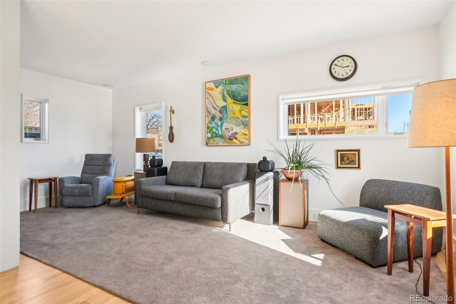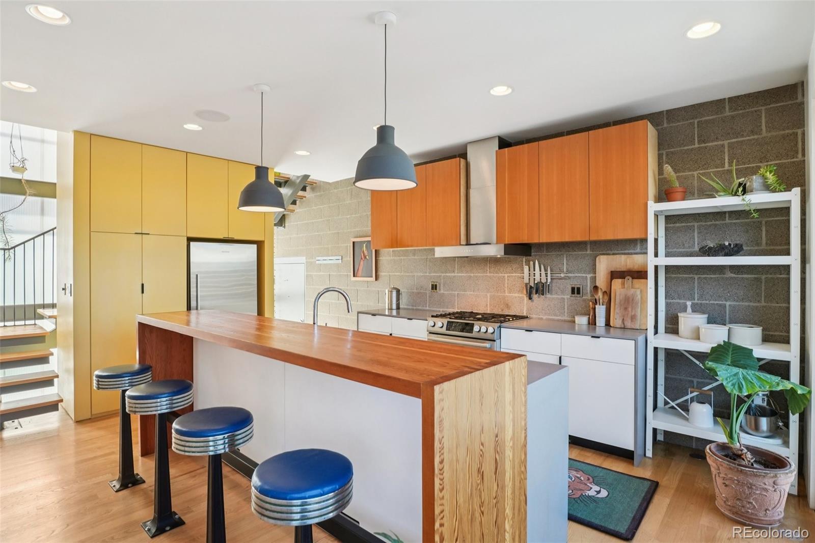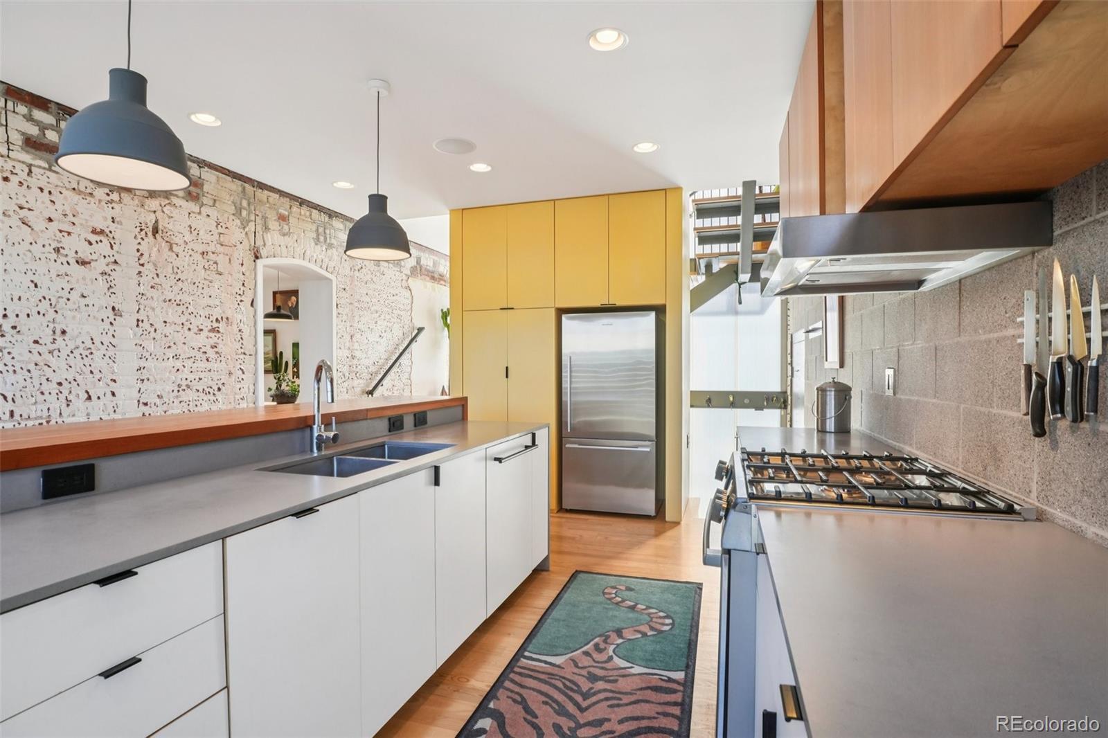 Designed by acclaimed architects Tabula Studio, this two-story Baker showstopper seamlessly blends historic roots with striking modern architecture. Originally built on its 1895 foundation, the home was completely reimagined in 2016 with the addition of a second story and a full contemporary remodel, resulting in a one-of-a-kind residence that feels as much like an art gallery as it does a home. Enter from the north side into a calm, light-filled main level where smooth finished walls and thoughtful spatial design create a quiet retreat—despite being in the heart of one of Denver’s most vibrant urban neighborhoods. The main floor hosts all primary living spaces, including the living room, dining area, kitchen, entry, and powder bath. Exposed brick in the kitchen nods to the home’s historic past, while abundant natural light and passive solar design (polycarbonate wall system) —most notably along the single stringer staircase which anchors the modern aesthetic. Solid ash hardwood floors run throughout, complemented by custom poplar trim and a striking built-in entertainment center. The gourmet kitchen is a true centerpiece, showcasing a Douglas fir butcher-block island with vintage diner stools (included), caesarstone countertops, and high-end designer appliances. Upstairs, you’ll find a serene primary suite, two additional bedrooms, a stylish main bath, and laundry. Custom Douglas fir vanities, quartz countertops, and upgraded fixtures reflect the home’s meticulous attention to detail. With over 2,108 square feet, a private xeriscaped yard, and an unbeatable Baker location just steps from light rail, coffee shops, restaurants, bars, parks, and shopping, this is a rare lifestyle home for buyers seeking inspired design, craftsmanship, and urban energy—all in one exceptional property.The property is zoned I-MX-5 (Industrial Mixed-Use), a highly flexible designation. Low maintenance exterior of brick and corten steel.
