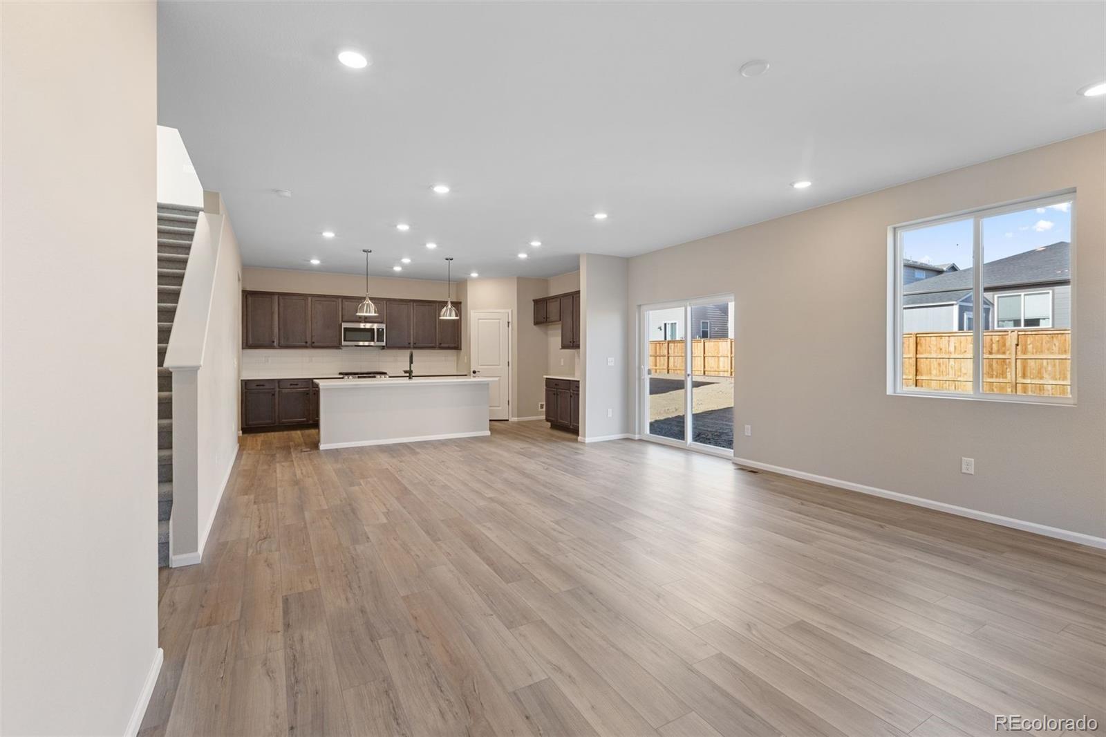 This thoughtfully designed 4-bedroom, 3-bath home offers the perfect blend of style and versatility. A main floor bedroom and full bath provide an ideal setup for guests, multi-generational living, or a private home office. The chef-inspired kitchen showcases Mastercraft 36" upper cabinets, sleek quartz countertops, a full subway tile backsplash, and stainless steel appliances including a gas range. The open-concept layout flows seamlessly into the living and dining areas—perfect for everyday living and entertaining. A built-in bench in the mudroom and central A/C add comfort and convenience. Upstairs, the spacious primary suite features dual sinks and a well-appointed layout. An oversized 2-car garage with an 8’ door offers generous space for vehicles, storage, or hobbies. Enjoy the benefits of a low $85/month Metro District fee, which covers trash/recycling and maintenance of beautifully kept common areas. The community park includes a playground, swings, shaded seating areas, BBQ grills, picnic tables, expansive green space, walking paths, benches, and dog stations—perfect for both relaxing and staying active. Don't miss your chance to own this modern, move-in-ready home in a vibrant and amenity-rich neighborhood!