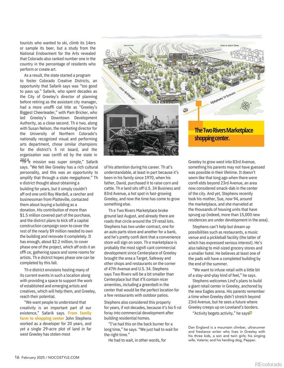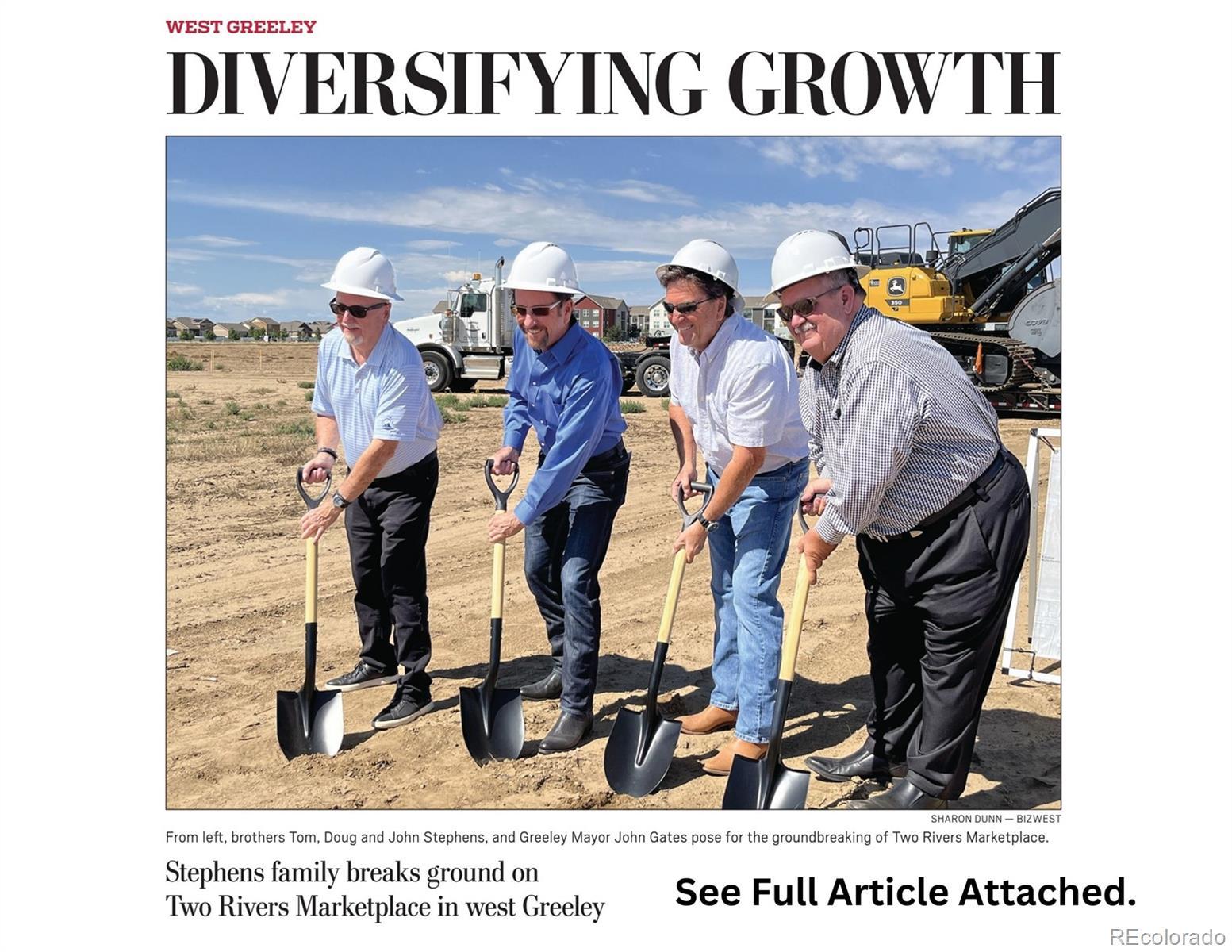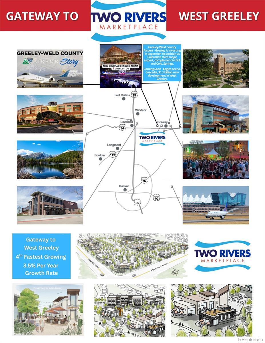 LOT 15 - PERFECT 40,000 SQ. FT. GROCER OR BIG BOX IN STRONG, QUICKLY EXPANDING WEST GREELEY. TWO RIVERS MARKETPLACE IS AT THE GATEWAY. UP & COMING DYNAMIC COMMERCIAL COMMUNITY ON THE HIGHWAY (East/West Corridor into Greeley) AND 83RD (Key North/South Transportation Corridor). Perfect for Grocer with 40,000 sq. ft. on 3.39 acre/147,494 sq. ft. Lot. Ease of Access and Interconnection to the entire commercial community, restaurants and hotel. So Much Residential Growth - Huge Need for Commercial Businesses. Eleven (11) Highway and 83rd Lots are designed for "Quick and Easy Access" with 10 Lots with DRIVE THRUS. CENTER CORE is envisioned for "Stay and Play" features with Hotel, Grocer, Brew Pubs, Restaurants. Restaurants encouraged to emphasize Rooftop decks with mountain views and east Facing Outdoor Patios on permanent open space with community features. The highway generates approx. 25,000 cars per day and growing. The site is surrounded by existing single family and multifamily developments, and many new large scale residential developments under way - approx. 15,000 new homes on their way. The property totals 29 acres and is zoned C-H, Commercial High. Grocer/Big Box will have many easy Access Points: 86th Ave., 12th/83rd. Roundabout, and New 11th Street. The entire loop road and 11th Street will be completed in 2024 - allowing opportunities for Center Core Lots in Spring/Summer 2025. City of Greeley is development friendly and encourages end user submittals early on for quicker development turnarounds. Please contact listing agents for more details. Co-Listed with Brad Pech, RE/MAX Commercial, 303-504-3444.
