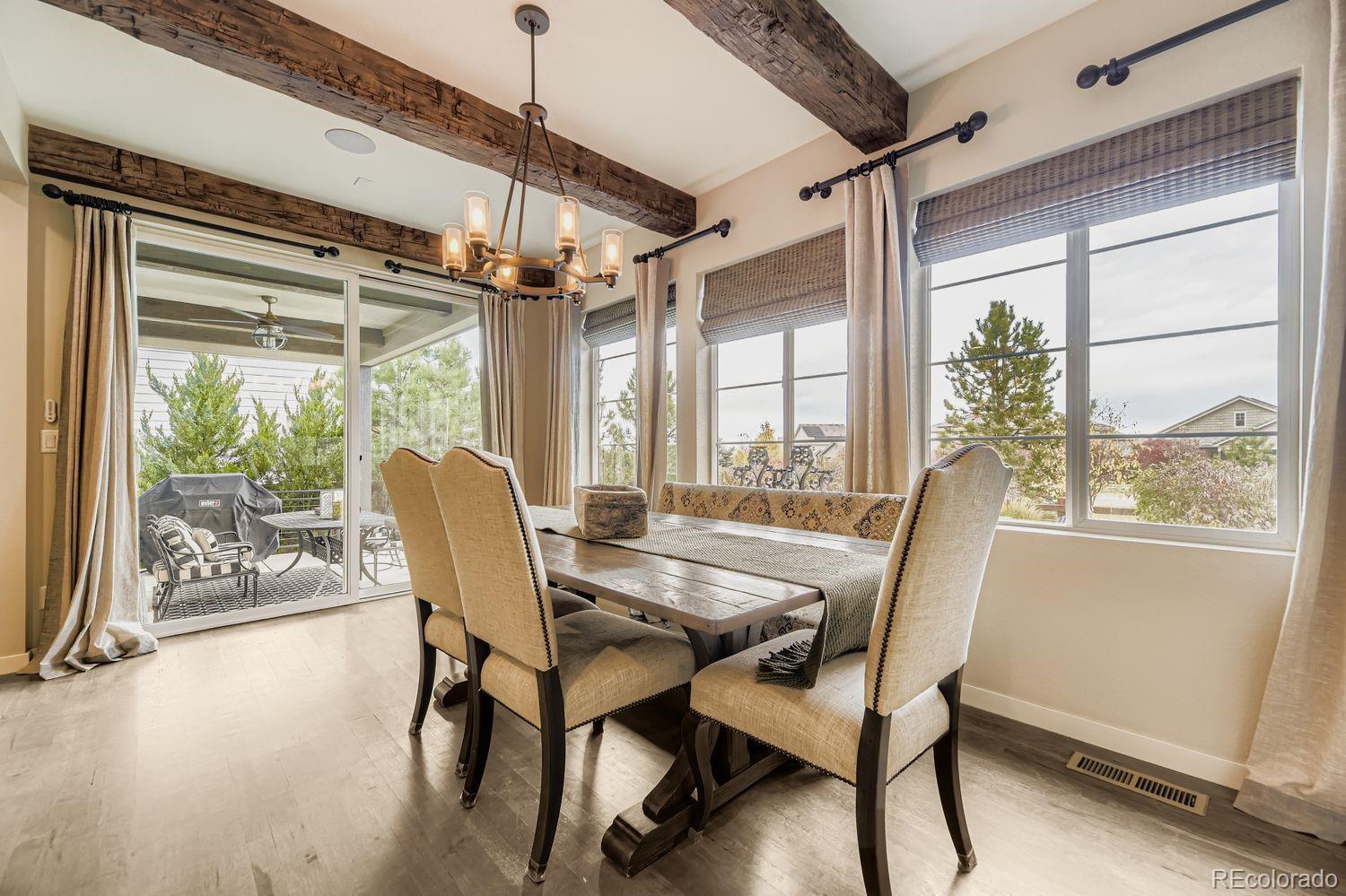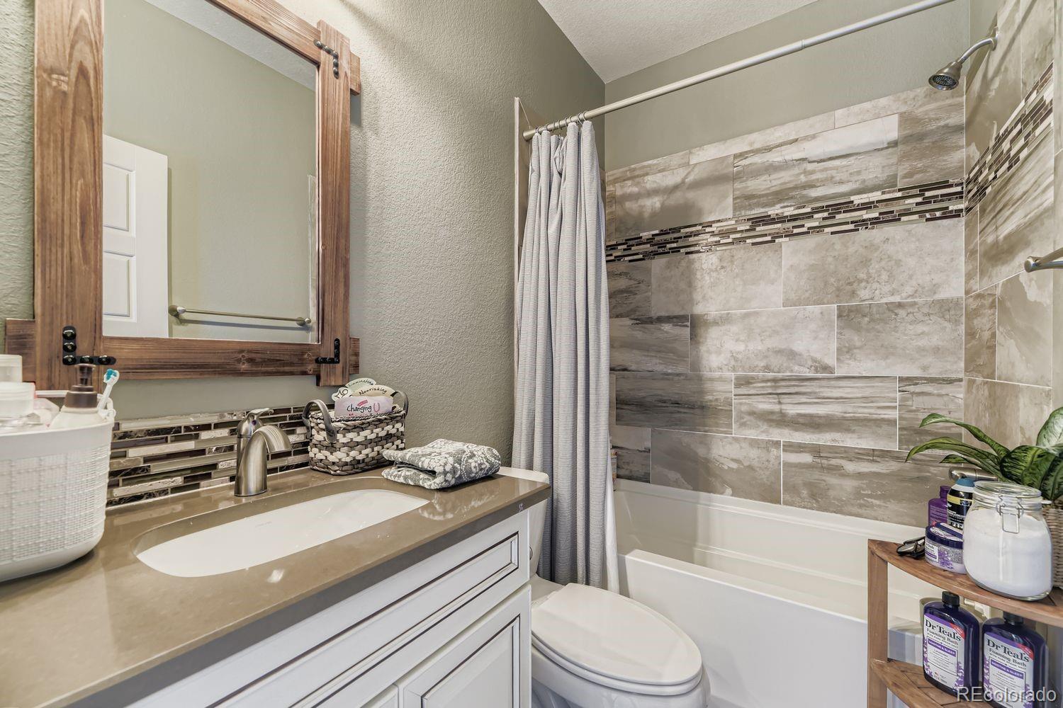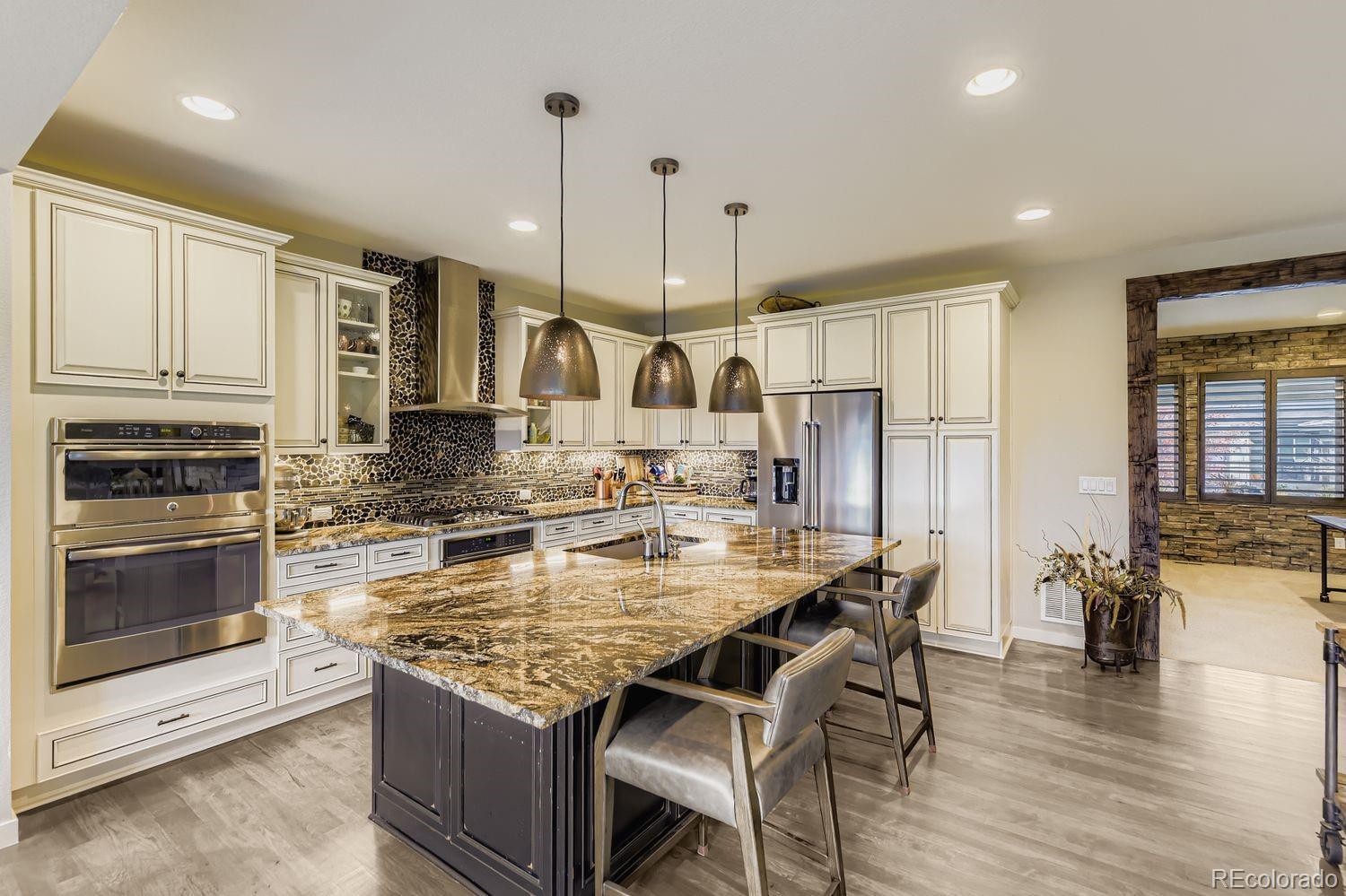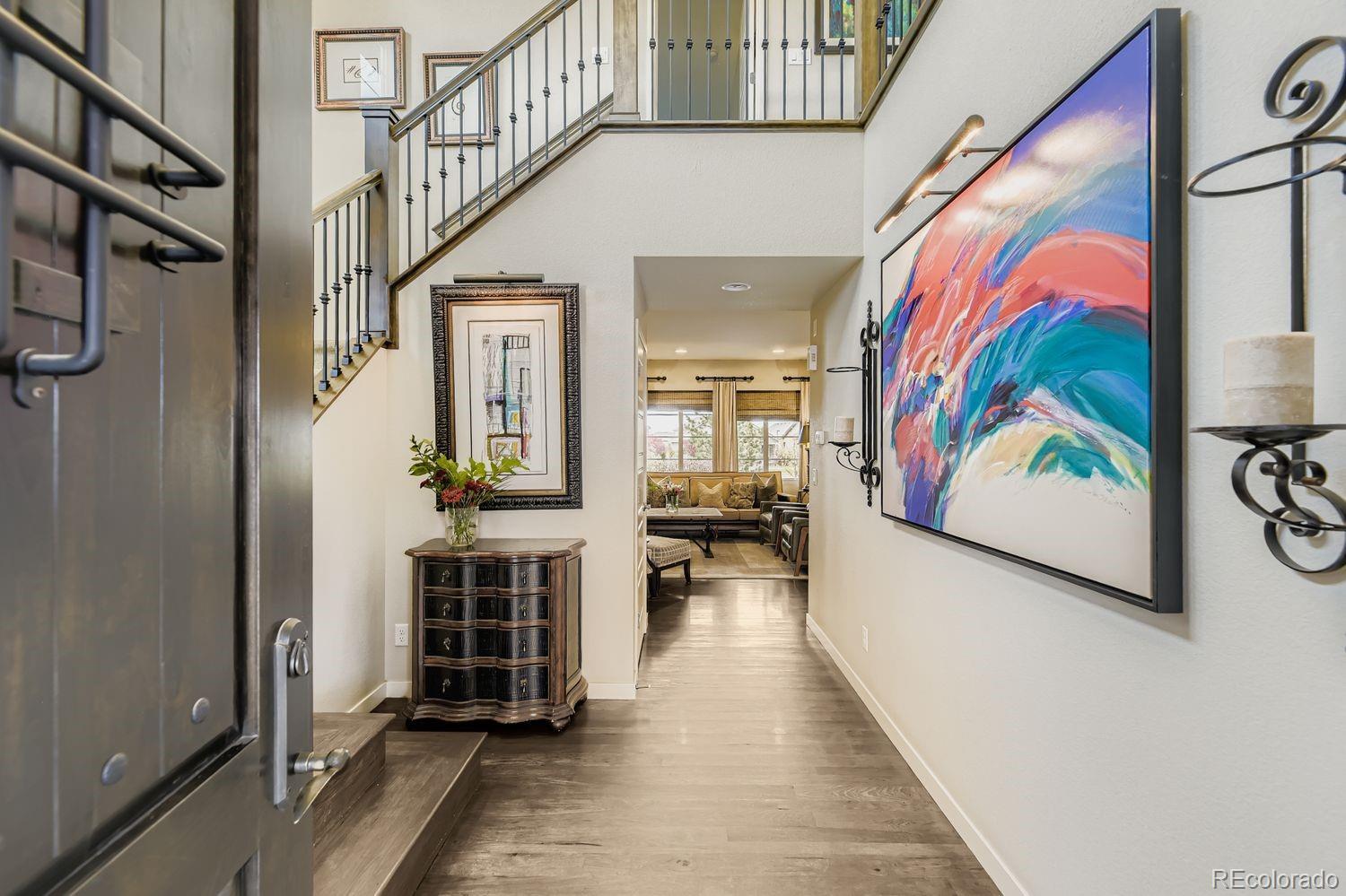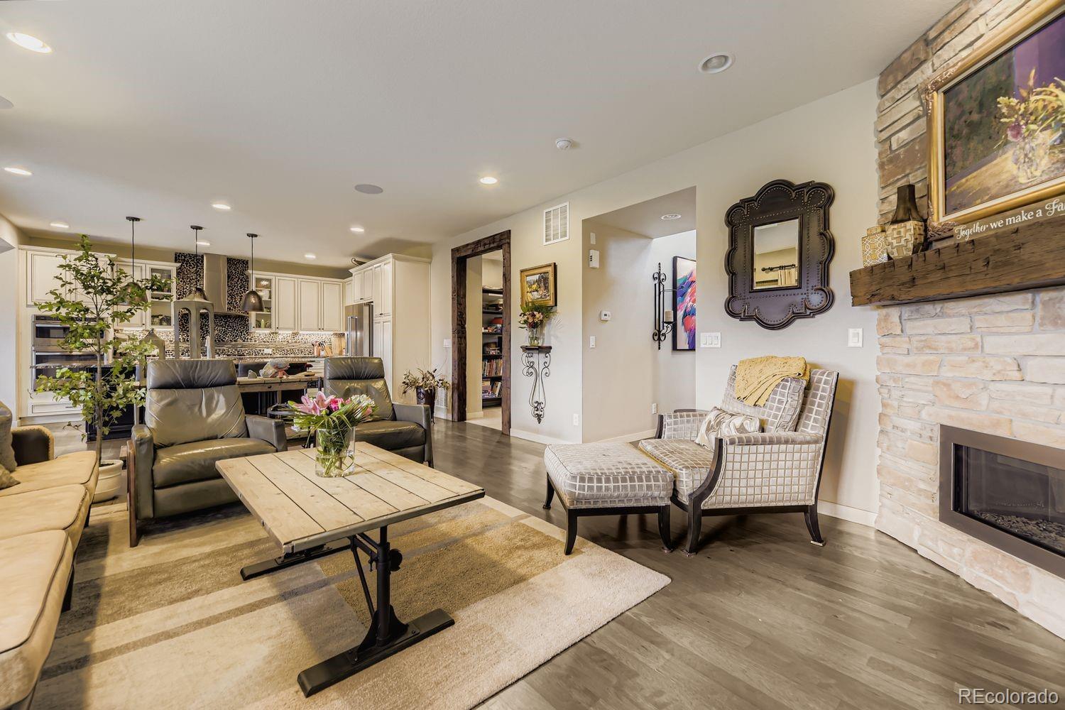 Nestled in the acclaimed Stepping Stone community of Parker, CO, this remarkable 2-Story, 3 Bedroom, 5 bath residence has over 3,800 finished sq ft and offers a unique blend of mountain-inspired warmth & sophisticated modern design. OVER $170K IN UPGRADES SINCE ORIGINALLY BUILT IN 2015! The moment you enter through the custom main wood entry door w/speak-easy, everywhere you turn reveals another level of thoughtful detail: Expansive Hardwood Floors on the main level, Gallery Lighting for artwork in the foyer, custom window treatments and Hunter Douglas wood shutters throughout and stone accent walls on all 3 levels plus much more! The heart of the main level is the chef’s kitchen with slab granite countertops, full backsplash, expansive island, custom pendants & undercabinet lighting & stainless steel appliances (Including a brand new Bosch dishwasher). Merillat Masterpiece cabinets complete the kitchen and throughout the home. Even the pantry is custom! Roughhewn reclaimed wood beams adorn the ceiling in the dining room and back patio. The family room is anchored by a gas fireplace set into a stone accent wall with a massive, reclaimed wood mantle! The primary bedroom upstairs is spacious and includes a luxurious oversized shower, dual vanities and custom walk-in closet. Enjoy 2 additional bedrooms, each with private, en-suite baths and a loft area plus a convenient upstairs laundry with extra cabinet space & LG Washer/Dryer set included! The basement has over 1000 finished sq ft with an entertainment space (Included 65” TV), large multi-use rec. space, hobby area with custom cabinets and an additional ¾ bathroom. Thoughtful pre-planning allows a 4th Bedroom to be added easily! Entertain outdoors with a beautiful water feature, gas firepit, expanded patio, outdoor speakers and lighting and professional landscaping that has matured to create near total privacy! The 3-Car Tandem Garage has been insulated, textured and painted w/extensive shelving & epoxy flooring.