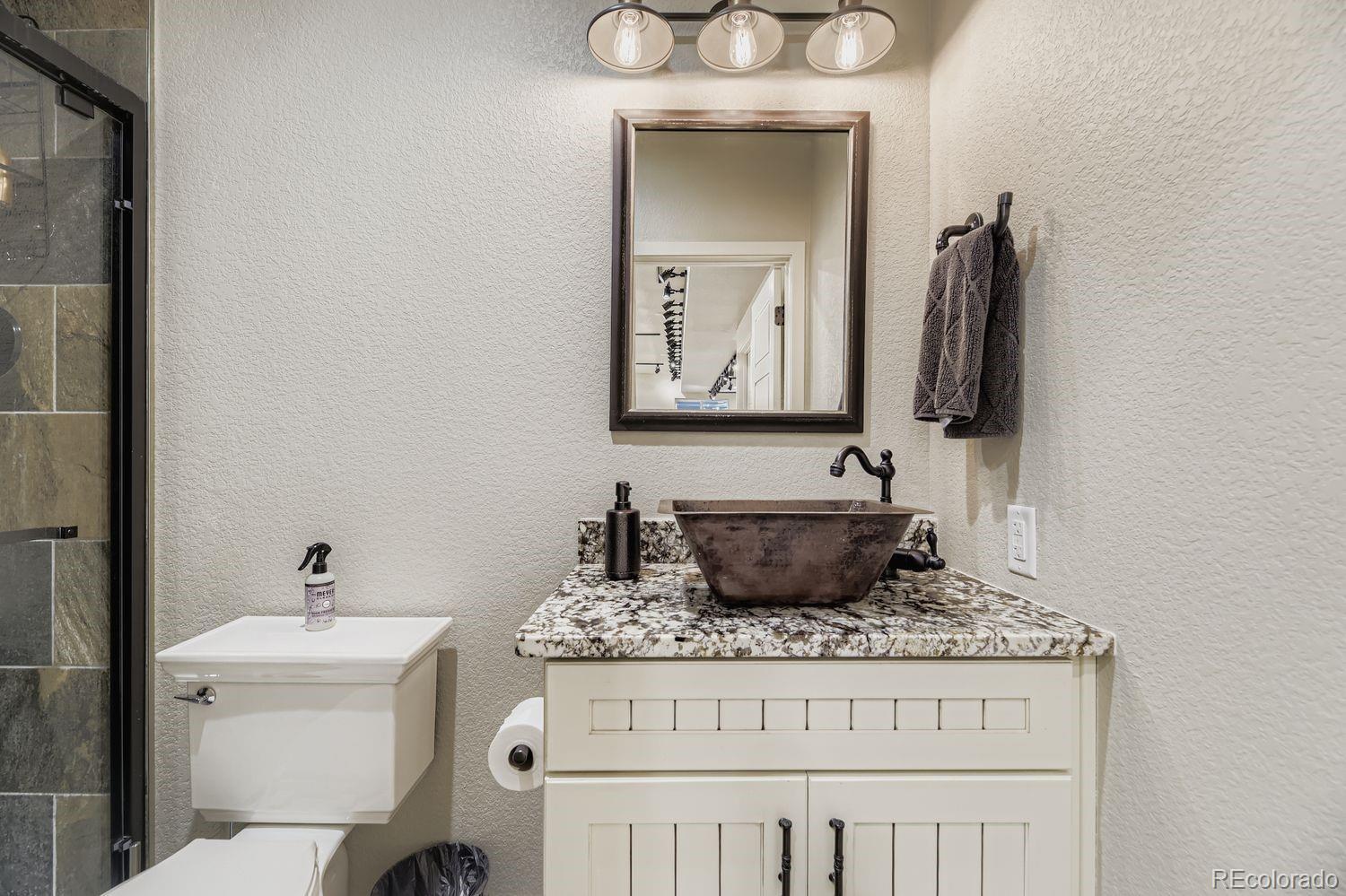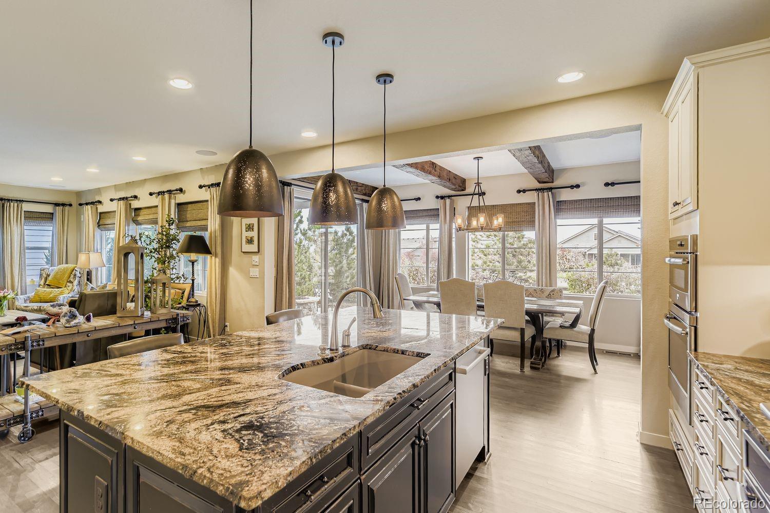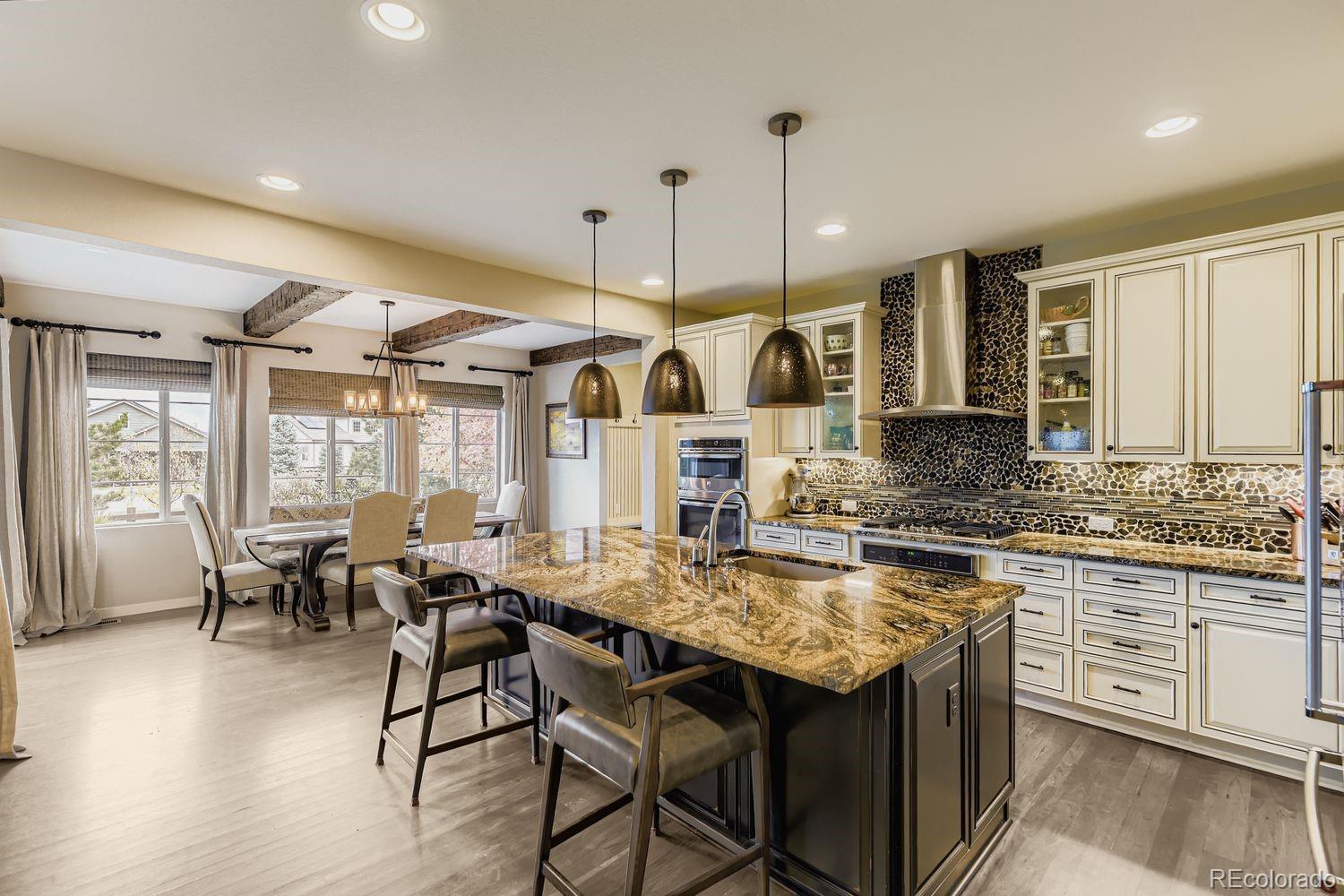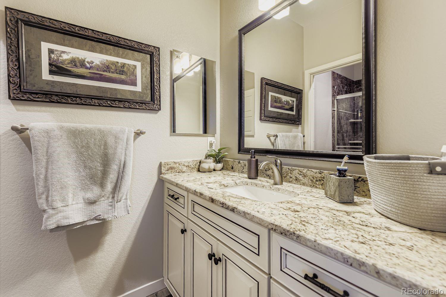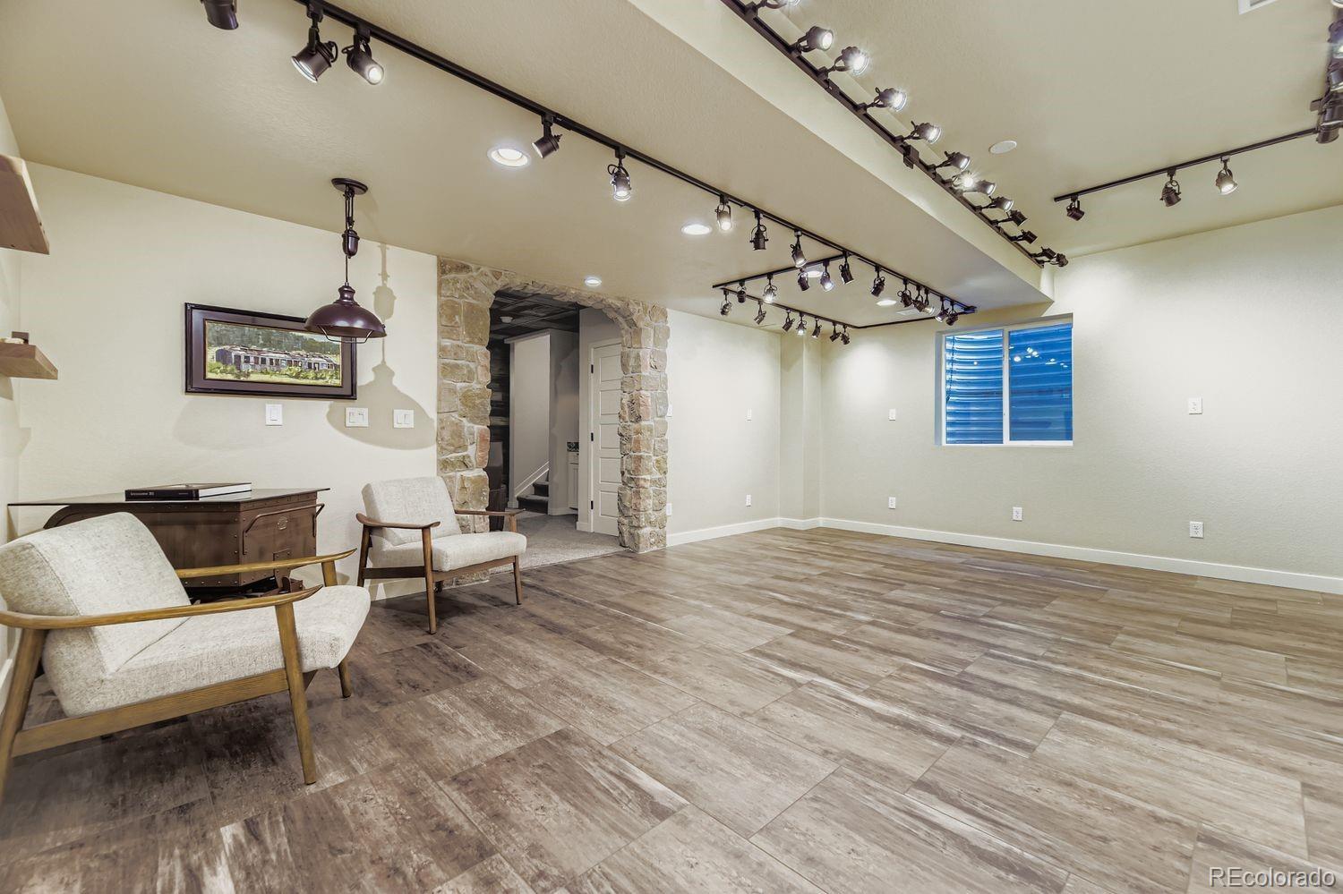 Nestled in the acclaimed Stepping Stone community of Parker, CO, this remarkable 2-Story, 3 Bedroom, 5 bath residence has over 3,800 finished sq ft and offers a unique blend of mountain-inspired warmth & sophisticated modern design. OVER $170K IN UPGRADES SINCE ORIGINALLY BUILT IN 2015! The moment you enter through the custom main wood entry door w/speak-easy, everywhere you turn reveals another level of thoughtful detail: Expansive Hardwood Floors on the main level, Gallery Lighting for artwork in the foyer, custom window treatments and Hunter Douglas wood shutters throughout and stone accent walls on all 3 levels plus much more! The heart of the main level is the chef’s kitchen with slab granite countertops, full backsplash, expansive island, custom pendants & undercabinet lighting & stainless steel appliances (Including a brand new Bosch dishwasher). Merillat Masterpiece cabinets complete the kitchen and throughout the home. Even the pantry is custom! Roughhewn reclaimed wood beams adorn the ceiling in the dining room and back patio. The family room is anchored by a gas fireplace set into a stone accent wall with a massive, reclaimed wood mantle! The primary bedroom upstairs is spacious and includes a luxurious oversized shower, dual vanities and custom walk-in closet. Enjoy 2 additional bedrooms, each with private, en-suite baths and a loft area plus a convenient upstairs laundry with extra cabinet space & LG Washer/Dryer set included! The basement has over 1000 finished sq ft with an entertainment space (Included 65” TV), large multi-use rec. space, hobby area with custom cabinets and an additional ¾ bathroom. Thoughtful pre-planning allows a 4th Bedroom to be added easily! Entertain outdoors with a beautiful water feature, gas firepit, expanded patio, outdoor speakers and lighting and professional landscaping that has matured to create near total privacy! The 3-Car Tandem Garage has been insulated, textured and painted w/extensive shelving & epoxy flooring.