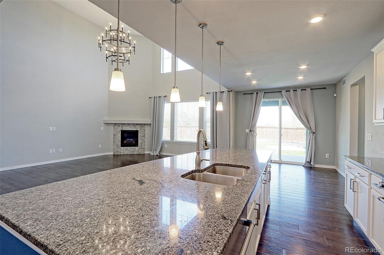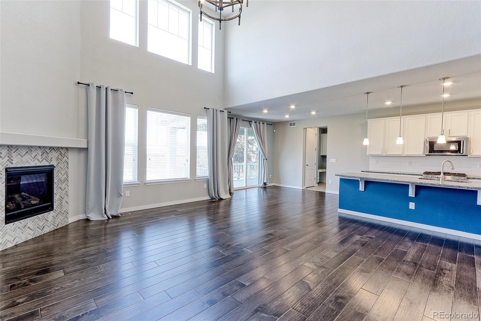 This former model home blends thoughtful design with stylish comfort, offering an open floor plan perfect for both everyday living and entertaining. The inviting family room features soaring vaulted ceilings, a cozy gas log fireplace, and dramatic floor-to-ceiling windows that fill the space with natural light. The gourmet kitchen is a chef’s dream with granite countertops, a gas stove, walk-in pantry, extensive cabinetry, a breakfast bar, and an adjoining dining area for seamless meals and gatherings. A main floor bedroom, full bath, and a custom study nook with built-ins add flexibility for guests, work, or hobbies. Downstairs, the fully finished basement expands your options with a spacious family room, wet bar, additional bedroom, and a dedicated workout or craft room. Retreat to the vaulted primary suite with a generous walk-in closet and a private five-piece bath. Outdoor living shines with an expansive deck and patios ideal for entertaining, a dedicated BBQ space. A 4-car attached garage offers exceptional storage and workspace. Enjoy engineered hardwood floors, stunning views of Longs Peak, and easy access to highways—everything you need for comfortable, convenient Colorado living.